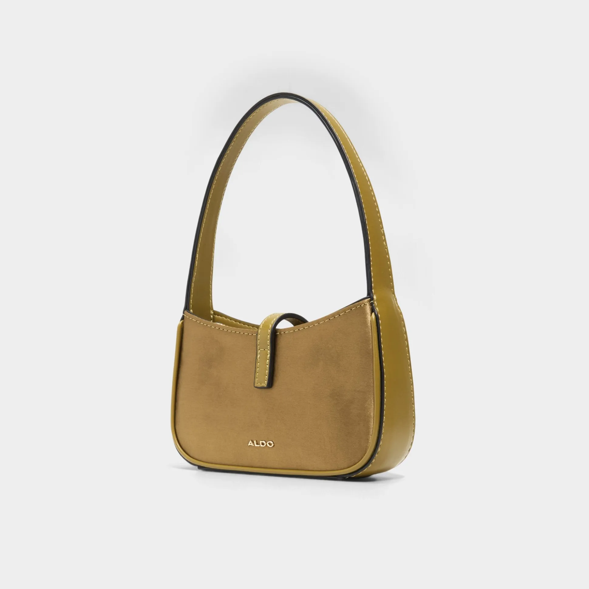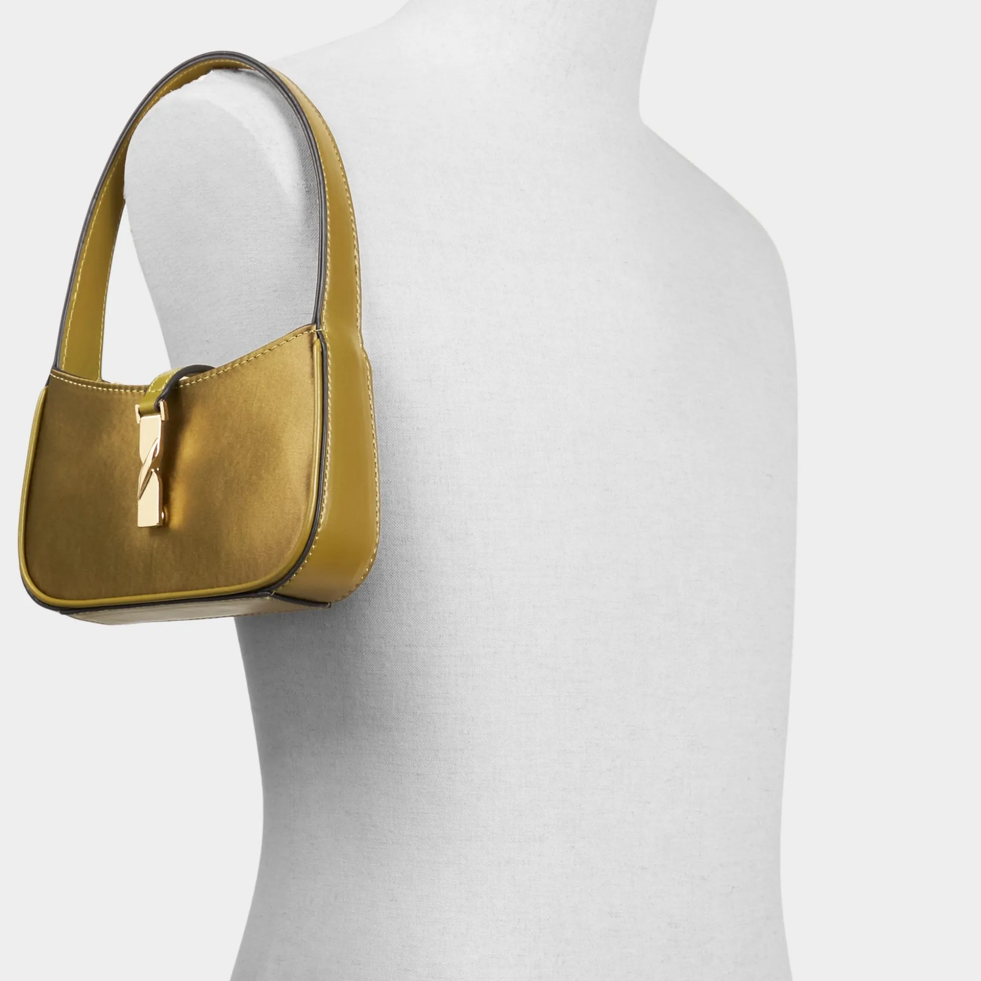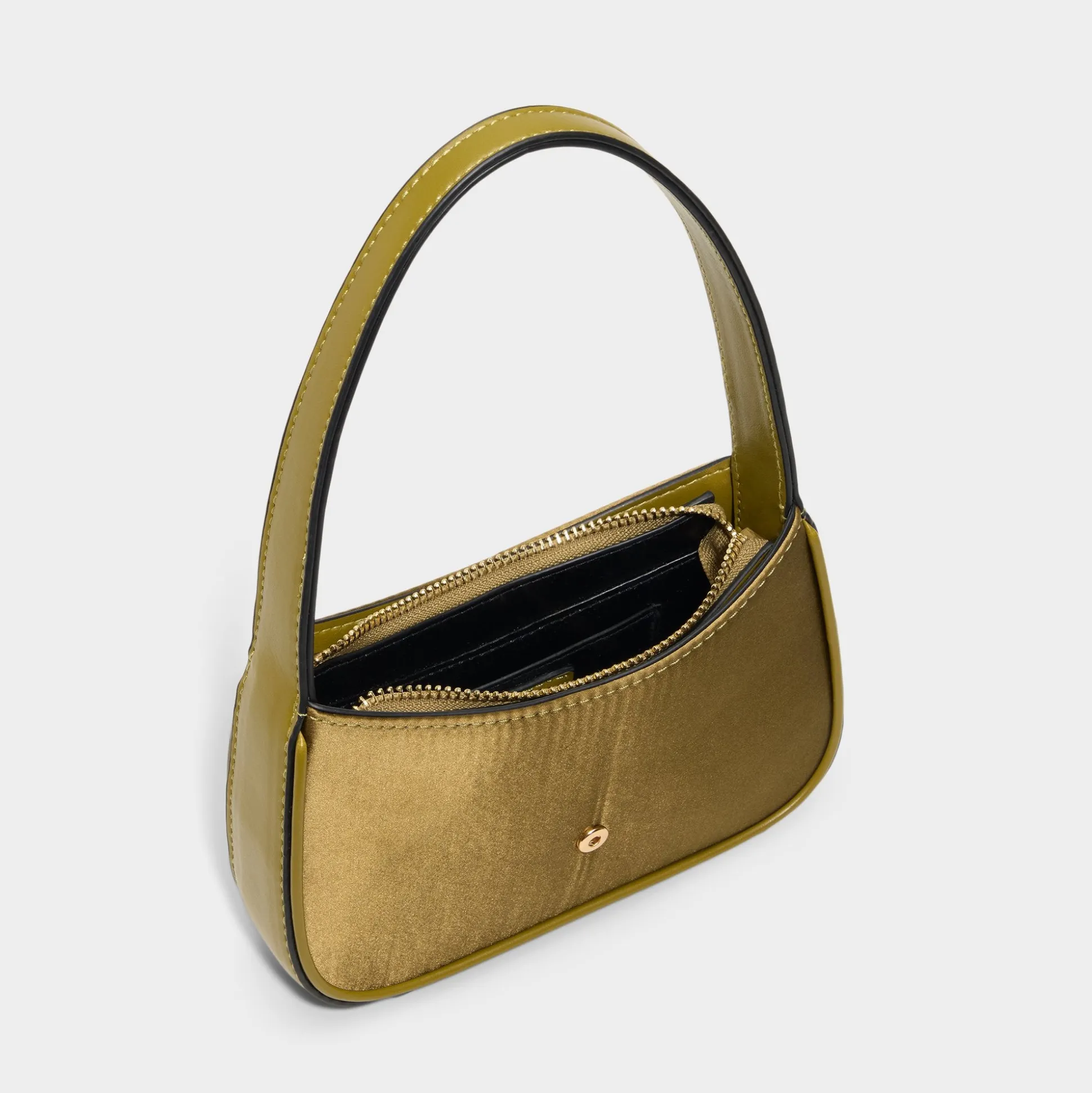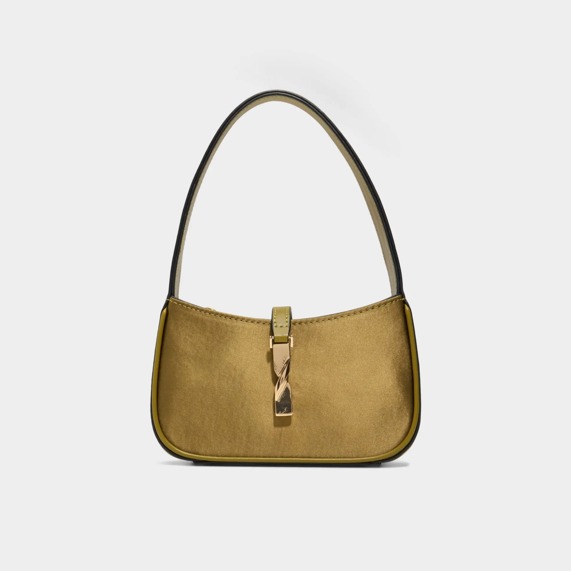 Olive-satin glow meets crisp 90s lines on this shouldered bag, featuring centered front-facing flips that lock into place for a clean, night-ready silhouette and a polished closure you can trust. Carry it with a linen dress for warm-weather evenings, or sling it over a biker jacket and jeans for city strolls.