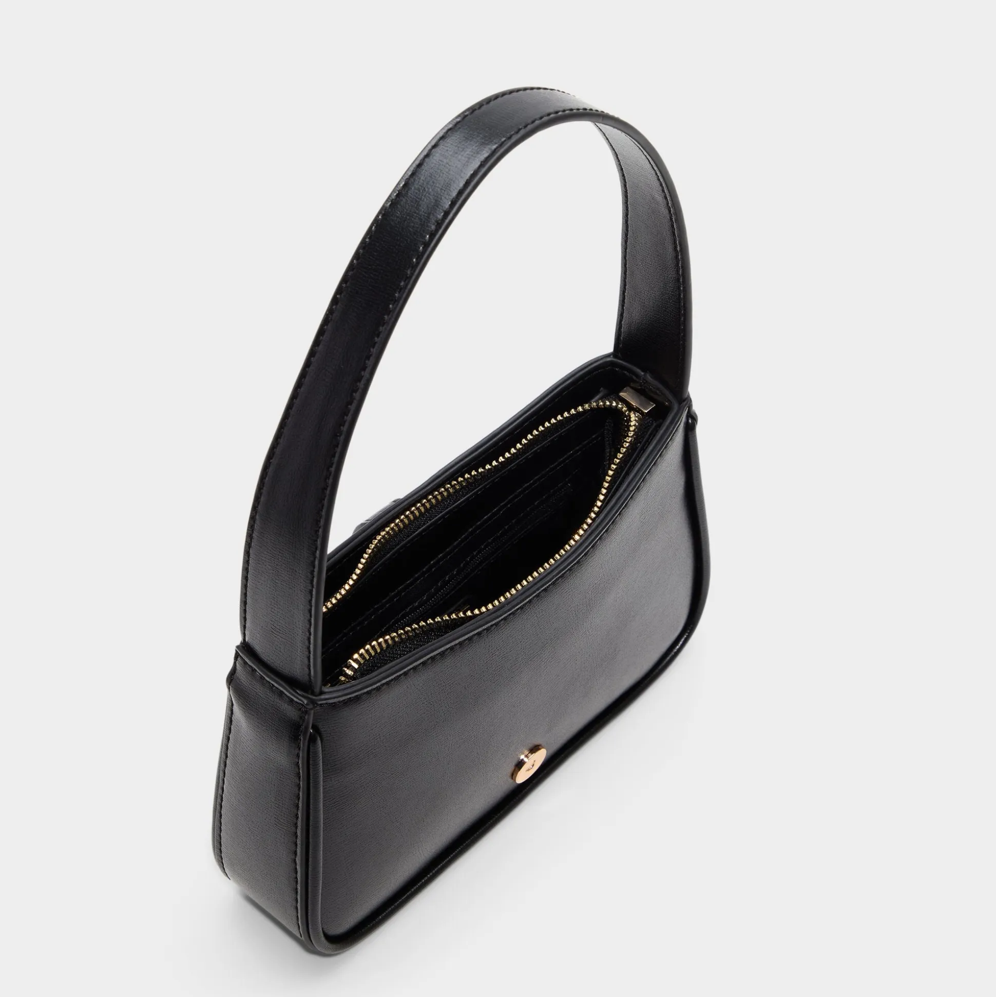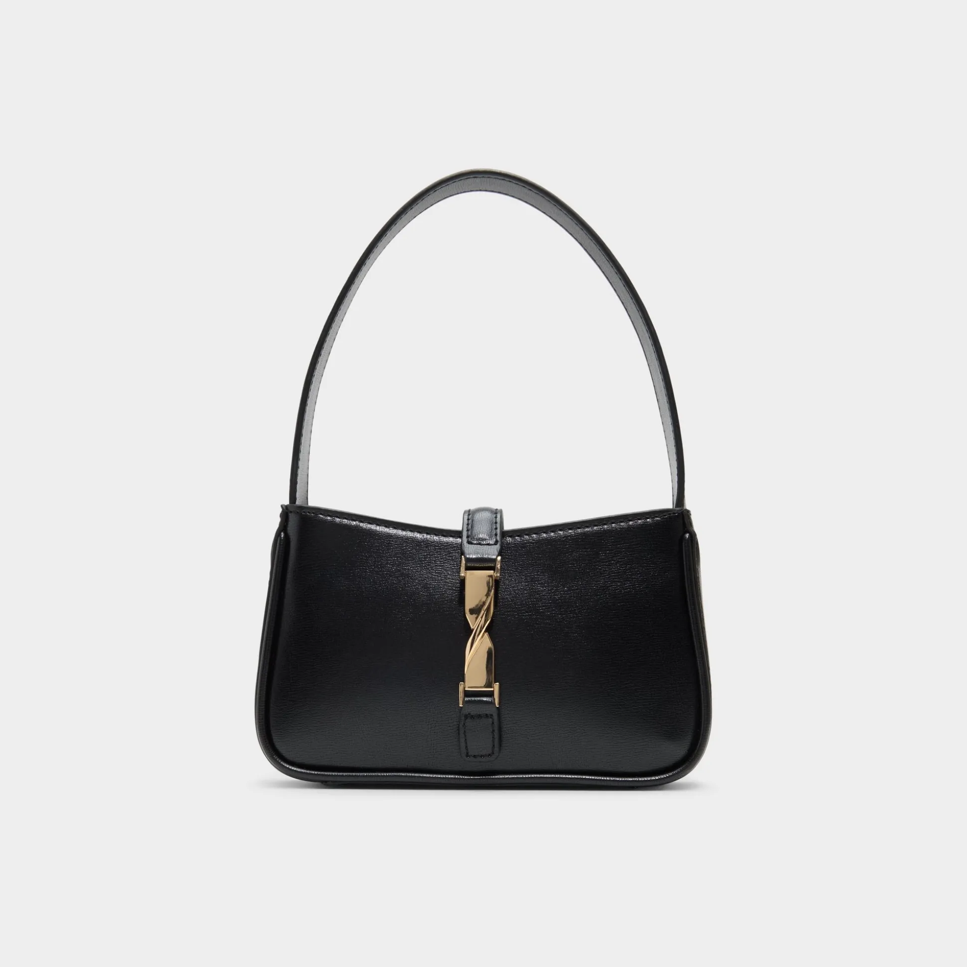 Sculpted in smooth black leather, this slim shoulder bag leans into quiet luxury with a twisted gold buckle over a hidden magnetic closure, keeping the structured silhouette sharp and essentials close. Sling it under a boxy blazer for campus presentations or tuck it against a slip dress at rooftop dinners to polish every look.