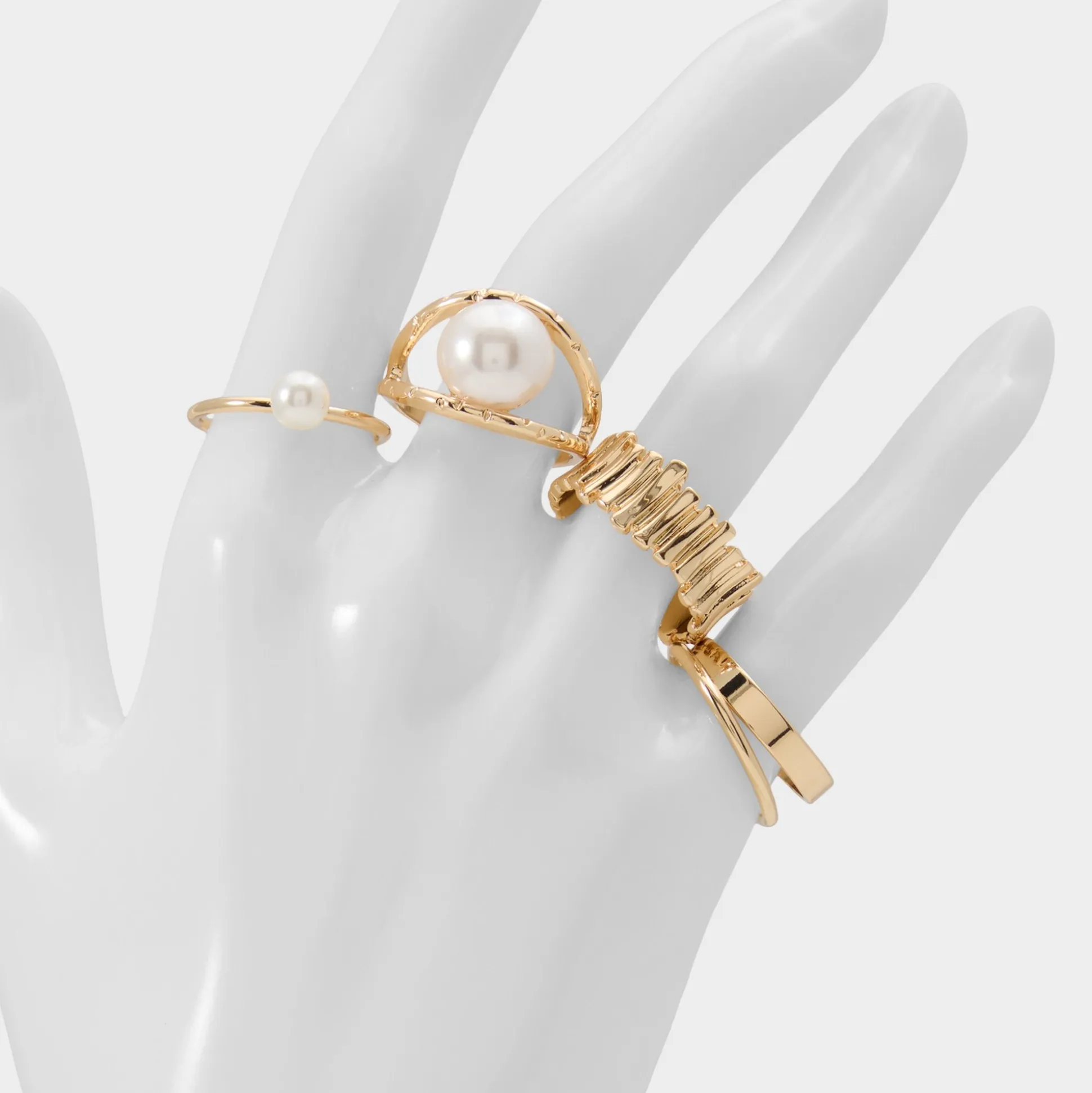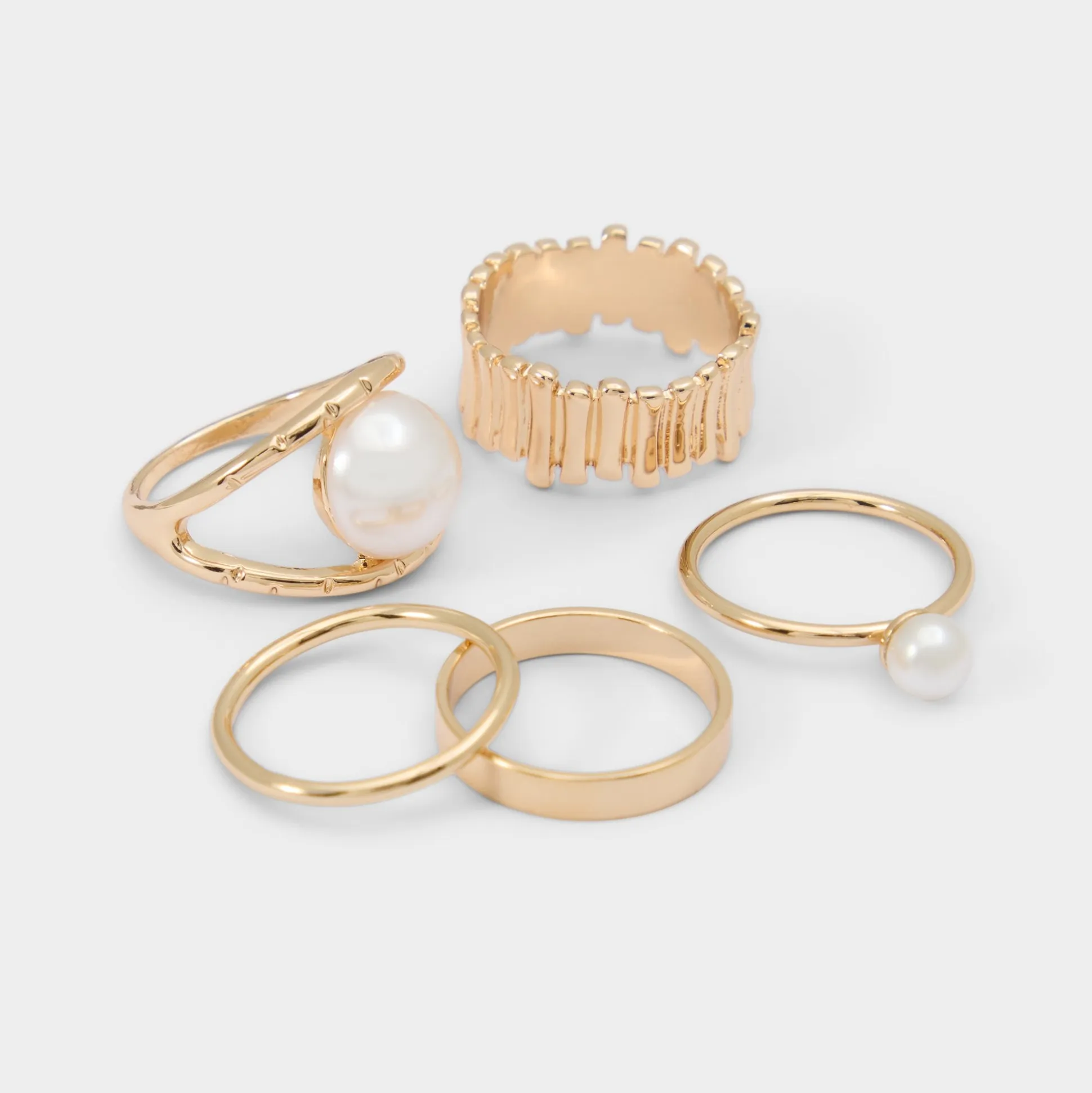 Faux pearls with a glossy finish stand out on five chic gold-tone bands, offering smooth, ribbed, and open-wrap styles to rearrange freely, creating a personal mini sculpture. Wear them with a satin cami and high-waist denim for patio outings, or layer a single pearl band beside a silk slip for candlelit dinners.