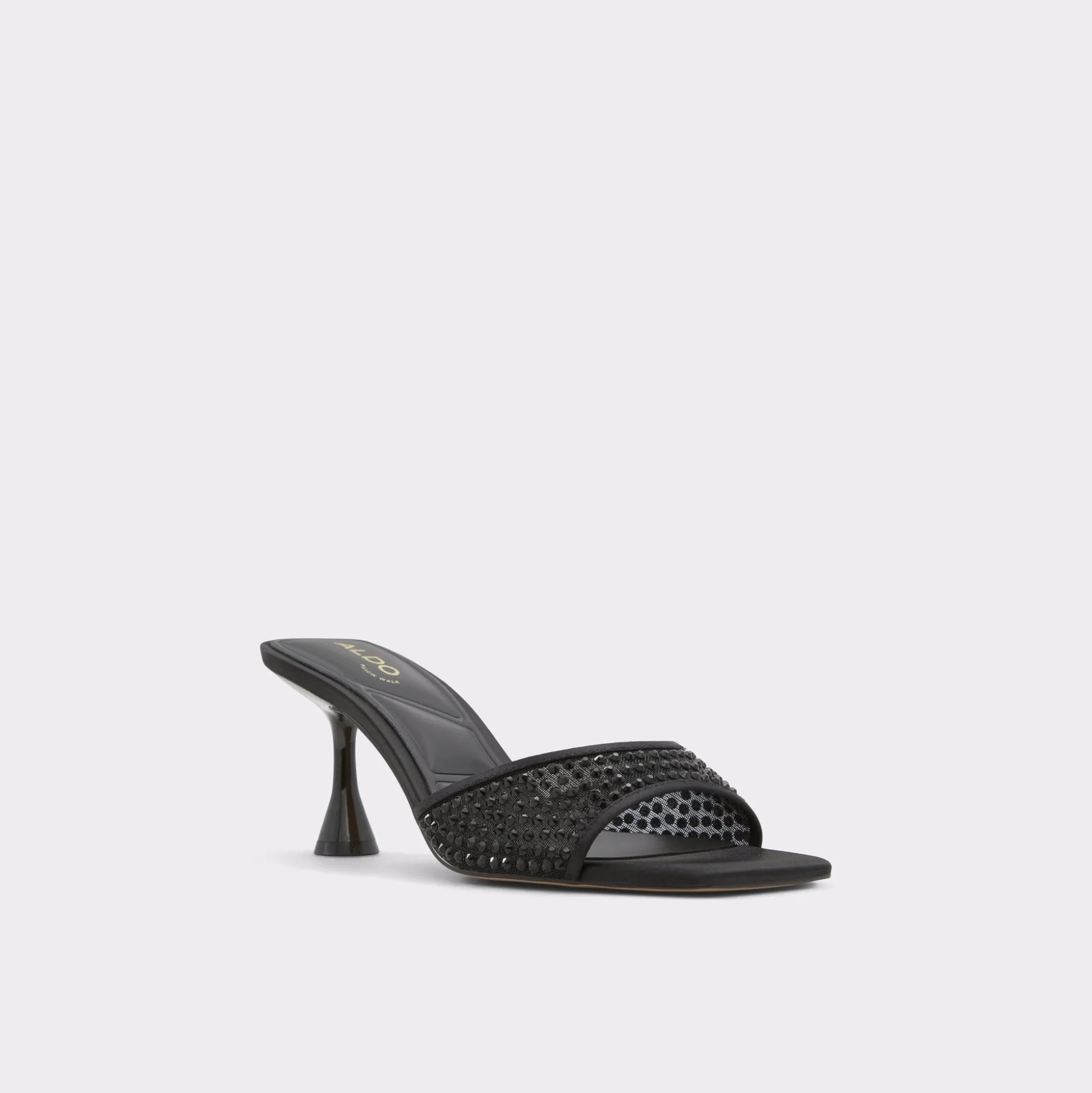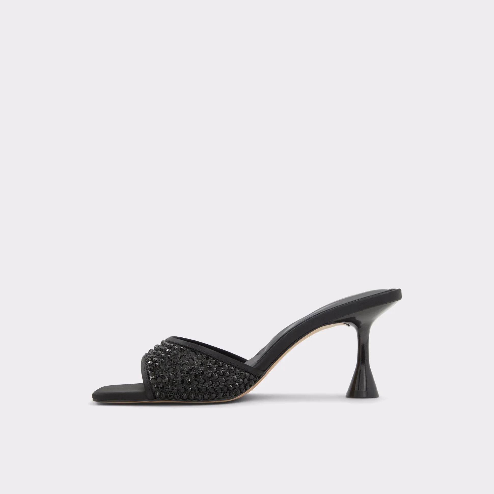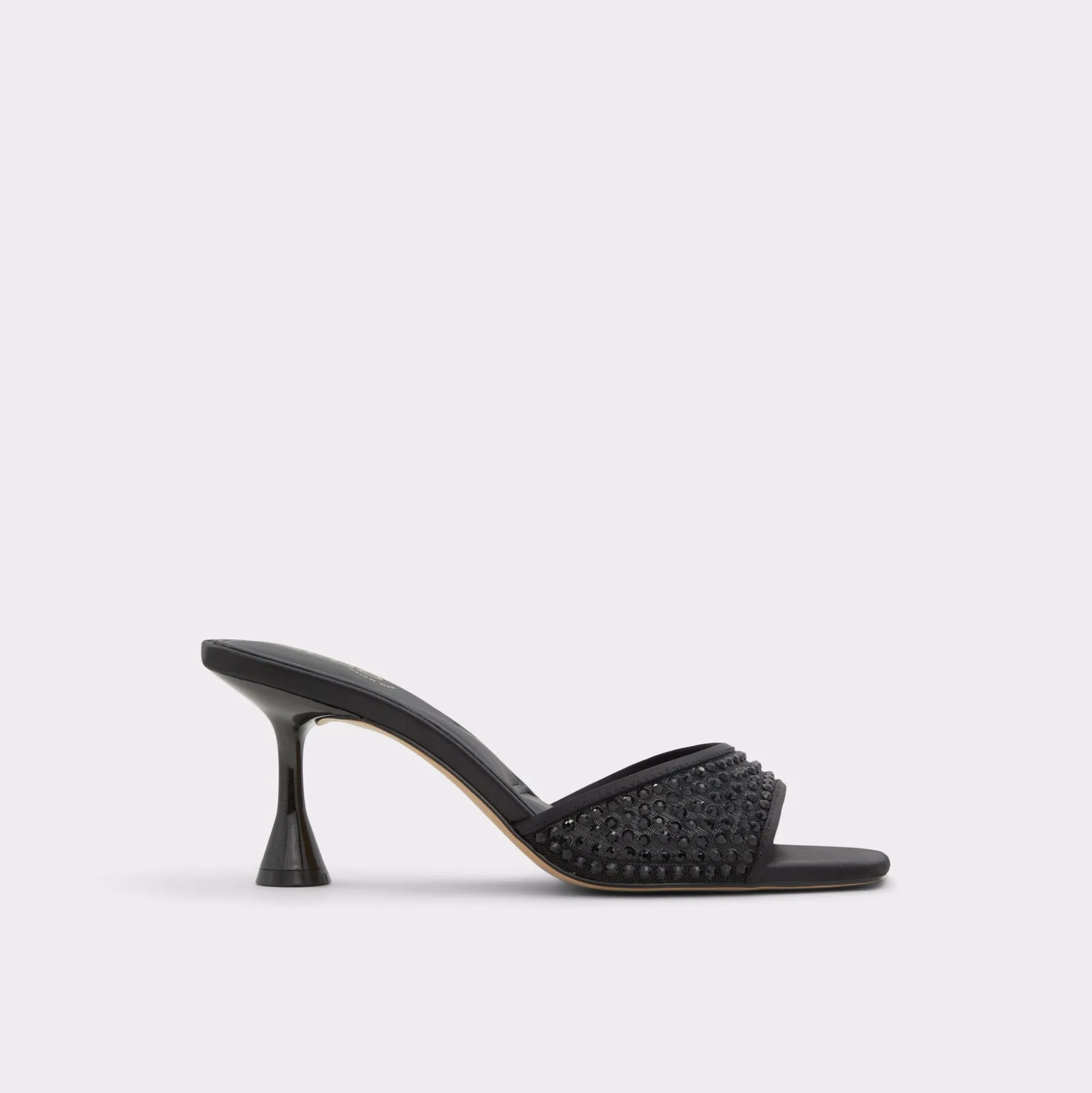 Sculpted spool heel lifts this slip-on mule just enough, while a leather strap glitters with dark micro-studs and a crisp square toe keeps the pedicure breathing through every RSVP-packed evening. Pair with satin mini for rooftop toasts, or swap in tailored trousers when nine-to-five morphs into gallery openings.