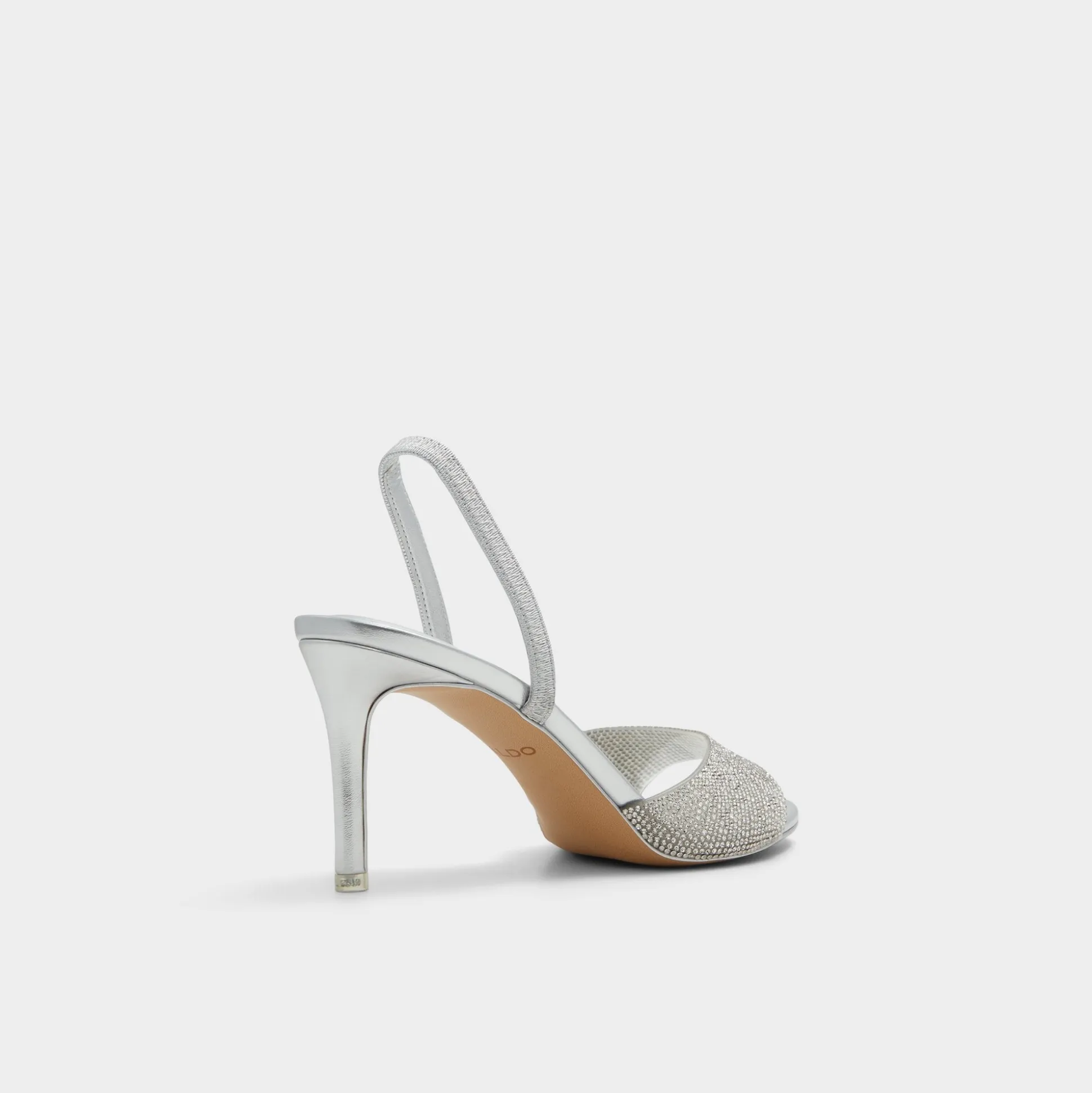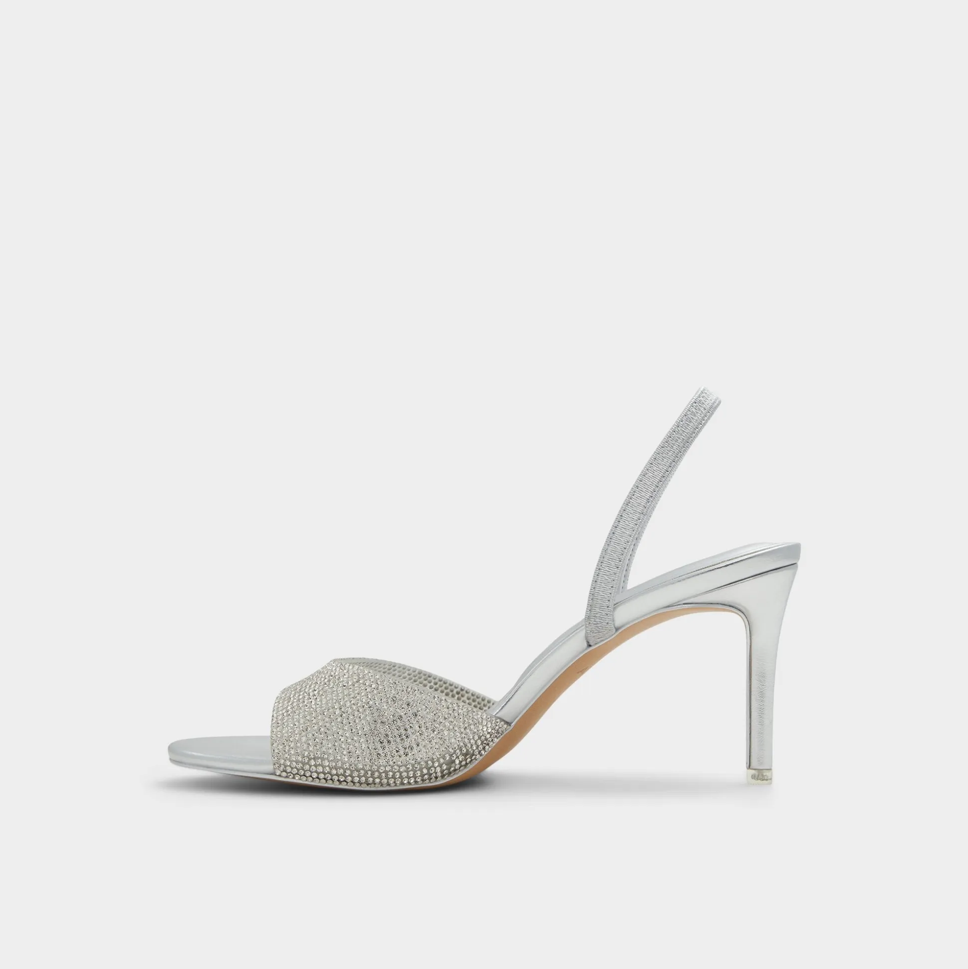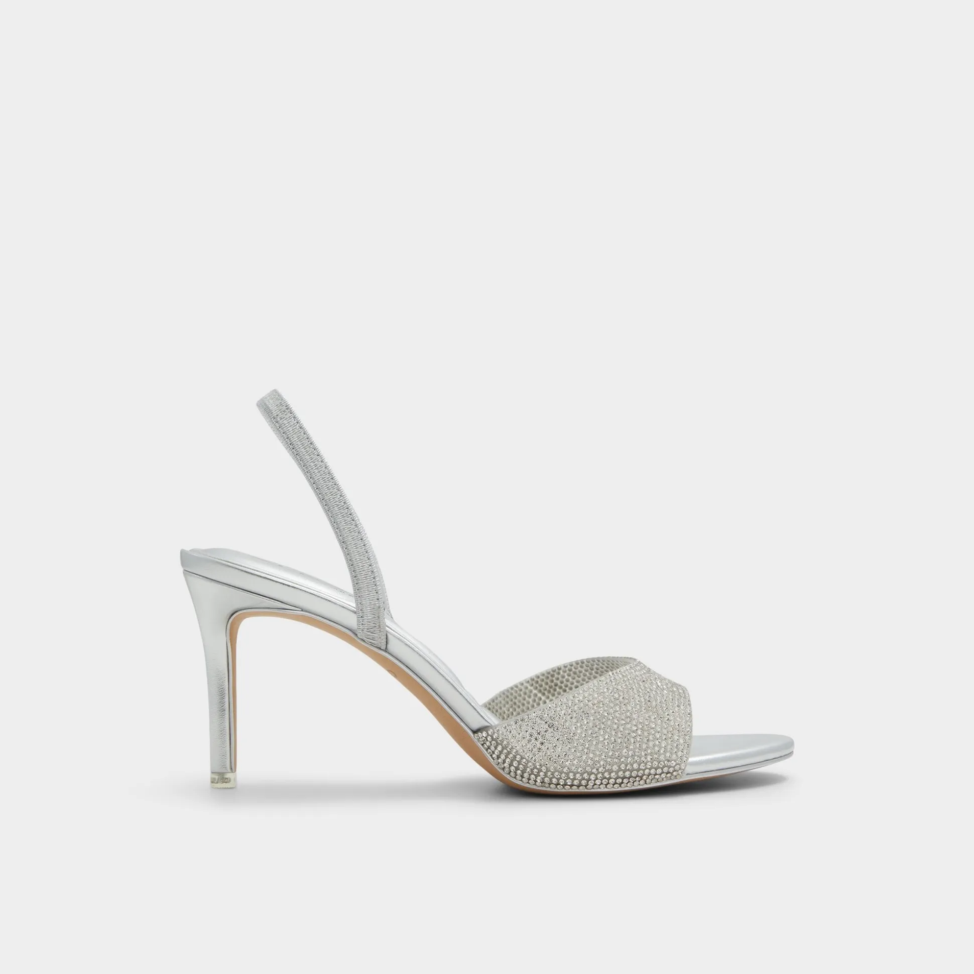 A classic sling back silhouette lends sophisticated appeal to these elegant nude heeled sandals.