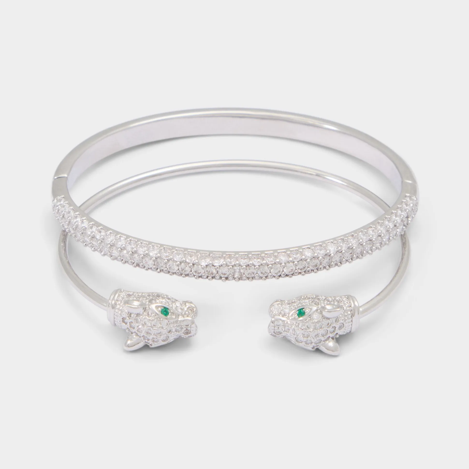 Emerald-tone eyes on twin panther heads guard the open cuff, mirrored by a pave-encrusted bangle, making this stacked silver set perfect for after-dark elegance. Pair it with a sleek watch for presentation days or let it shine solo against a satin slip at rooftop parties, enhancing every gesture.