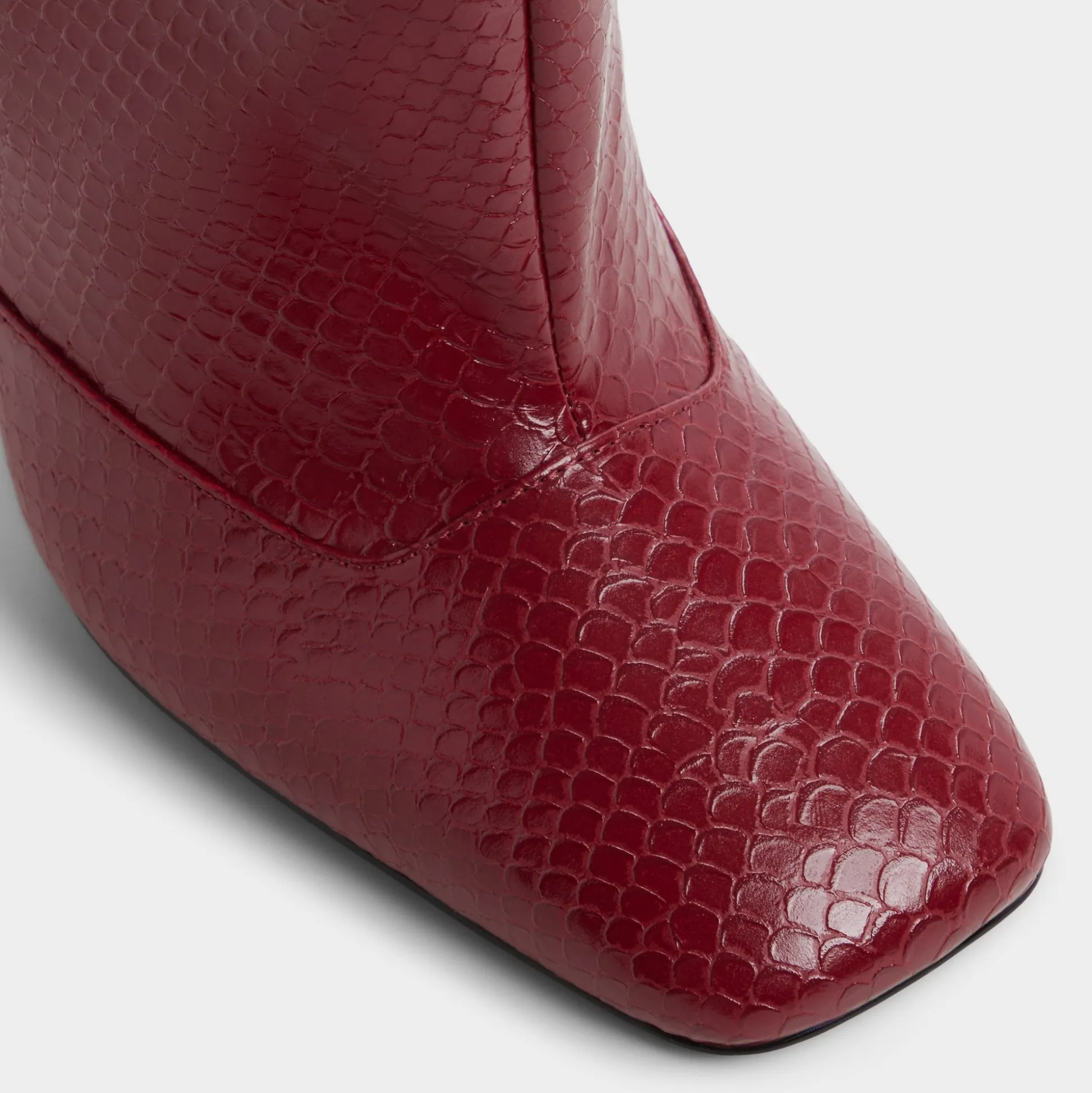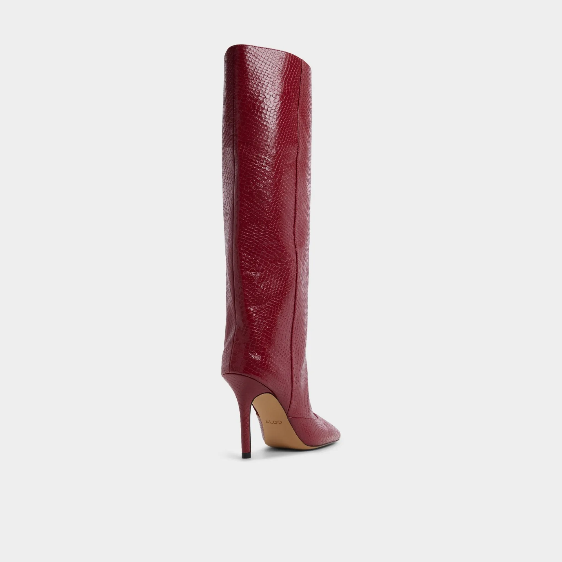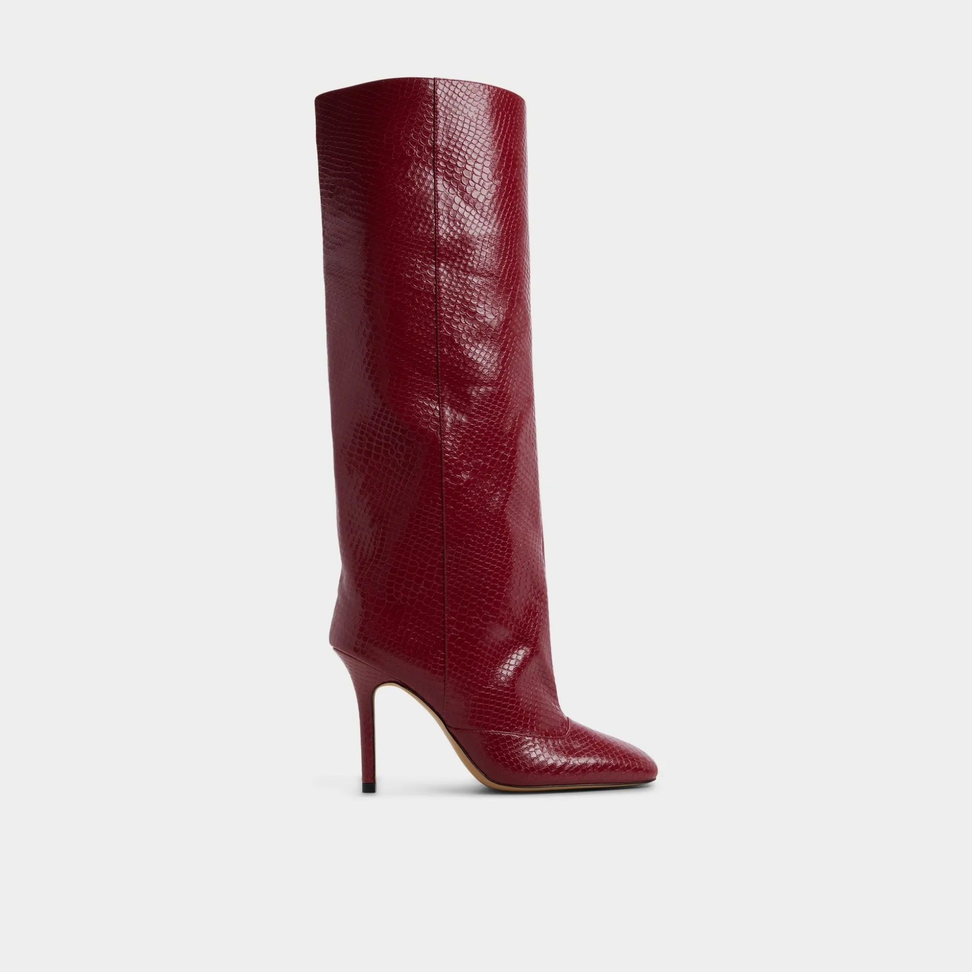 High-gloss crimson snake-embossed leather sweeps knee-high in one fluid motion, with a razor-sharp stiletto adding height and turning routine commutes into standout entrances while hidden padding keeps it calm. Style it with a knit mini for art-late brunches or layer over slim trousers when after-dark meetings inspire adventures.