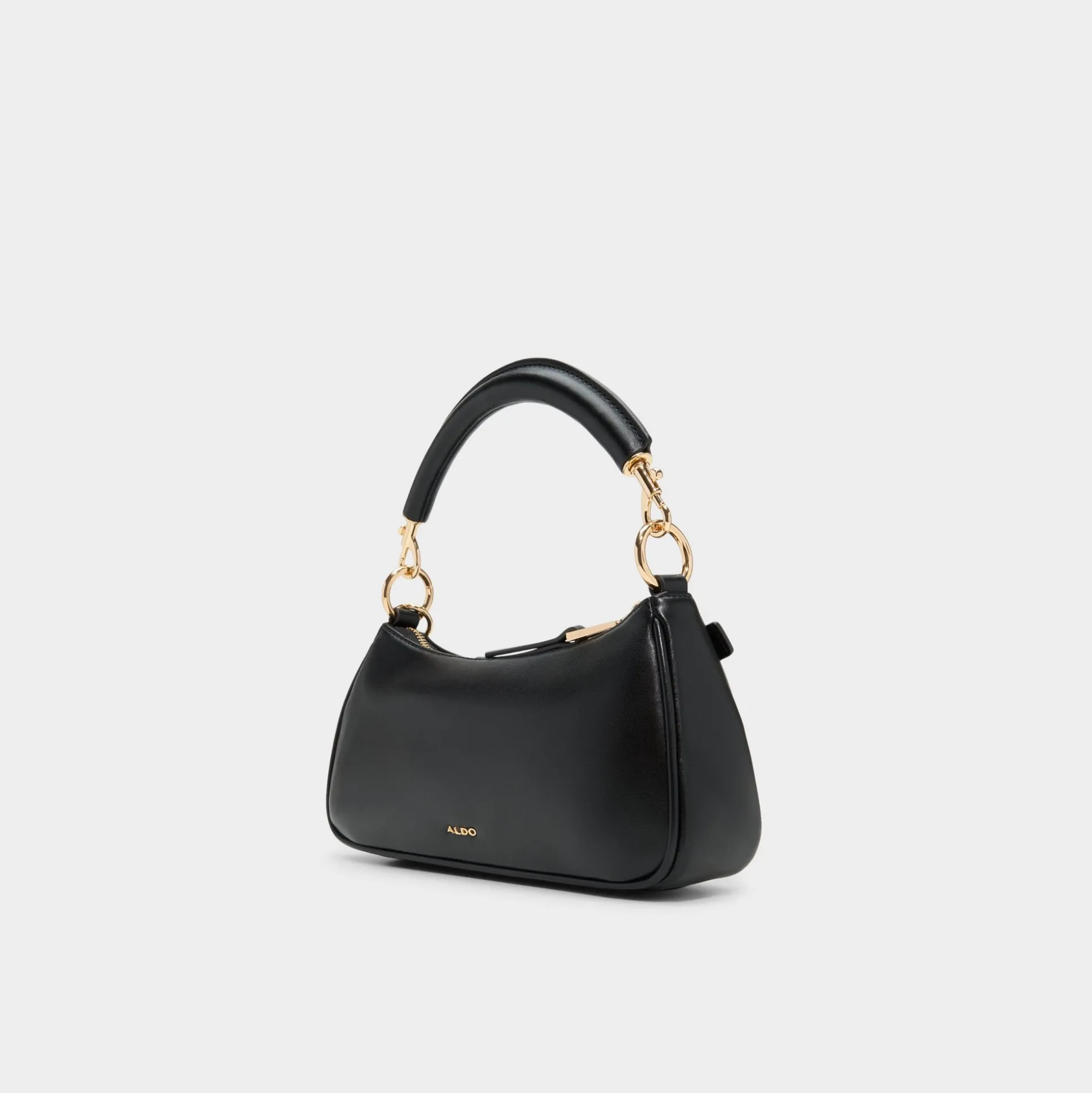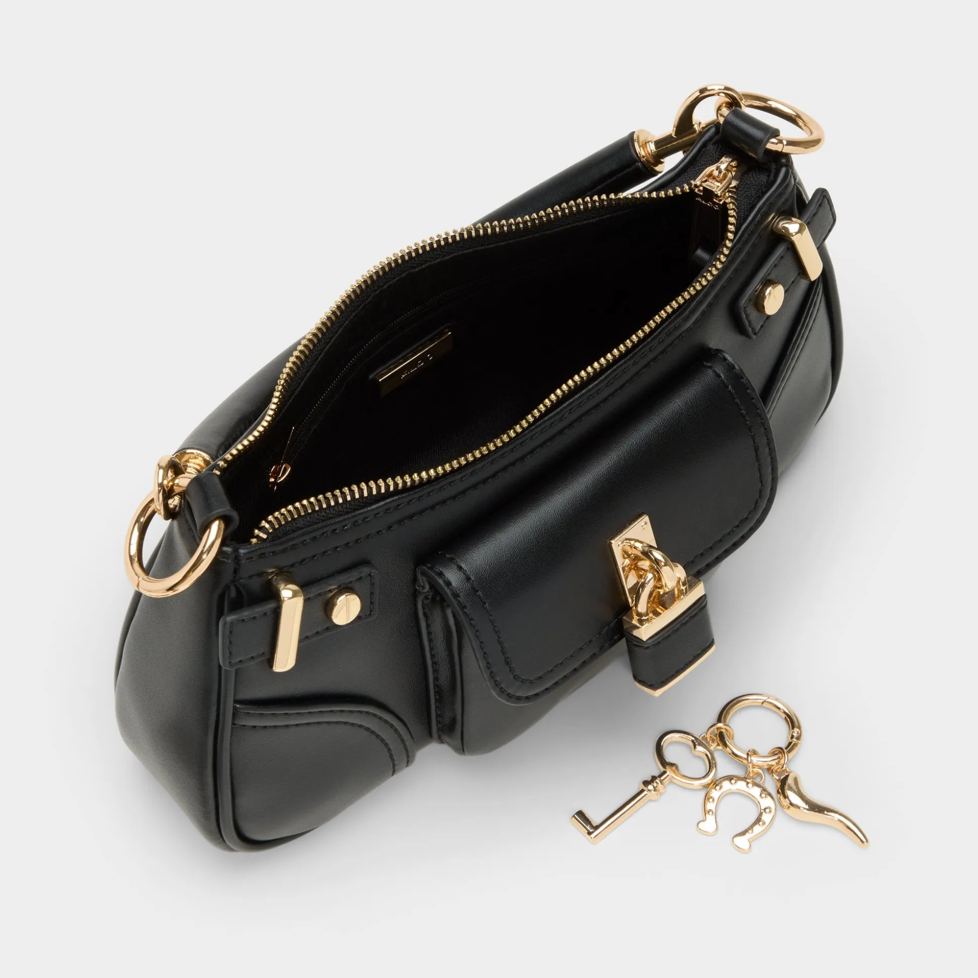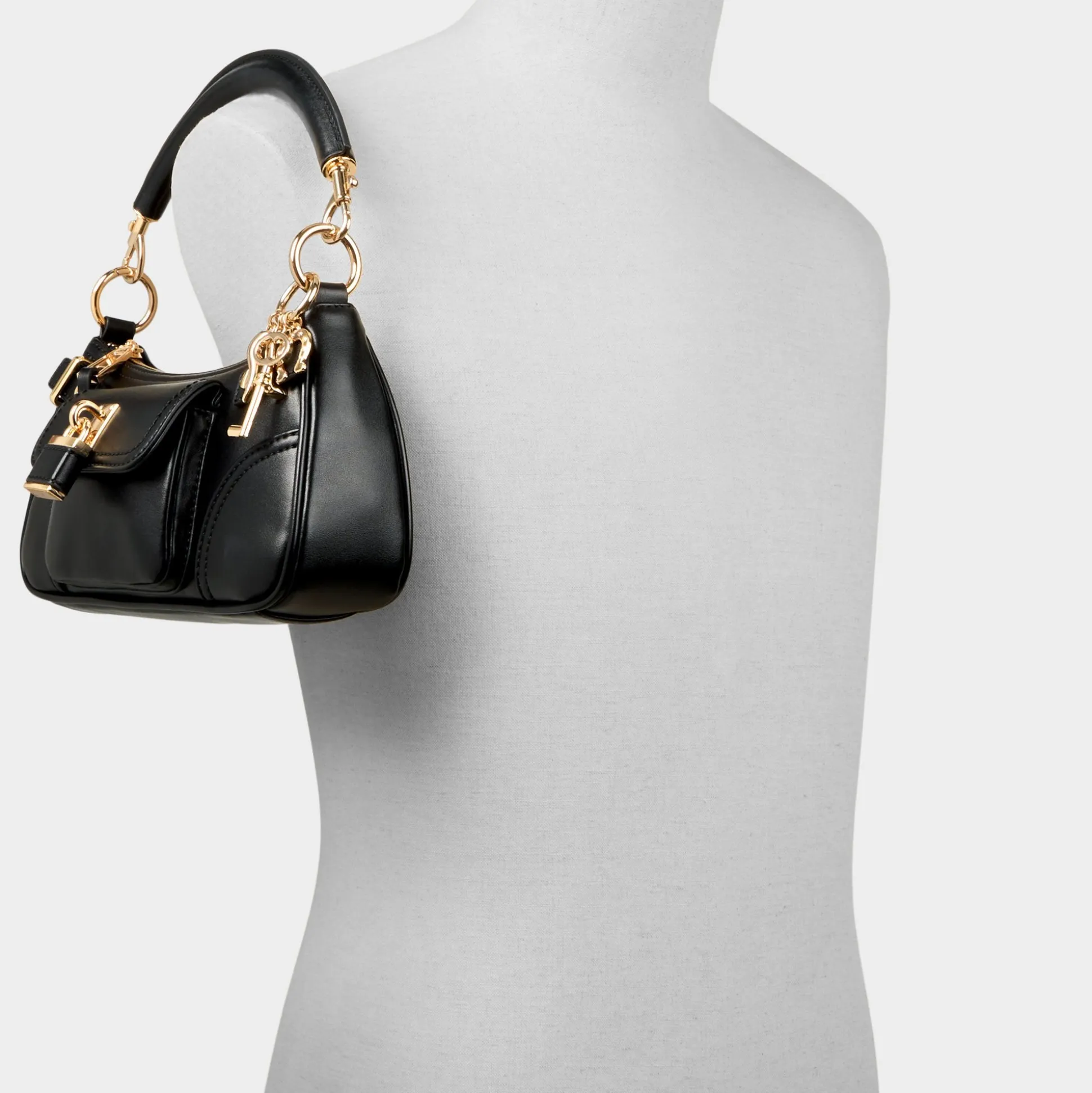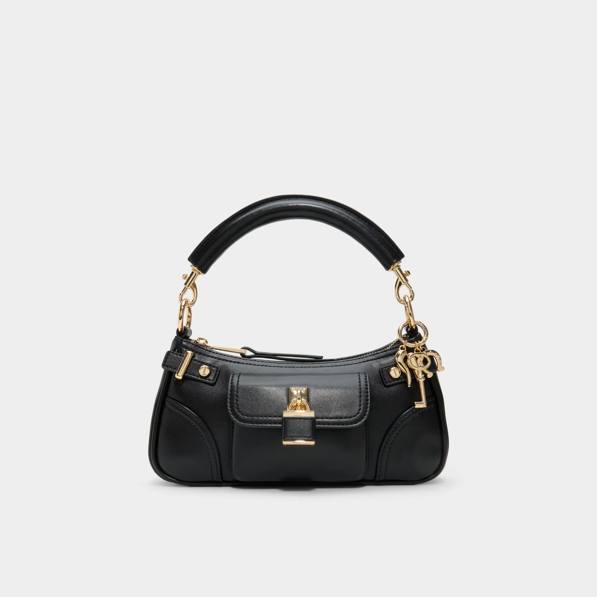 Midnight-smooth leather arcs into a chic baguette shape, with a gleaming push-lock padlock charm stealing the spotlight as the rolled handle threads through golden links, keeping carry polished beneath tailored jackets or worn day-to-night. Carry it with a sharp blazer for meetings or swing it over denim for weekend dinners, finishing every look with quiet confidence.