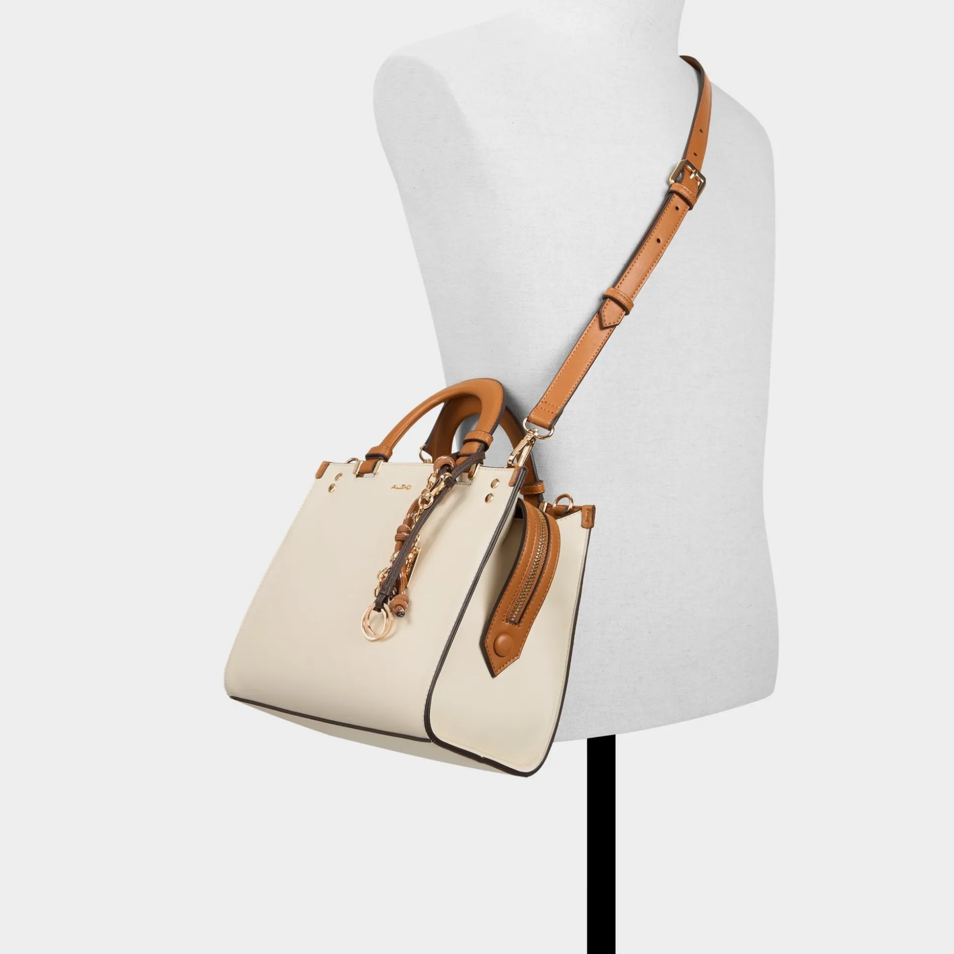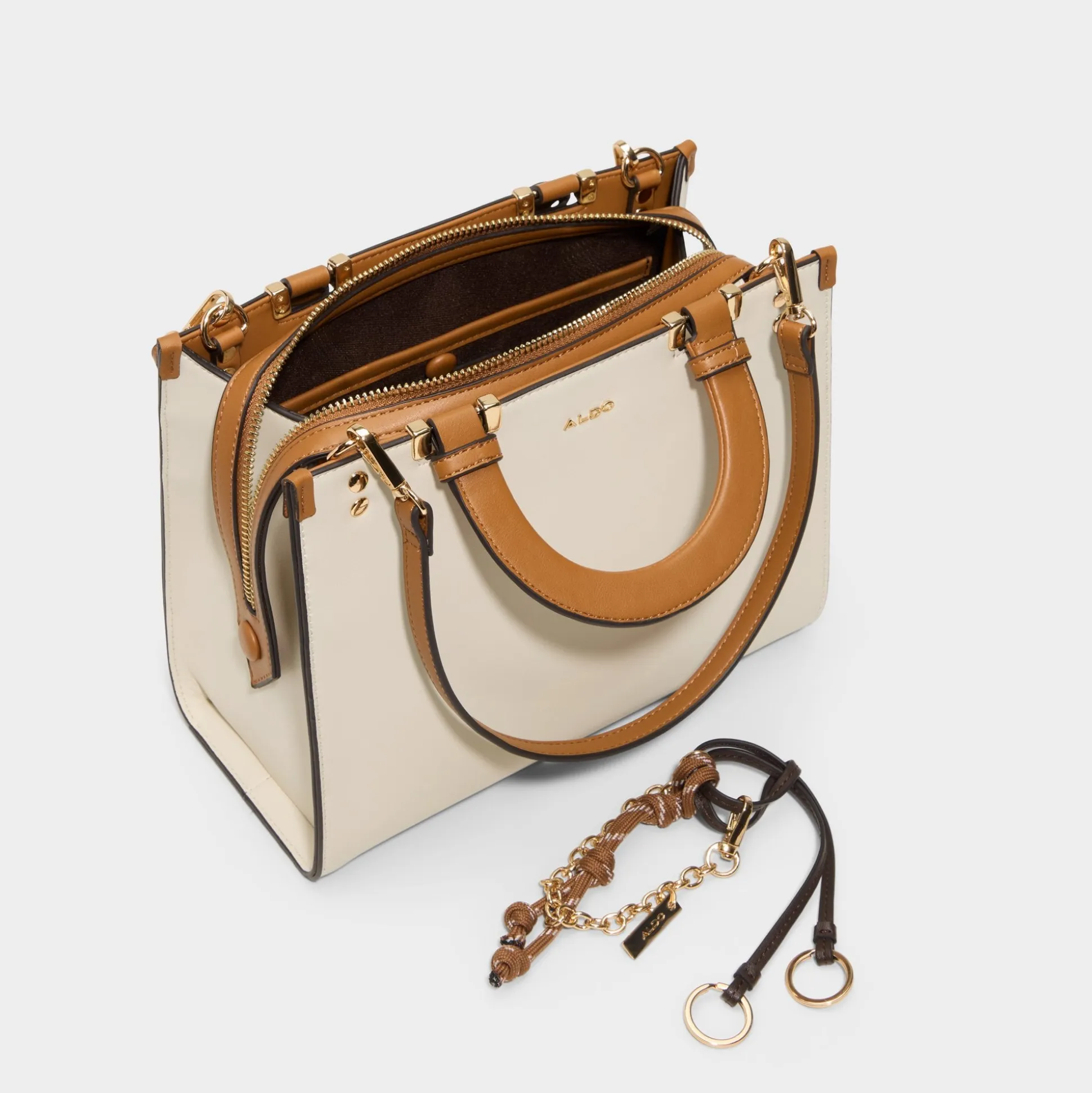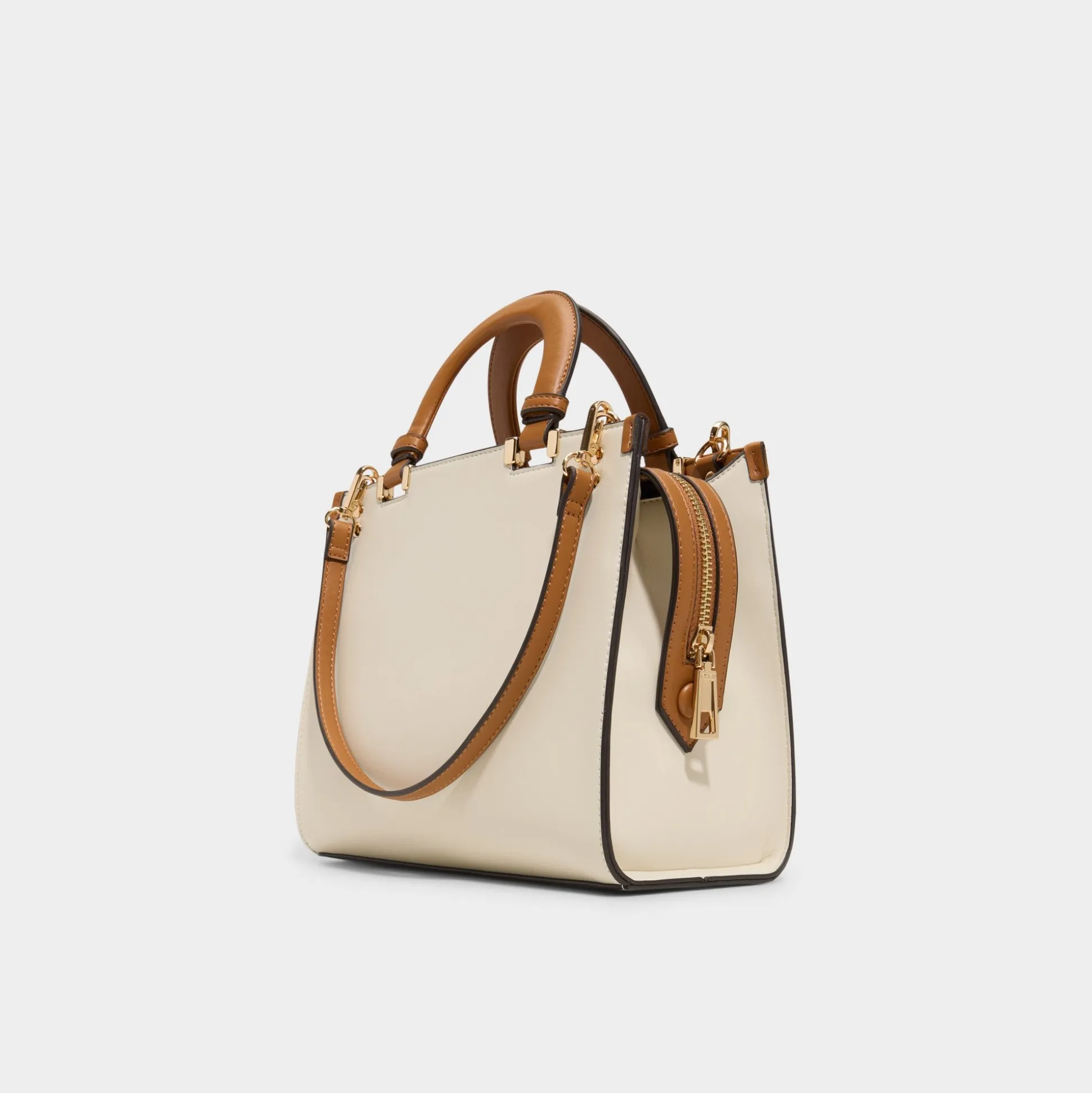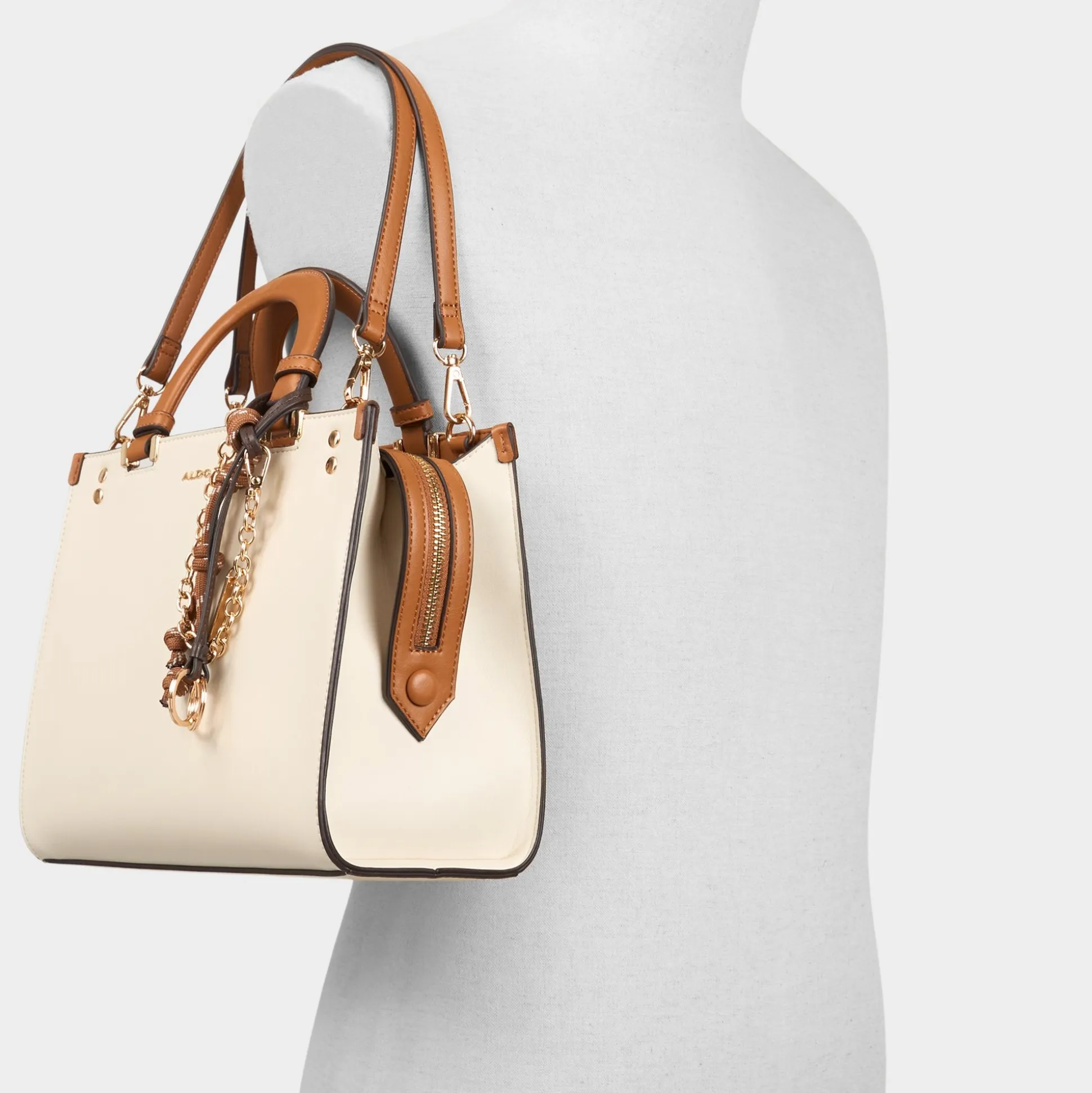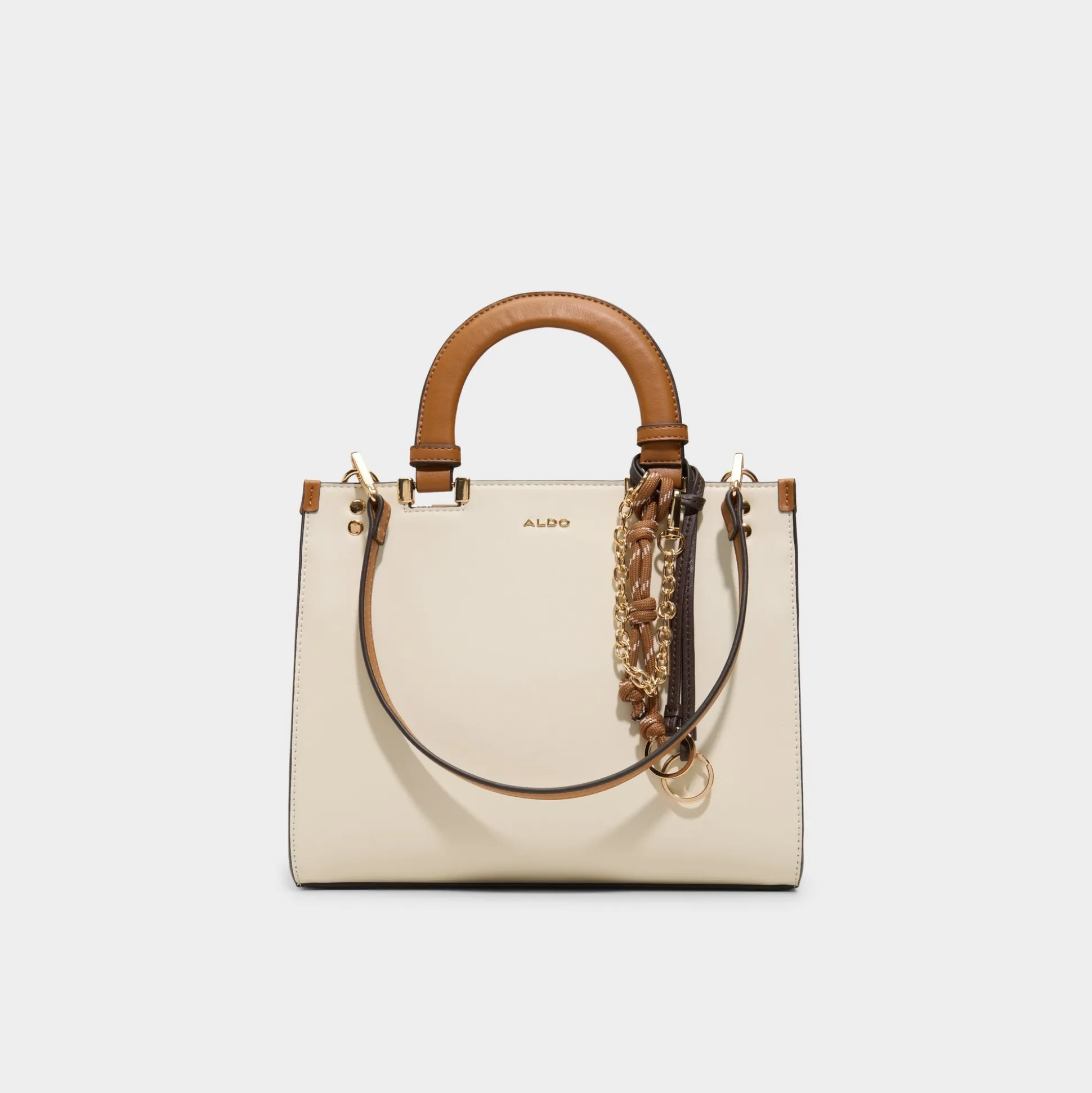 Creamy panels meet cognac handles on this crisp square silhouette, where a gleaming side-draping chain adds city-smart shine and a snap-on strap makes hands-free styling feel almost effortless, perfect for quick coffee runs or gallery hops. Carry it from brunch to boardroom by switching to the longer strap, and let the refined polish finish every look with effortless confidence.