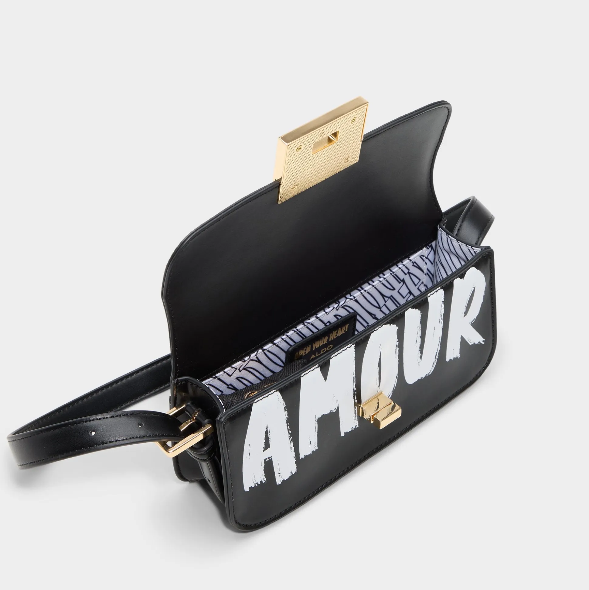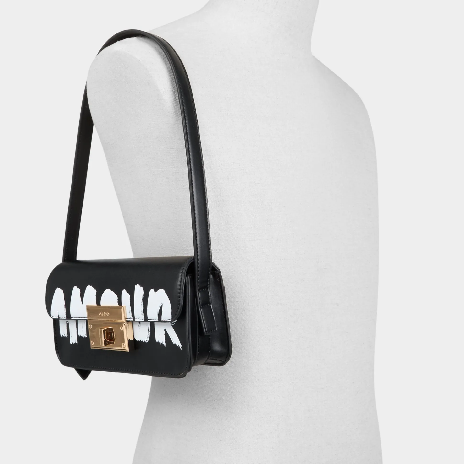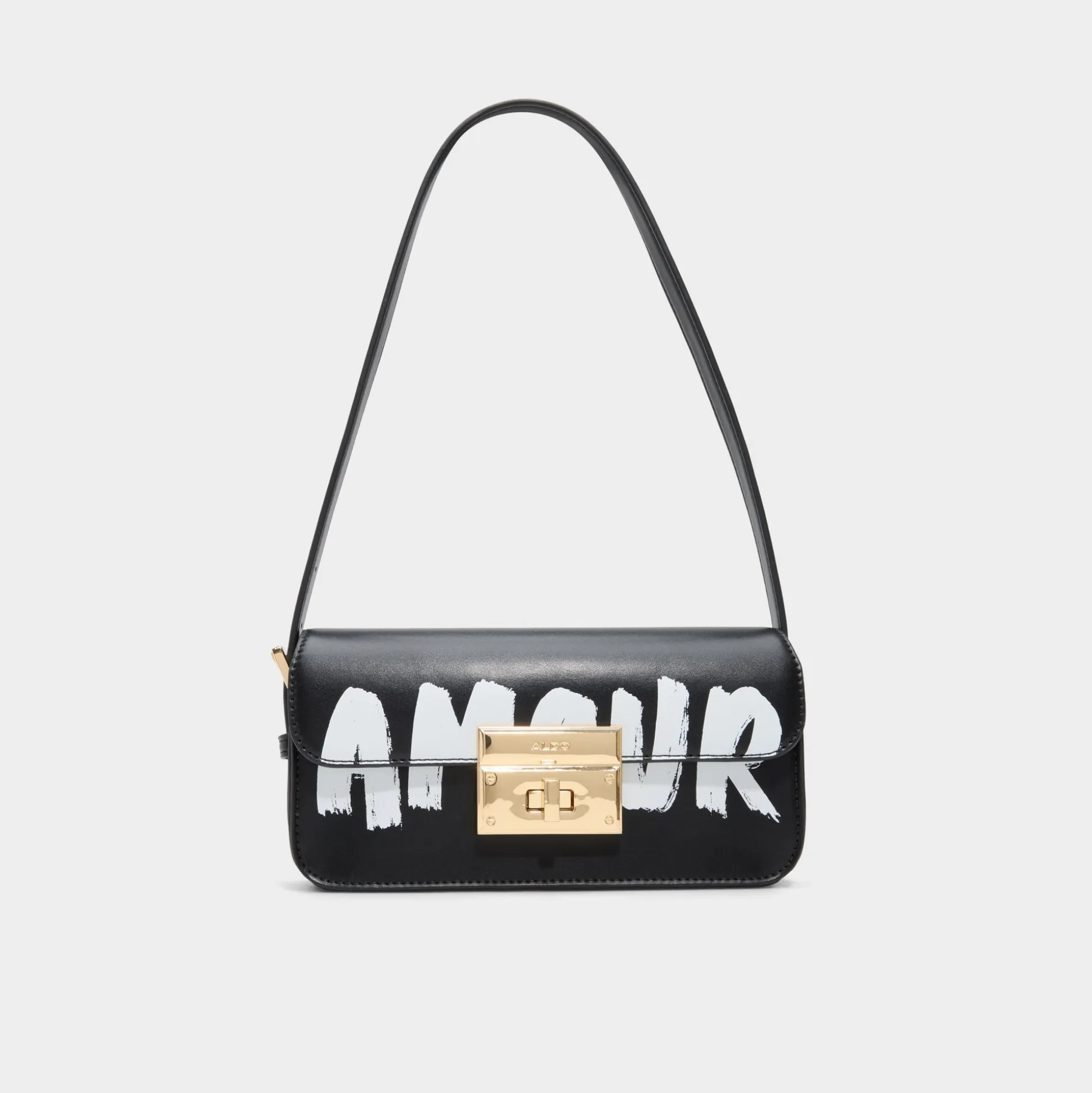 Bold AMOUR scrawl on sleek black leather makes this shoulder bag feel like street art you can carry, while a gleaming gold turn-lock announces secure essentials and confidence you wear from cafe to gig. Sling it with a cropped blazer for coffee catch-ups, or tuck it under your arm at gigs to finish an urban, all-day look.