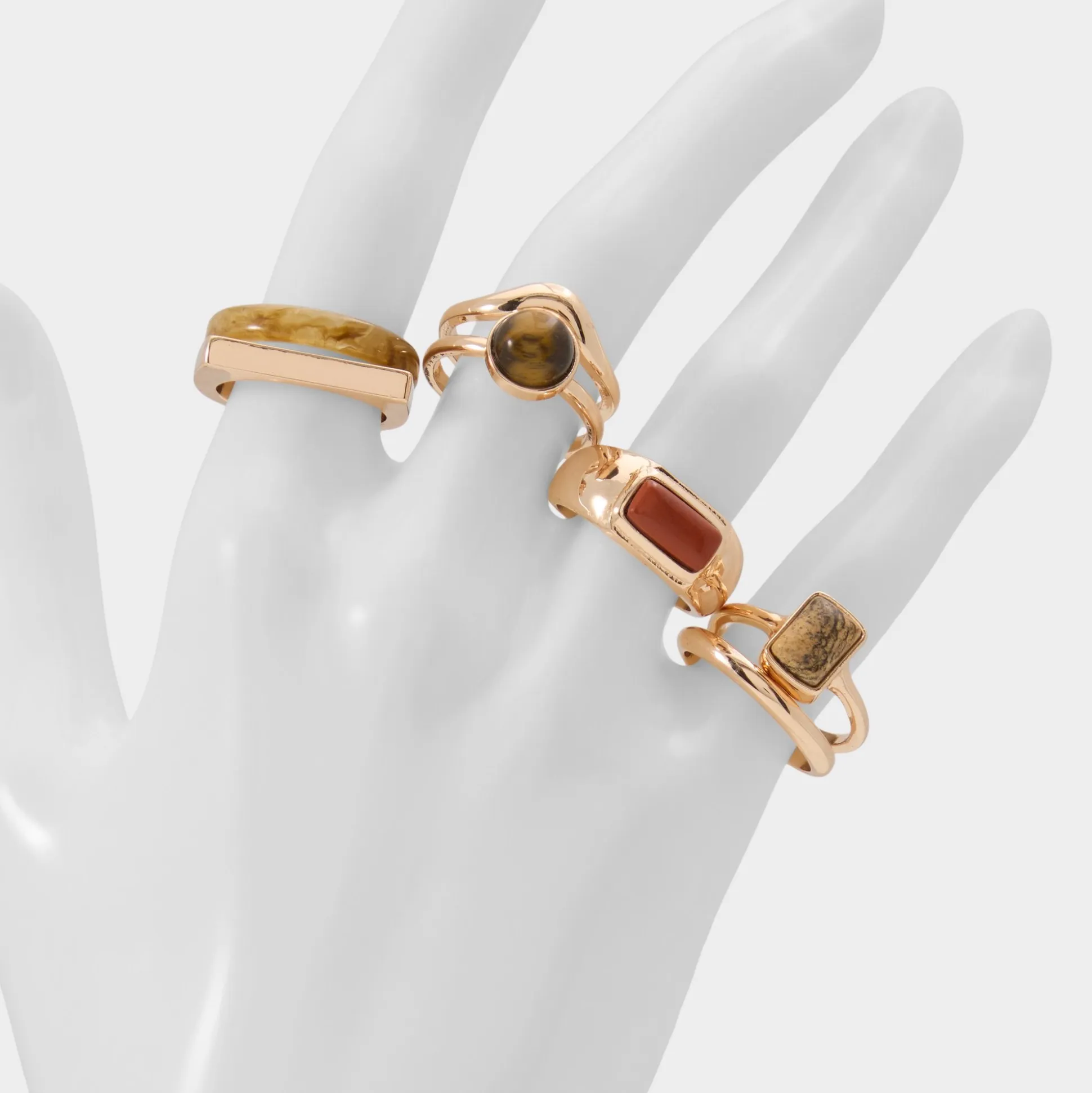 Five gold-tone rings mix sleek bands with tiger-eye and sandstone in geometric cuts, giving you a build-your-own landscape of earthy shimmer you can rearrange day by day. Stack them with a chunky sweater and wide-leg denim for coffee runs, or split them across fingers beside a slinky slip dress for rooftop dates.