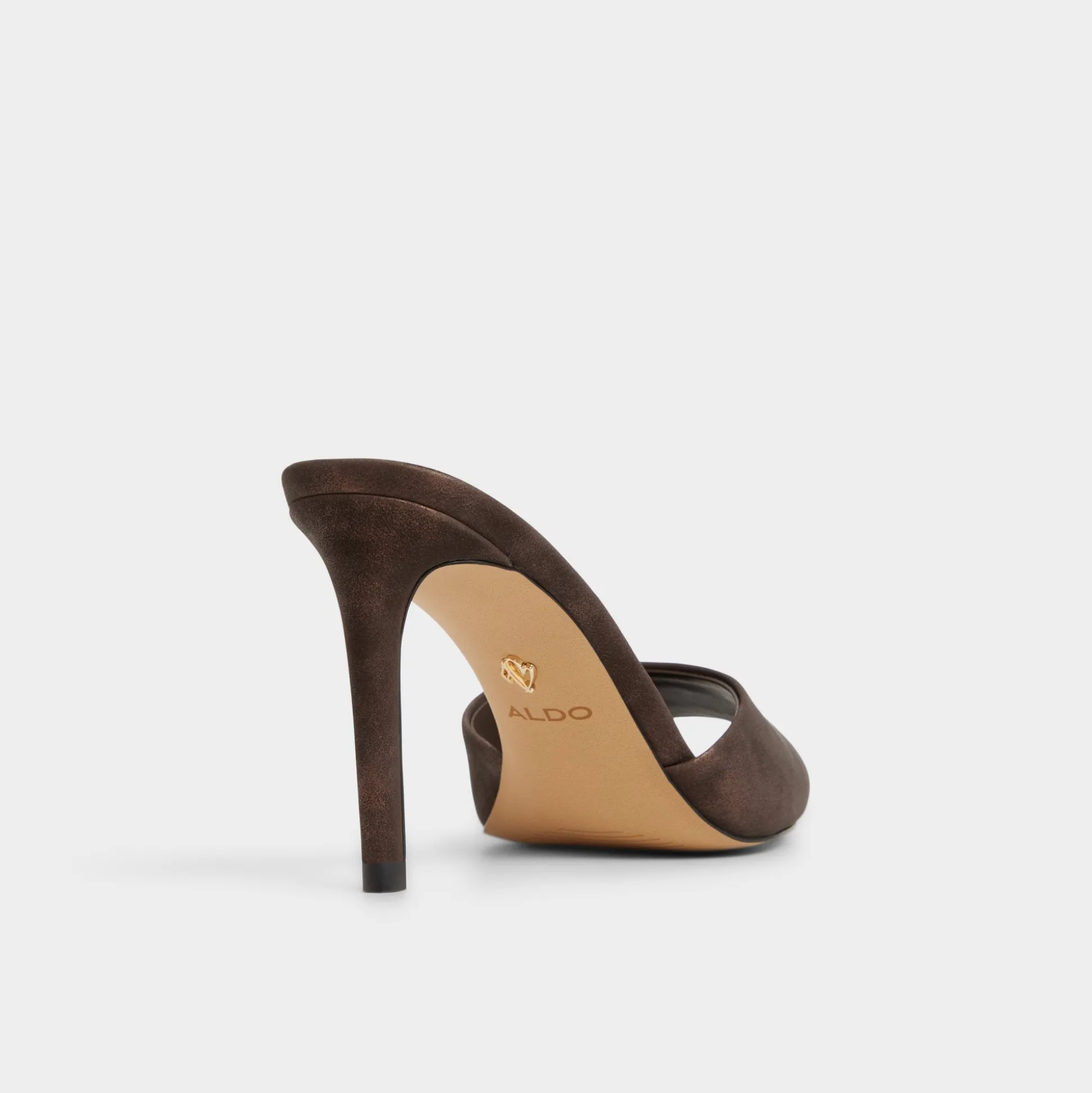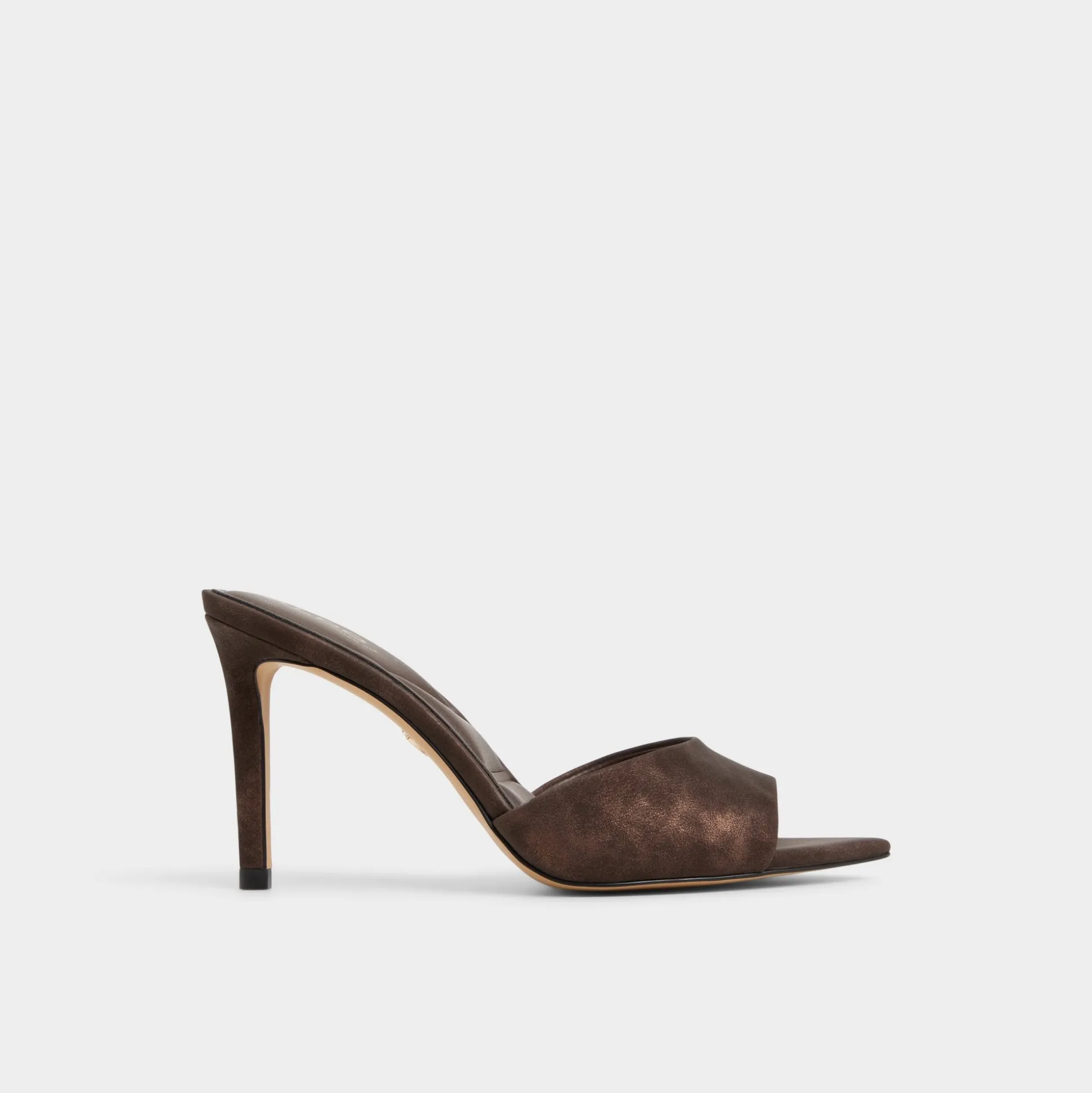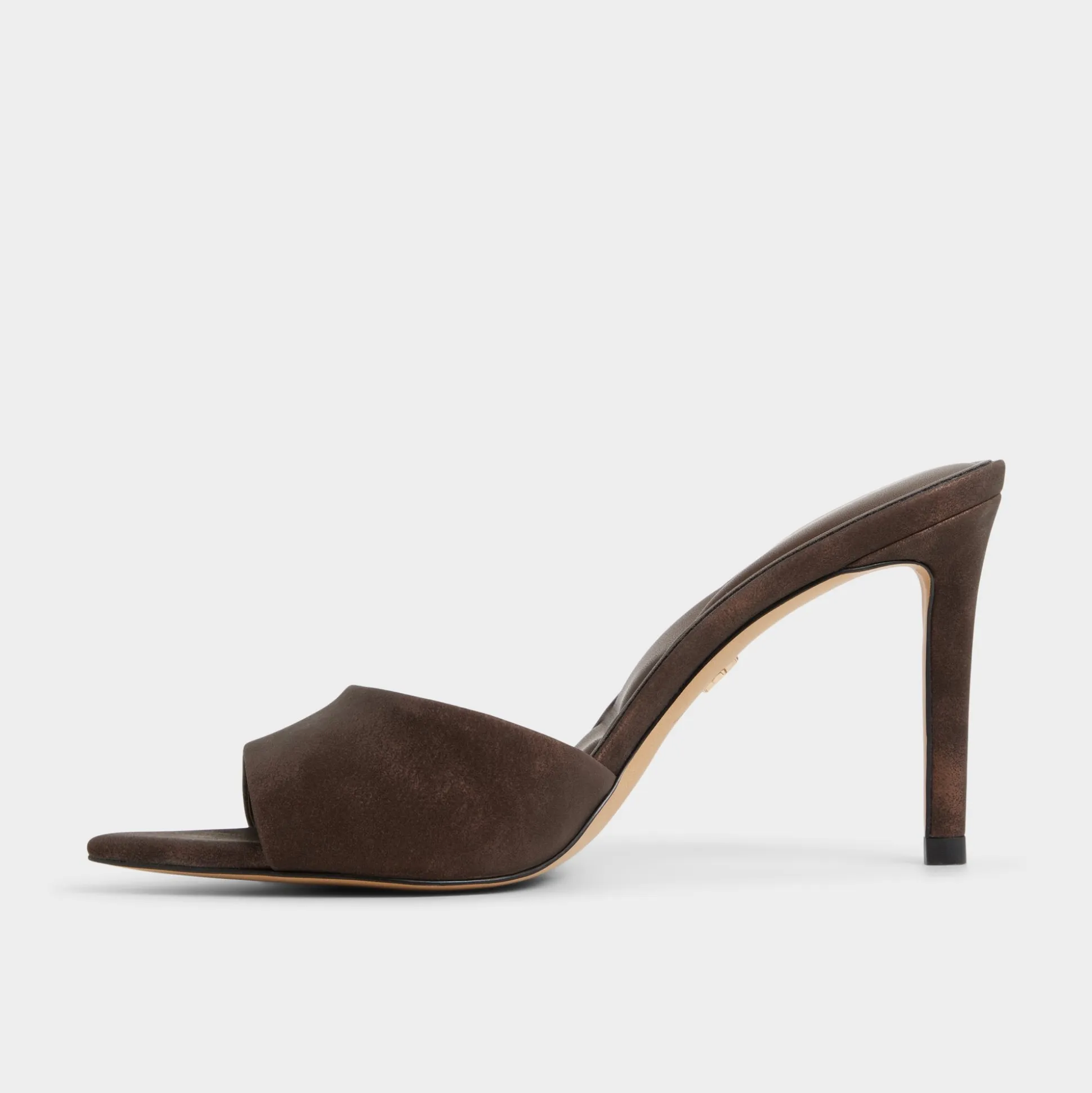 Mocha suede drapes the clean vamp of a slip-on mule, elevating the look with a sculpted stiletto that adds leg-lengthening height and a confident, after-hours glow you can feel. Pair with cropped leather trousers for cocktails, or slip into a satin dress for a dinner-polish finish.