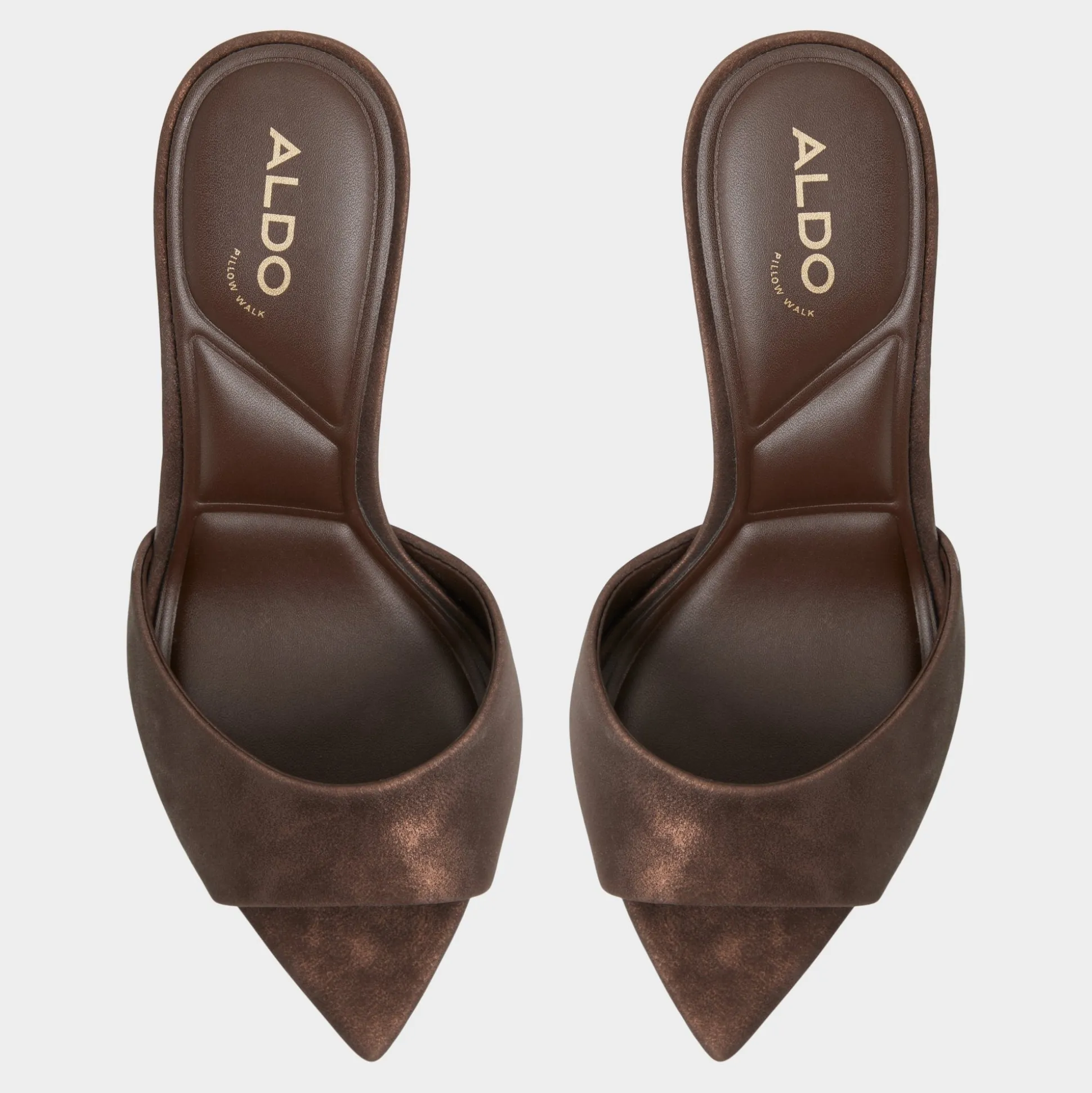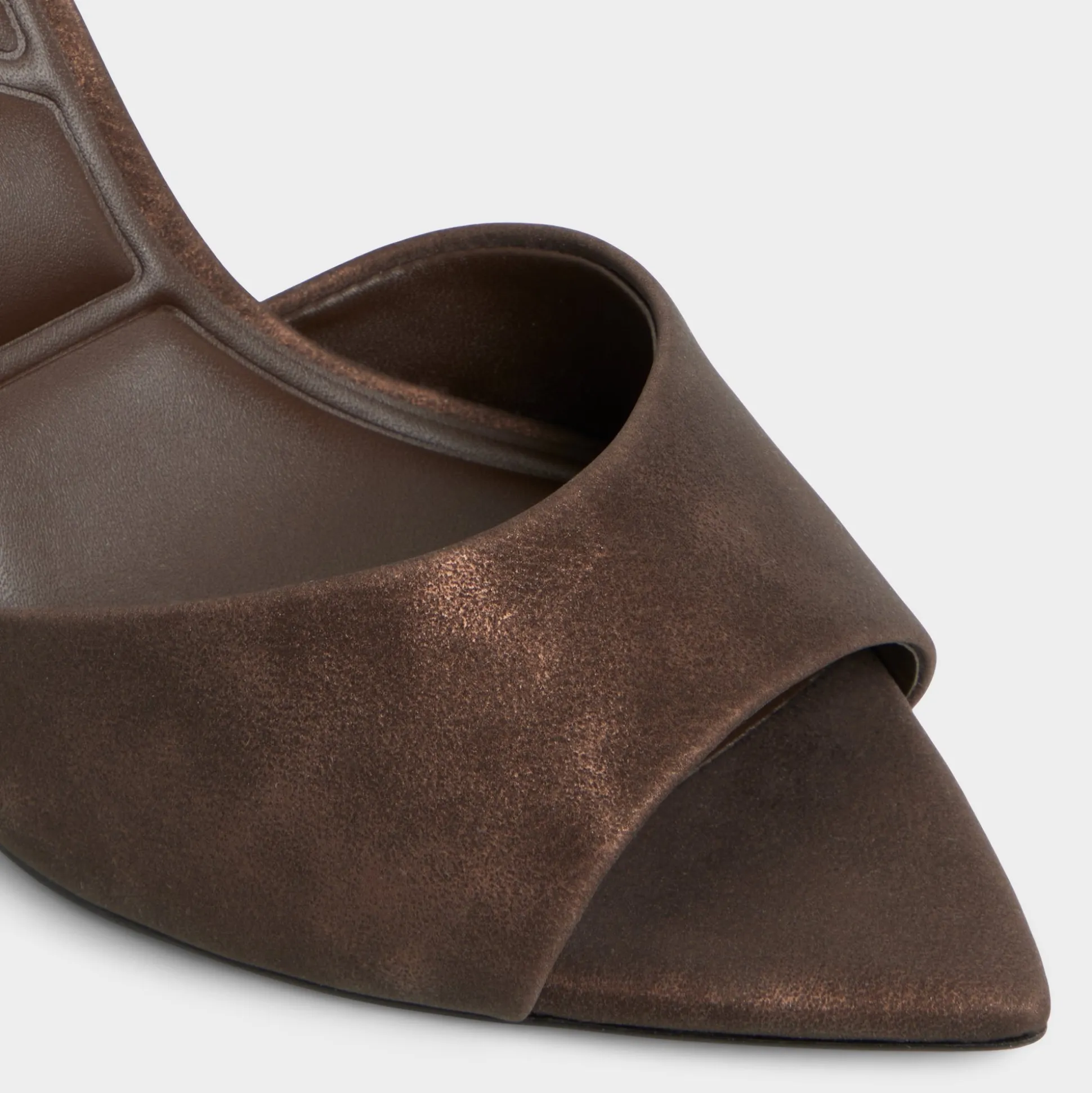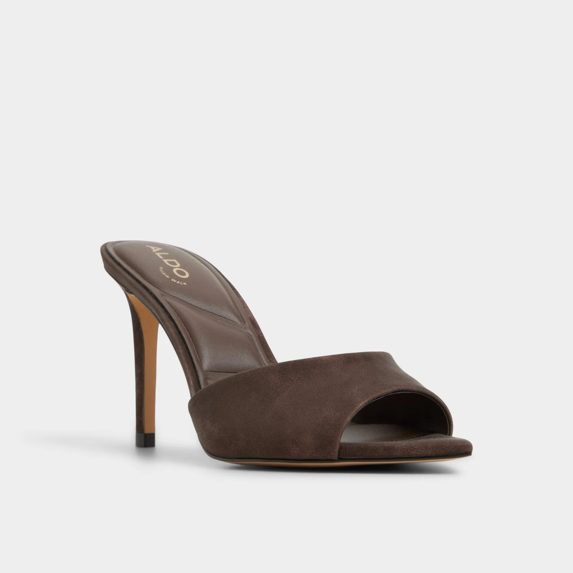 Mocha suede drapes the clean vamp of a slip-on mule, elevating the look with a sculpted stiletto that adds leg-lengthening height and a confident, after-hours glow you can feel. Pair with cropped leather trousers for cocktails, or slip into a satin dress for a dinner-polish finish.