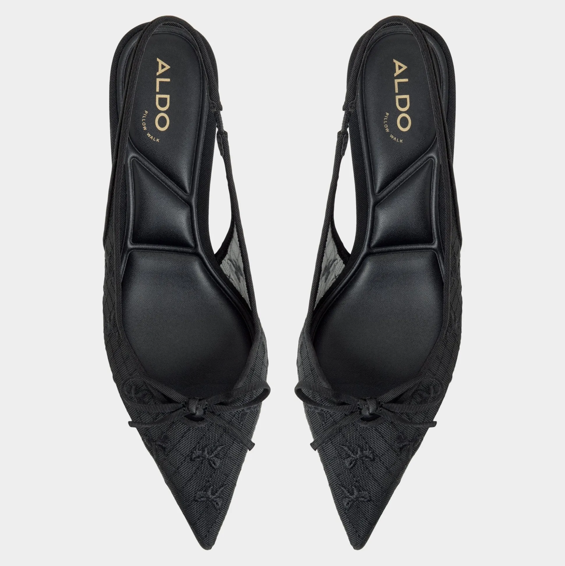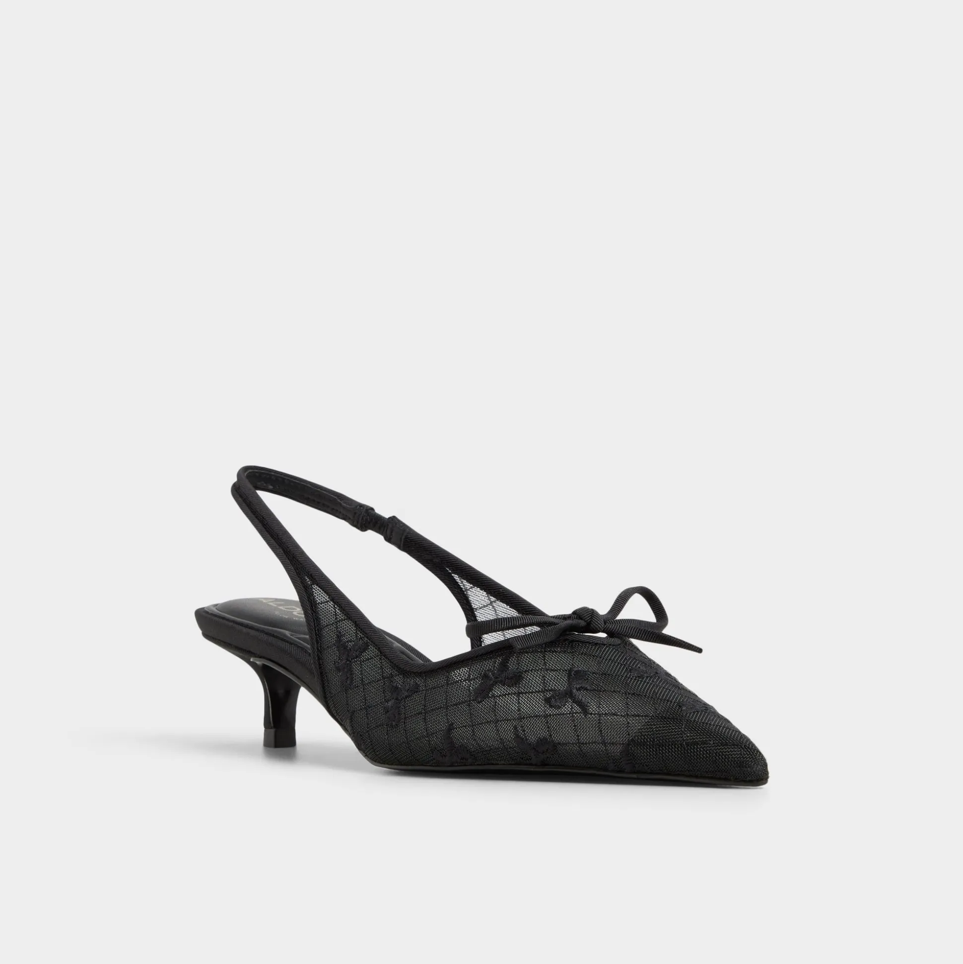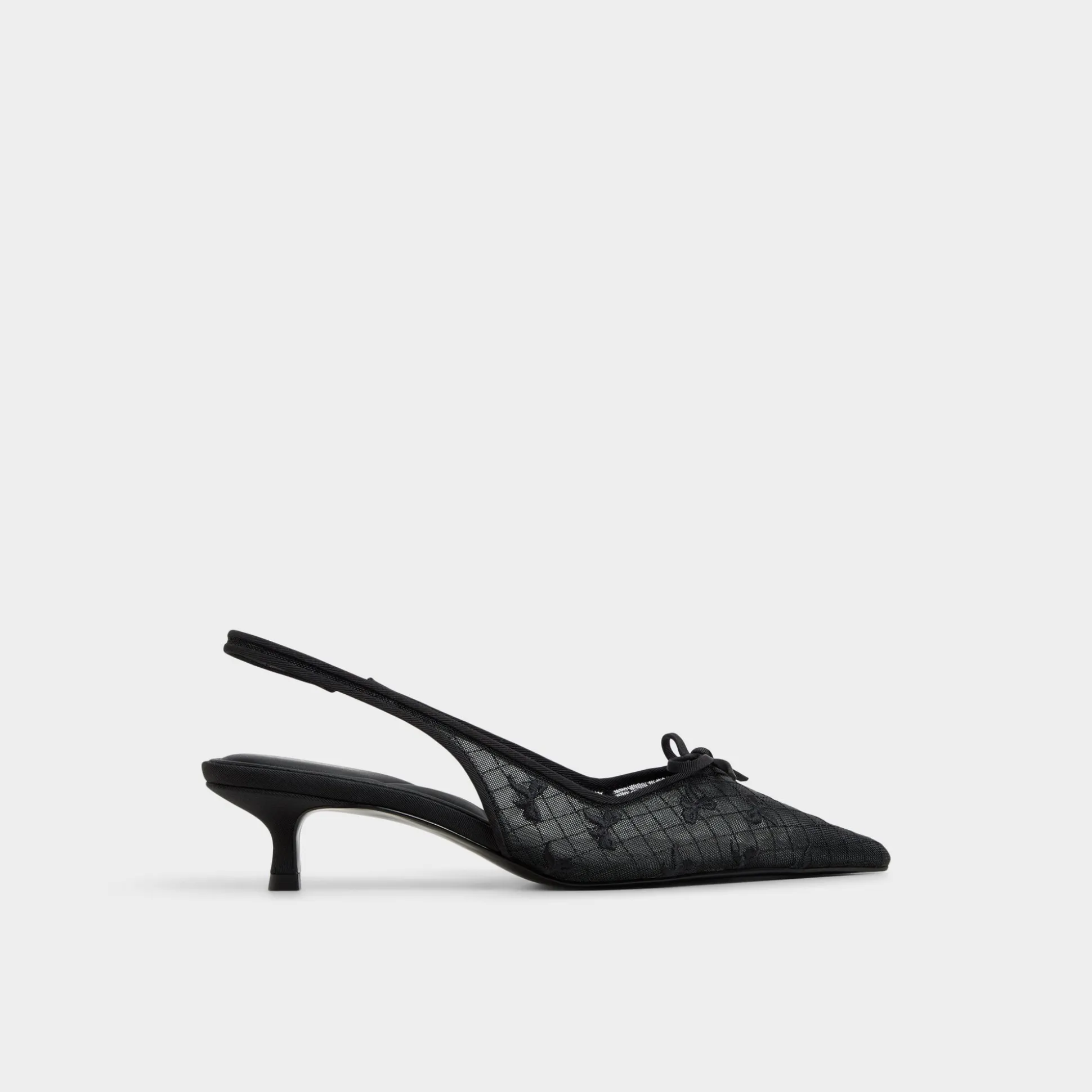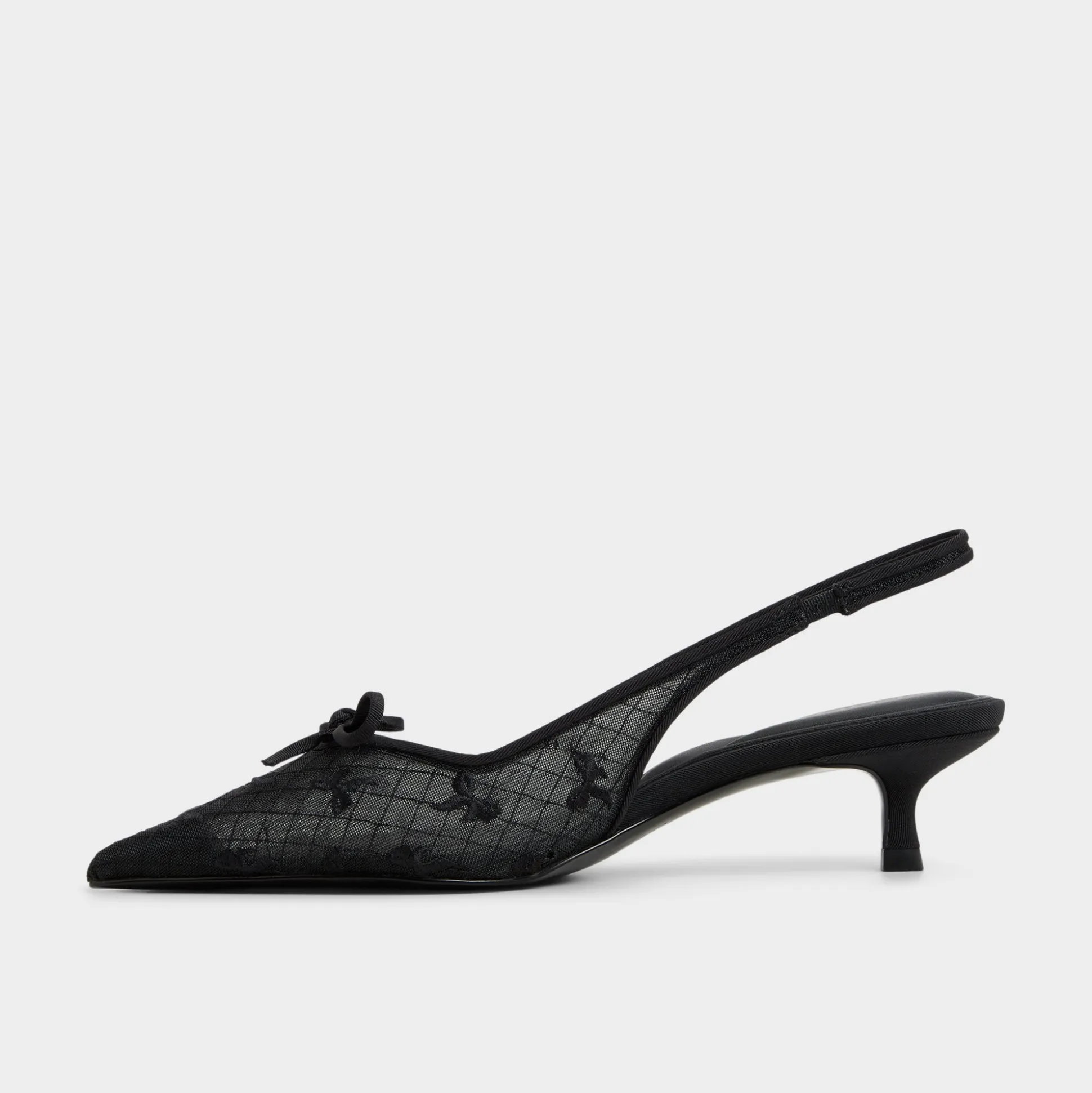 Sheer floral lace drapes the pointy toe of this slingback, crowned by a tiny bow and a polished kitten heel, turning a classic silhouette into a glam-ready statement with feminine confidence. Pair with satin slip dresses for cocktails, or tailored pants for gallery openings tonight.