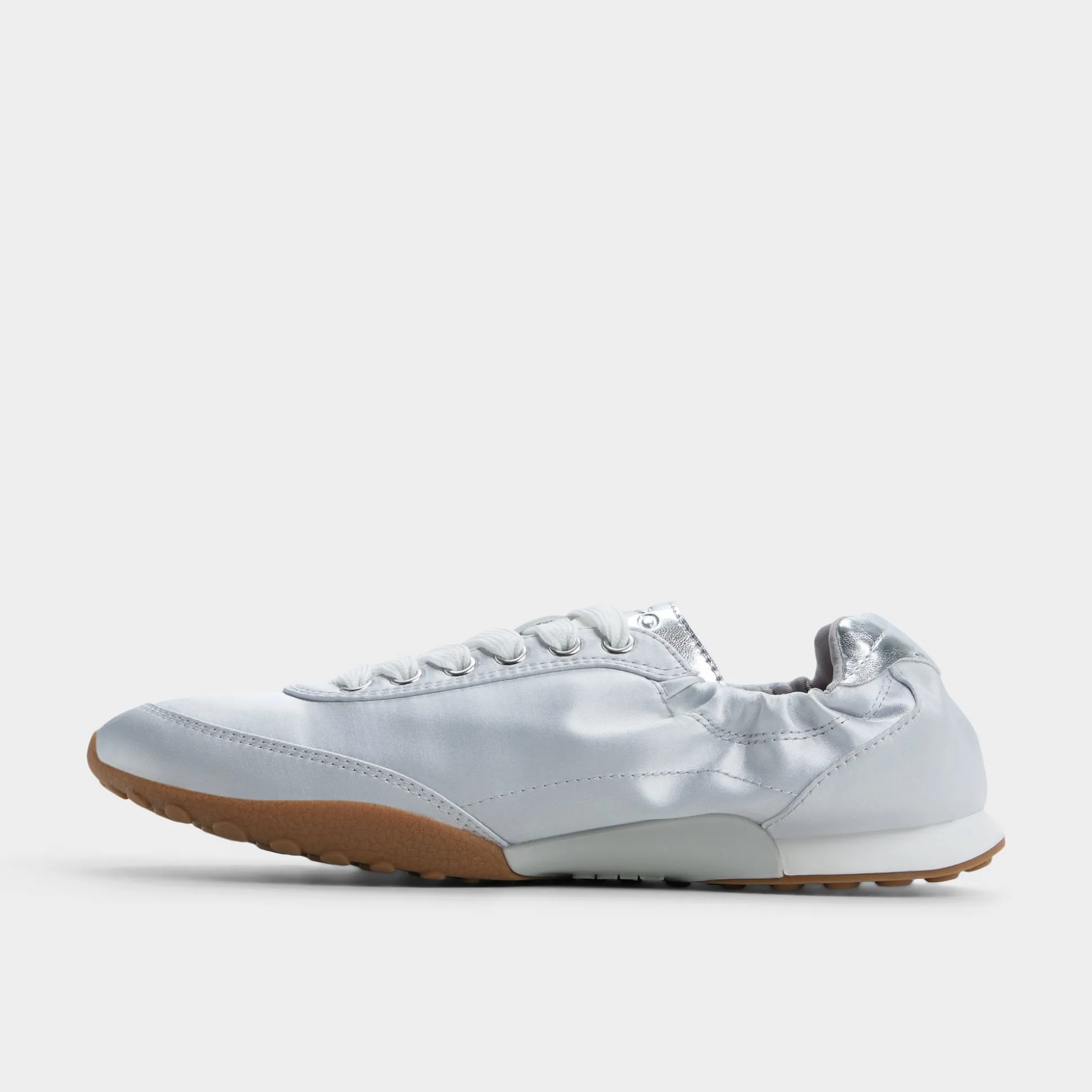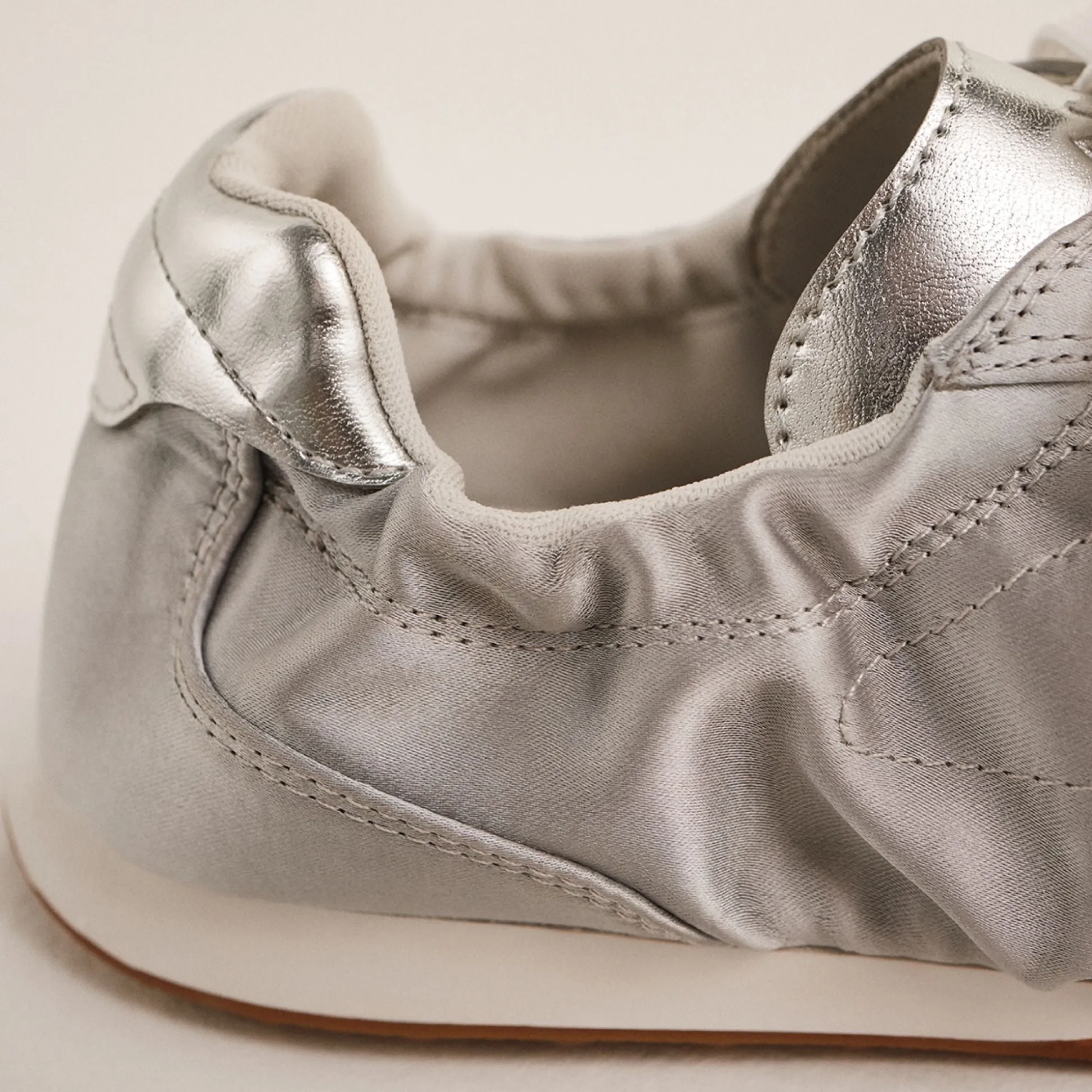 A ballet-flat meets track sneaker hybrid, a silver upper that catches streetlights, turning every stride into a celebration while a stretchy scrunch collar keeps on and off effortless for city hops and coffee runs alike. Pair it with cropped denim for daytime errands, or swap in a slip dress for evening rooftop drinks.