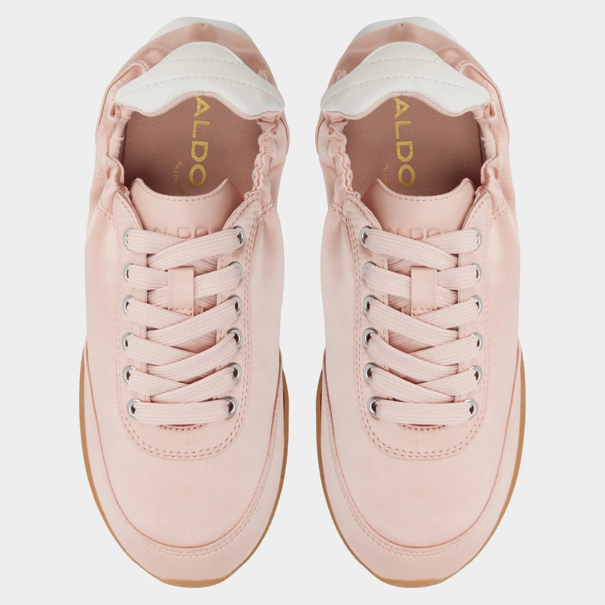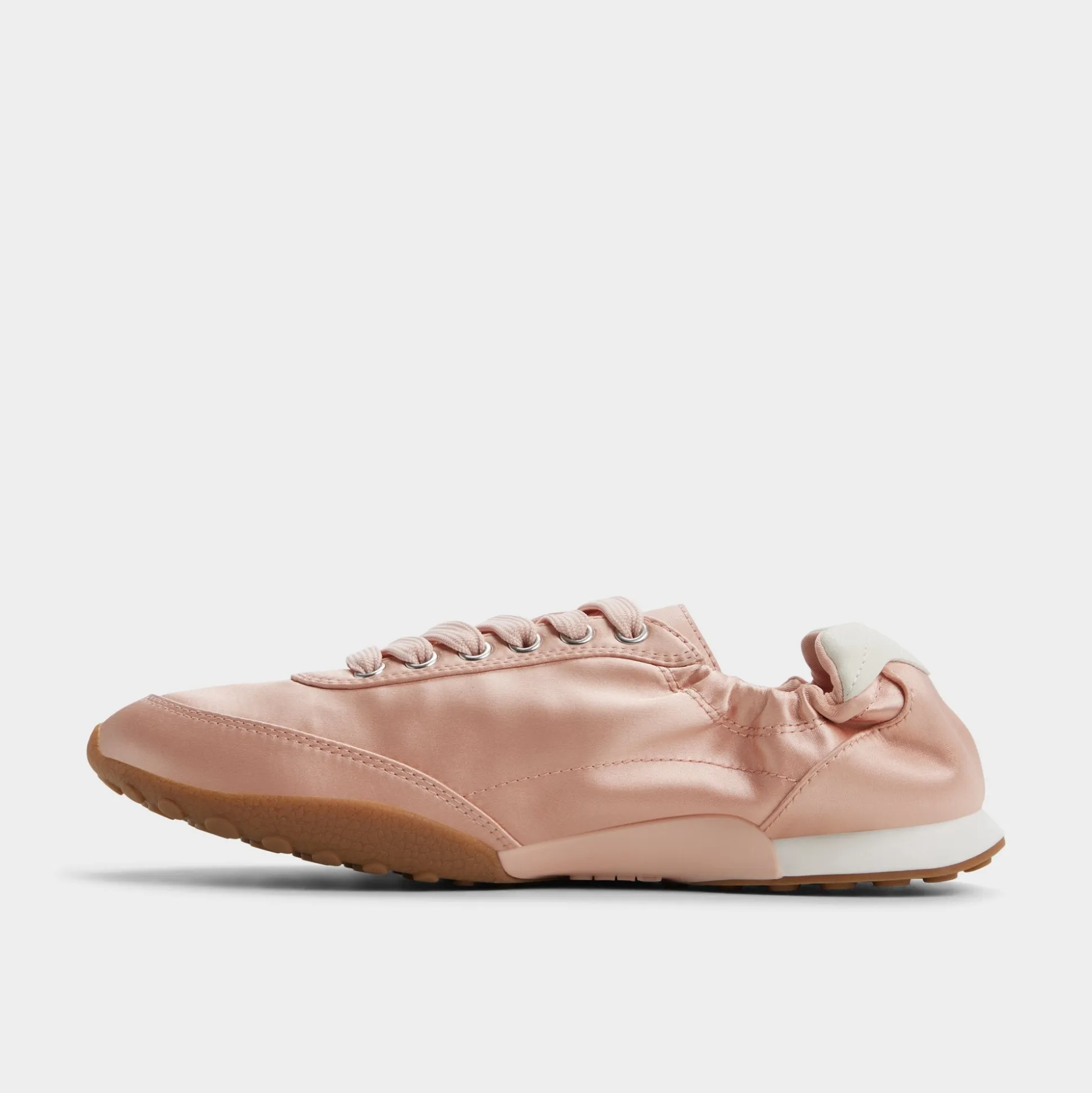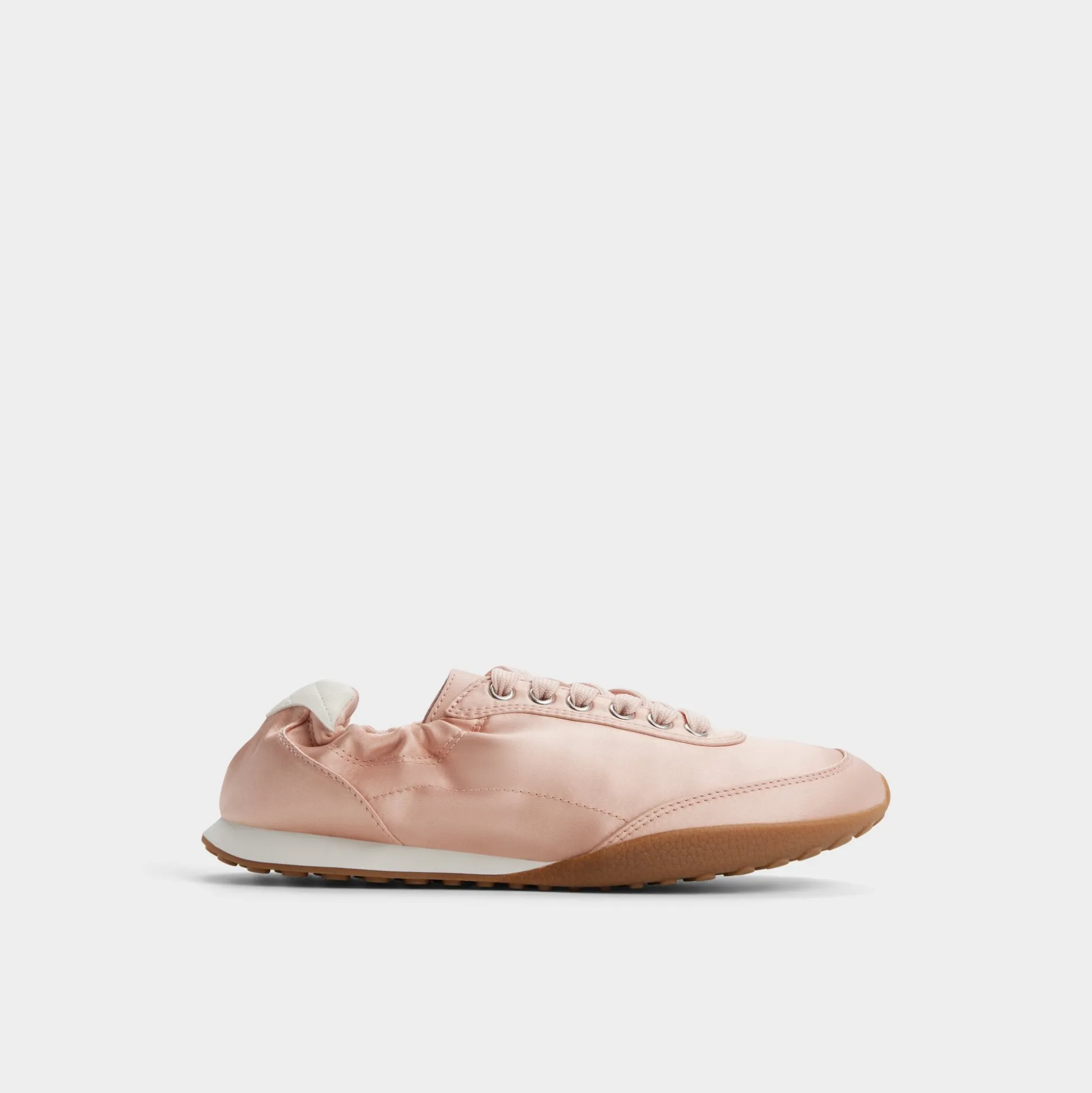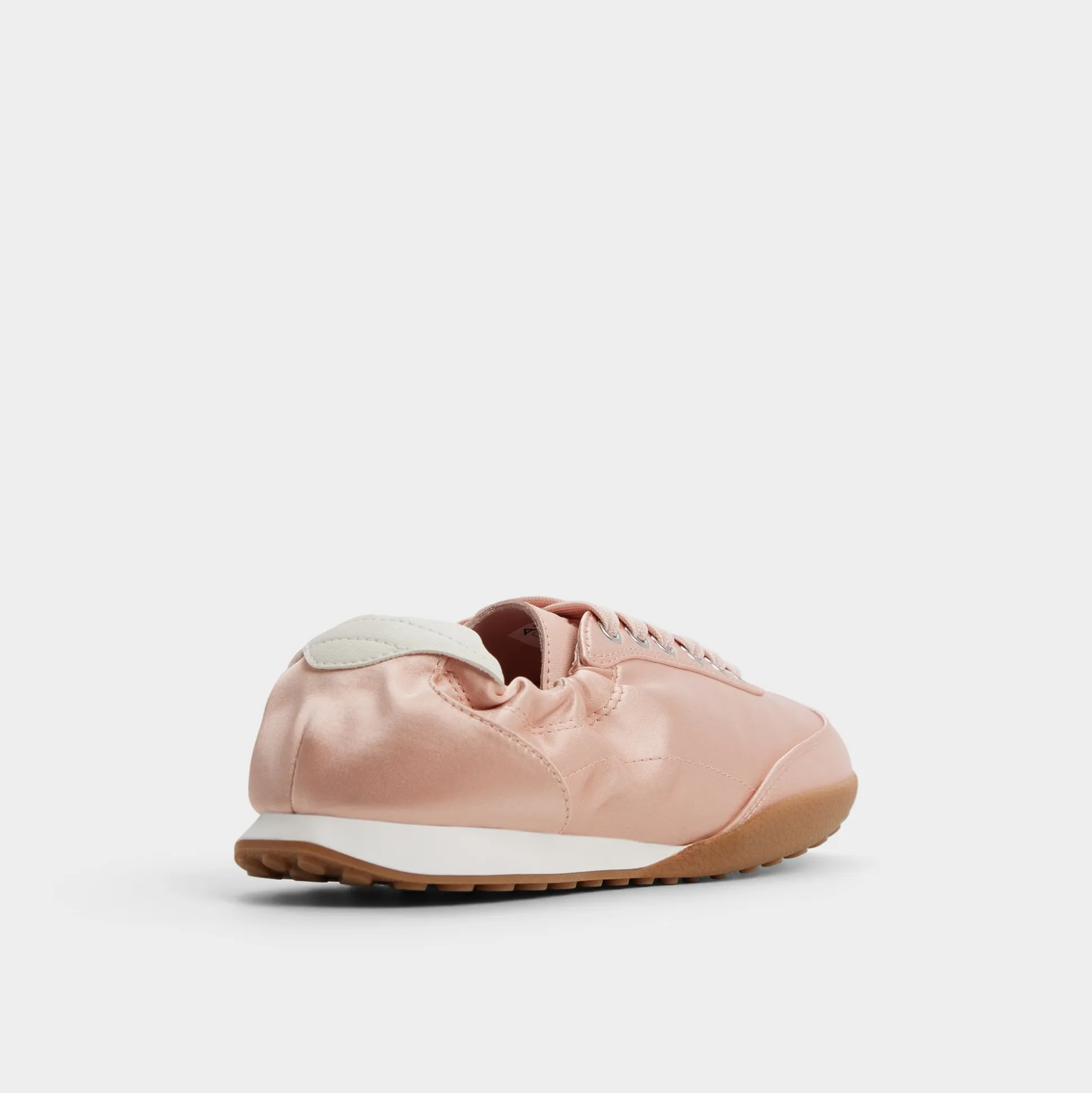 Blush satin glides over a sleek low-top, while ruched ankle detailing wraps the silhouette and lightweight soles cushion every sprint from coffee cart to calls. Pair with tailored shorts for a city cafe moment, or slip into a flowing midi as rooftop lights wake the night.