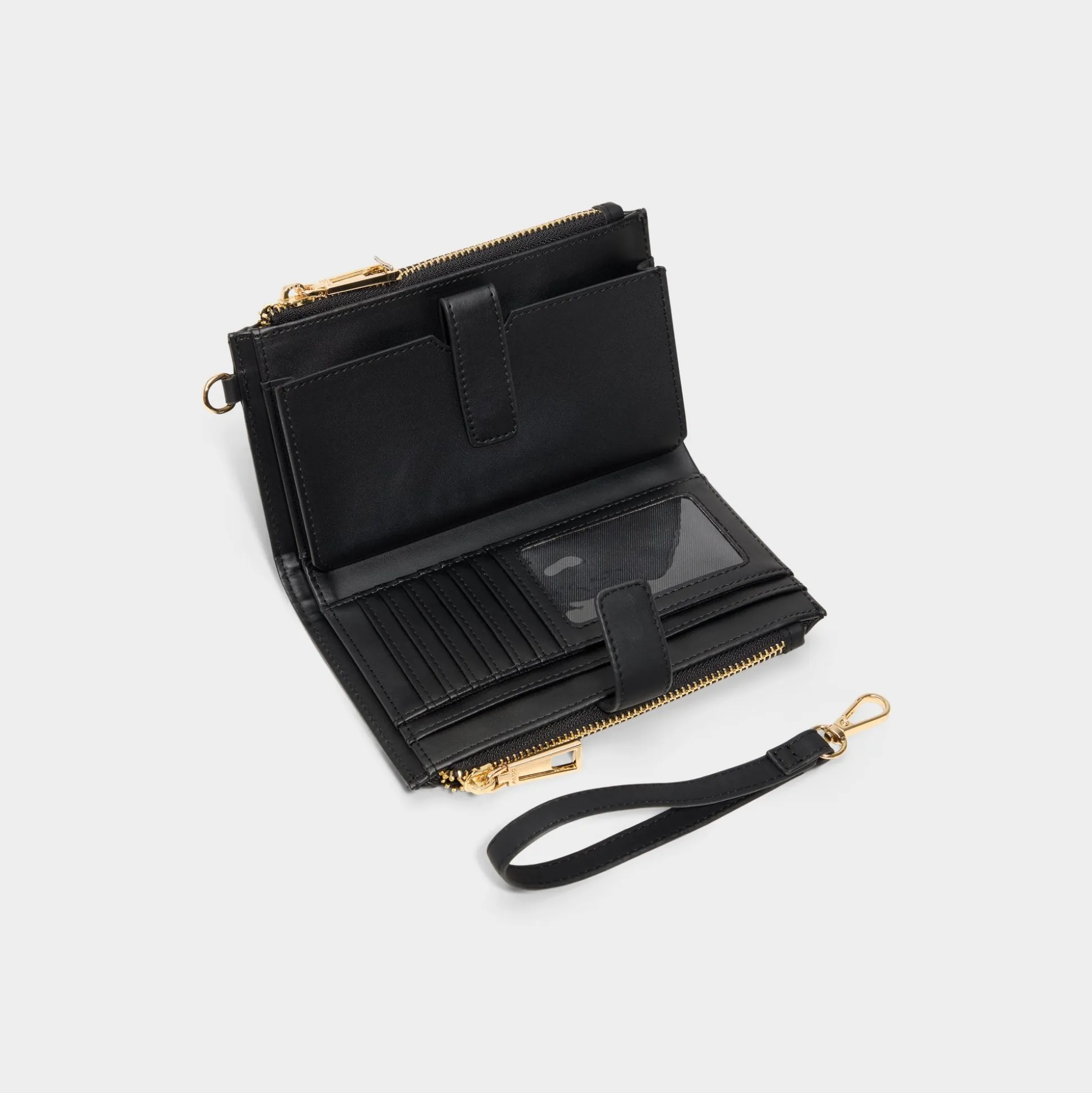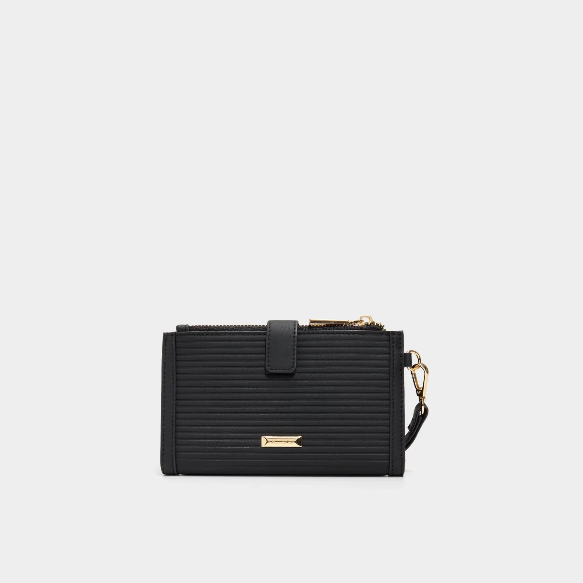 Fine ribbed panels contour this sleek black wristlet, punctuated by minimalist gold hardware, while a detachable loop strap lets you switch from hands-free city dash to polished clutch in seconds. Carry it with a slip dress for rooftop cocktails, or tuck it inside a tote for commuting days, finishing looks with effortless polish.