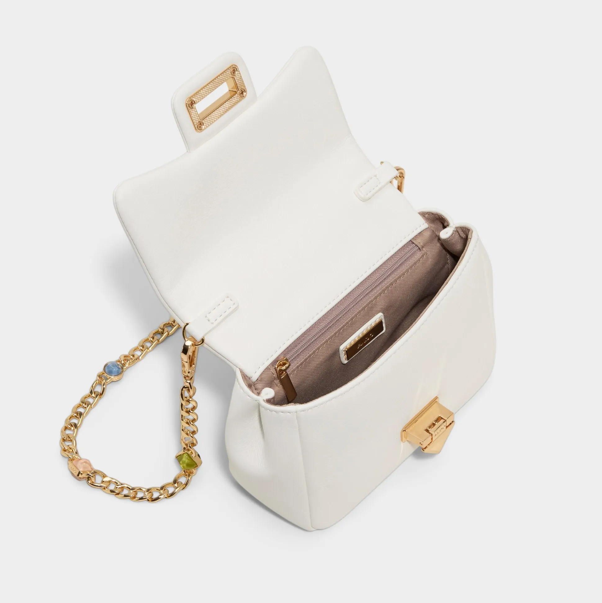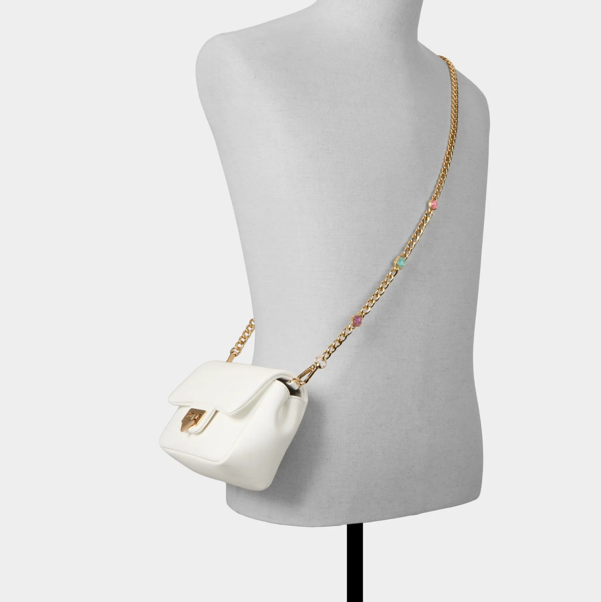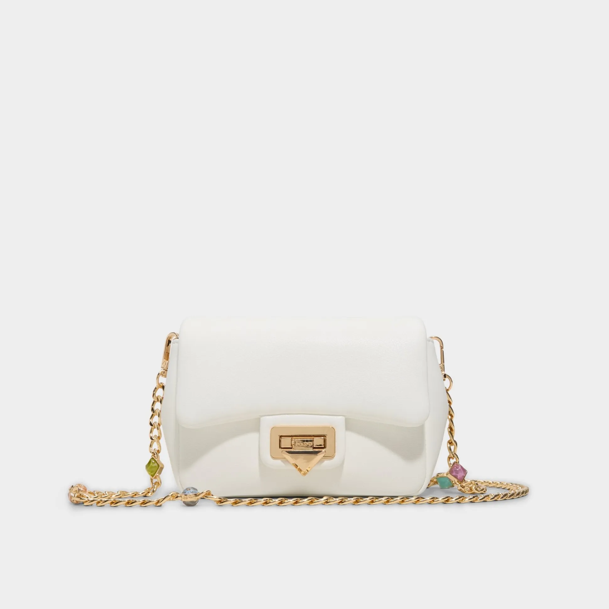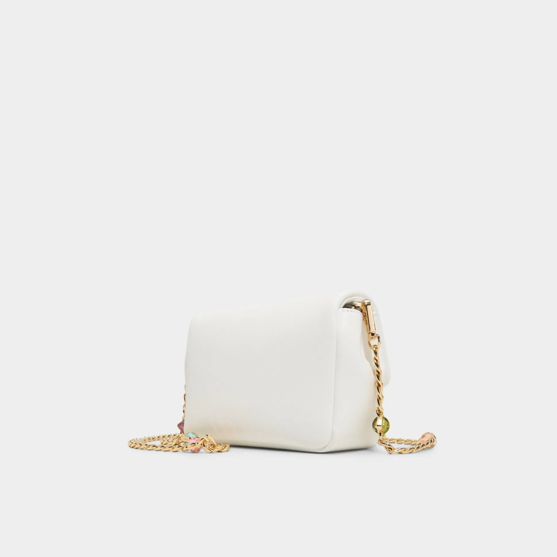Escape into effortless elegance with this white crossbody bag, complete with a gleaming gold chain adorned with sparkling gem accents. The perfect companion for sun-soaked getaways and carefree adventures, it combines timeless style with just the right touch of glamour. Carry your essentials in chic comfort.