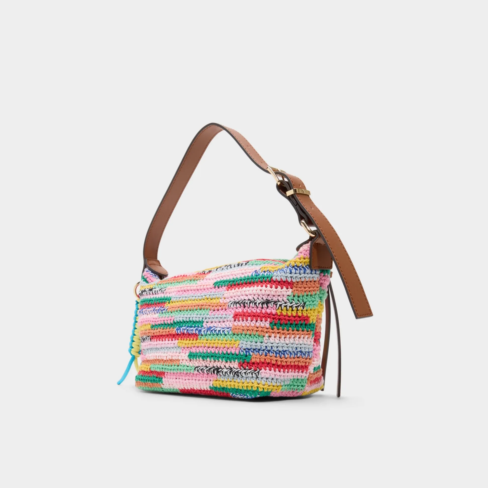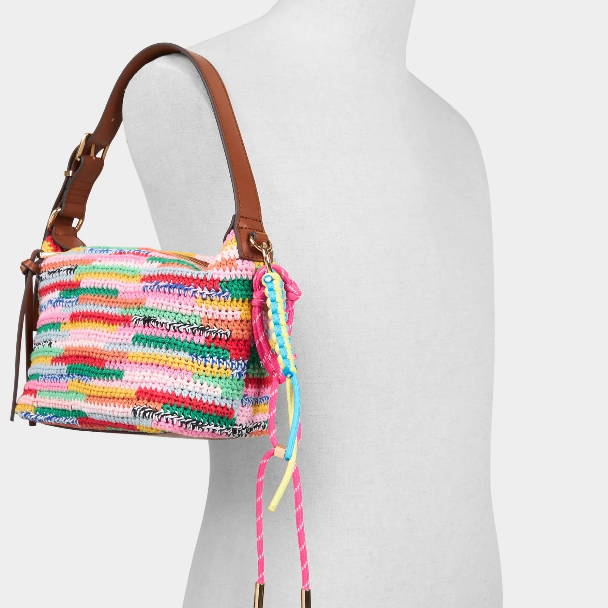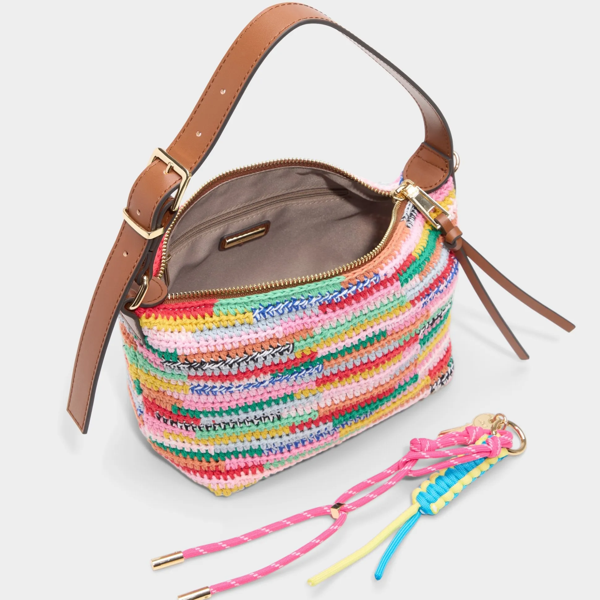 Crocheted rainbow stripes illuminate this mini hobo bag, turning beach-bar spirit into a wearable mood, with gold hardware and a braided tassel charm adding playful polish. Carry it with a breezy sundress to morning markets or sling it over cutoff shorts for sunset concerts, finishing looks with carefree ease.