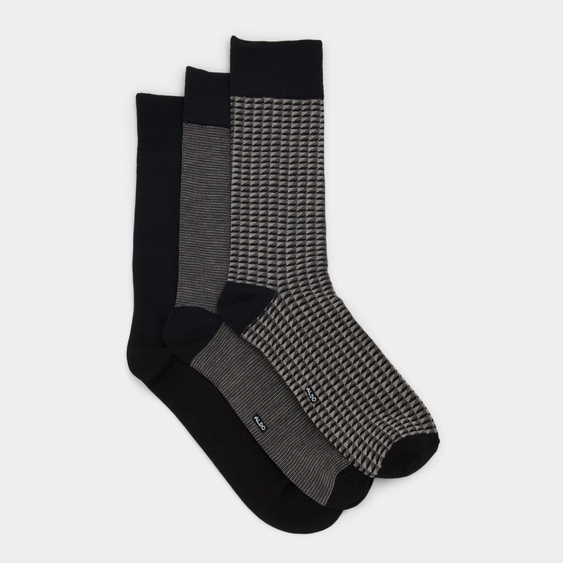 Monochrome stripes mix with solid ribs and mini-houndstooth knit in this three-pair pack spun from breathable cotton that keeps feet cushy from weekday commutes to late-night karaoke. Let them peek under cropped trousers at the office or ground sneakers and sweats on Sunday errand loops tying every look together.