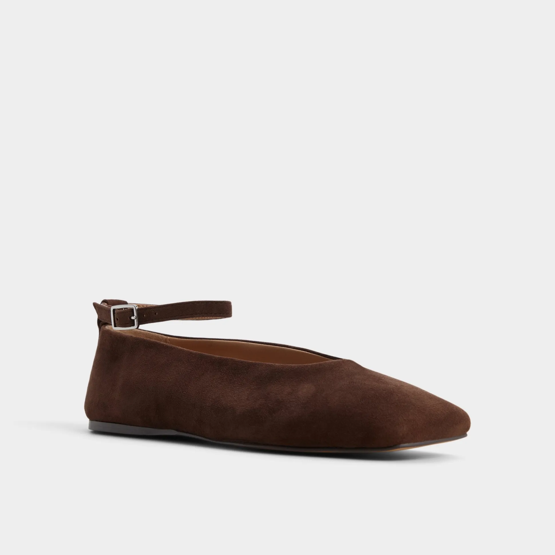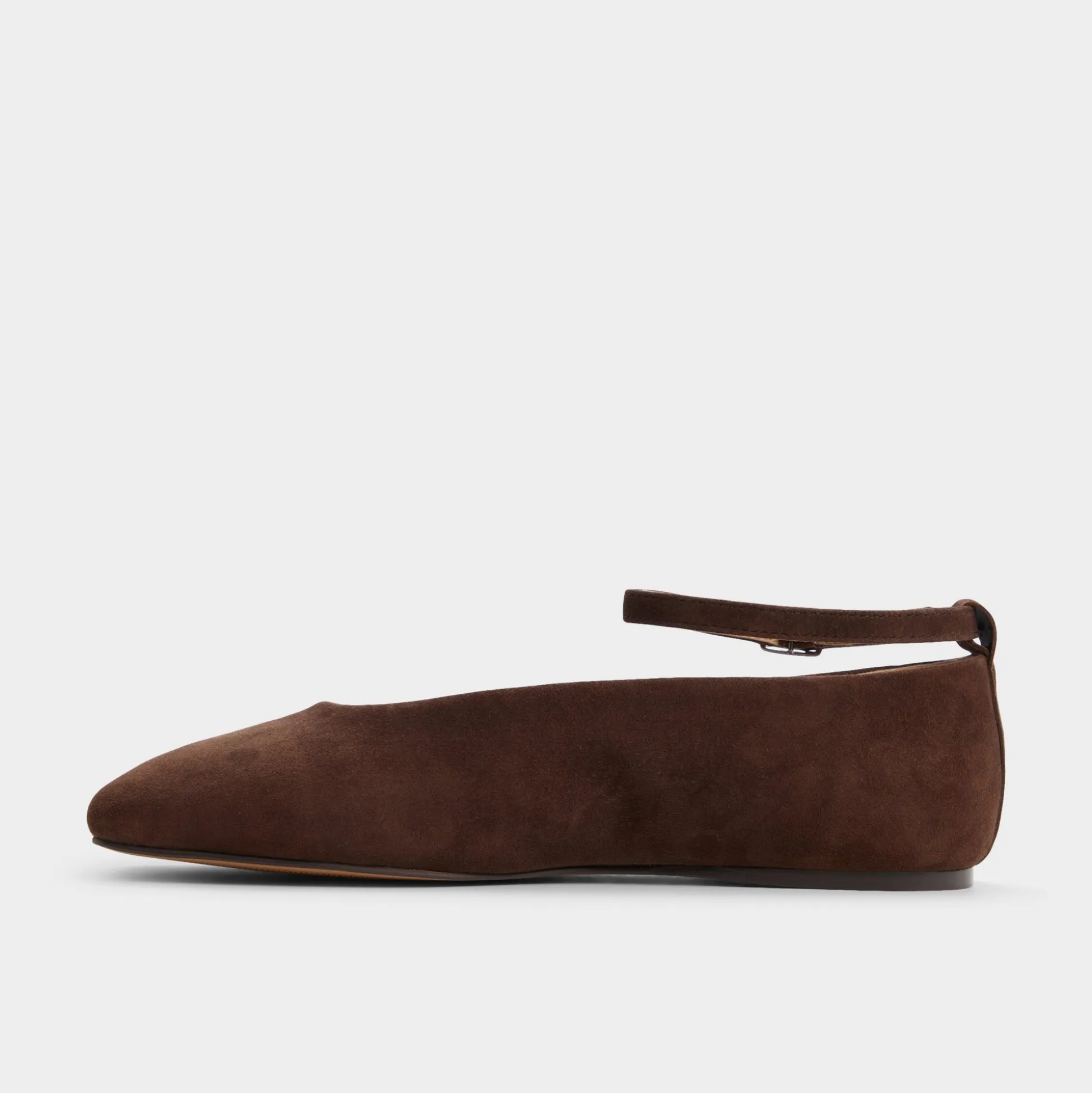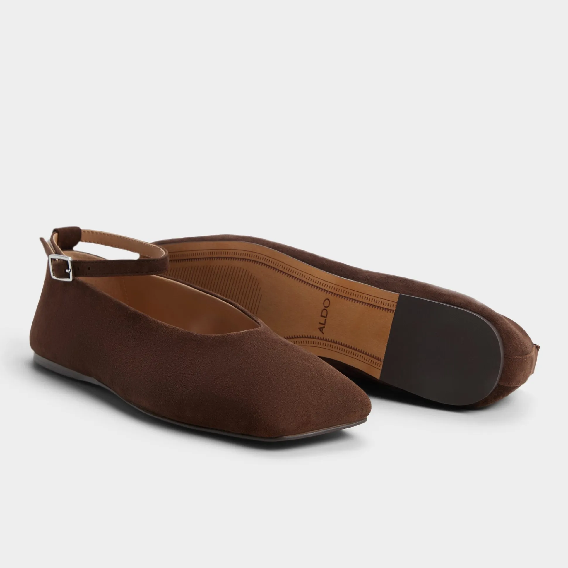 Chocolate suede hugs the foot like a second skin, while a slender buckle strap props a ballet-inspired silhouette on a light flat that turns sidewalks into stages. Pair with cropped chinos for brainstorms or ground a satin skirt when gallery nights call, letting easy comfort meet city-ready polish all day long.