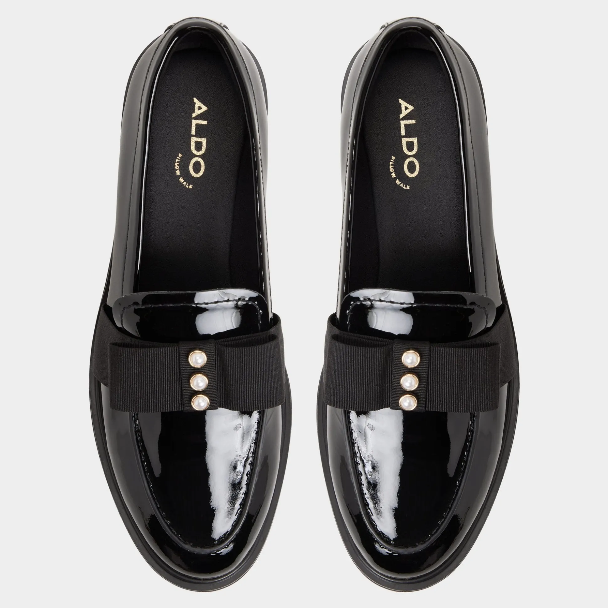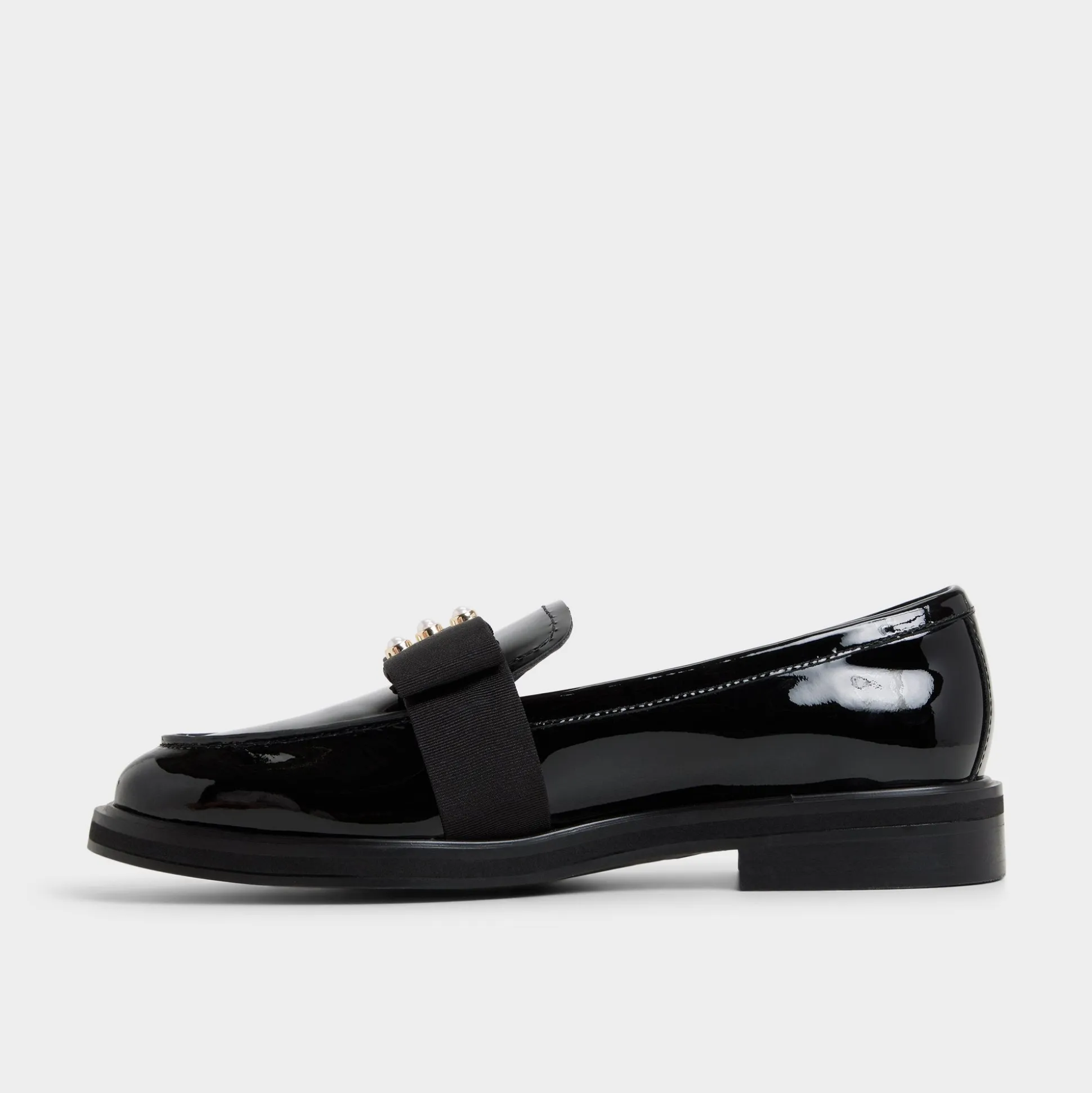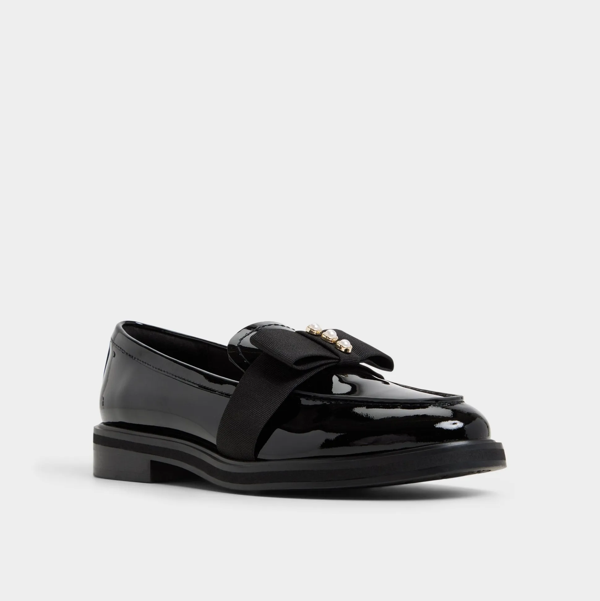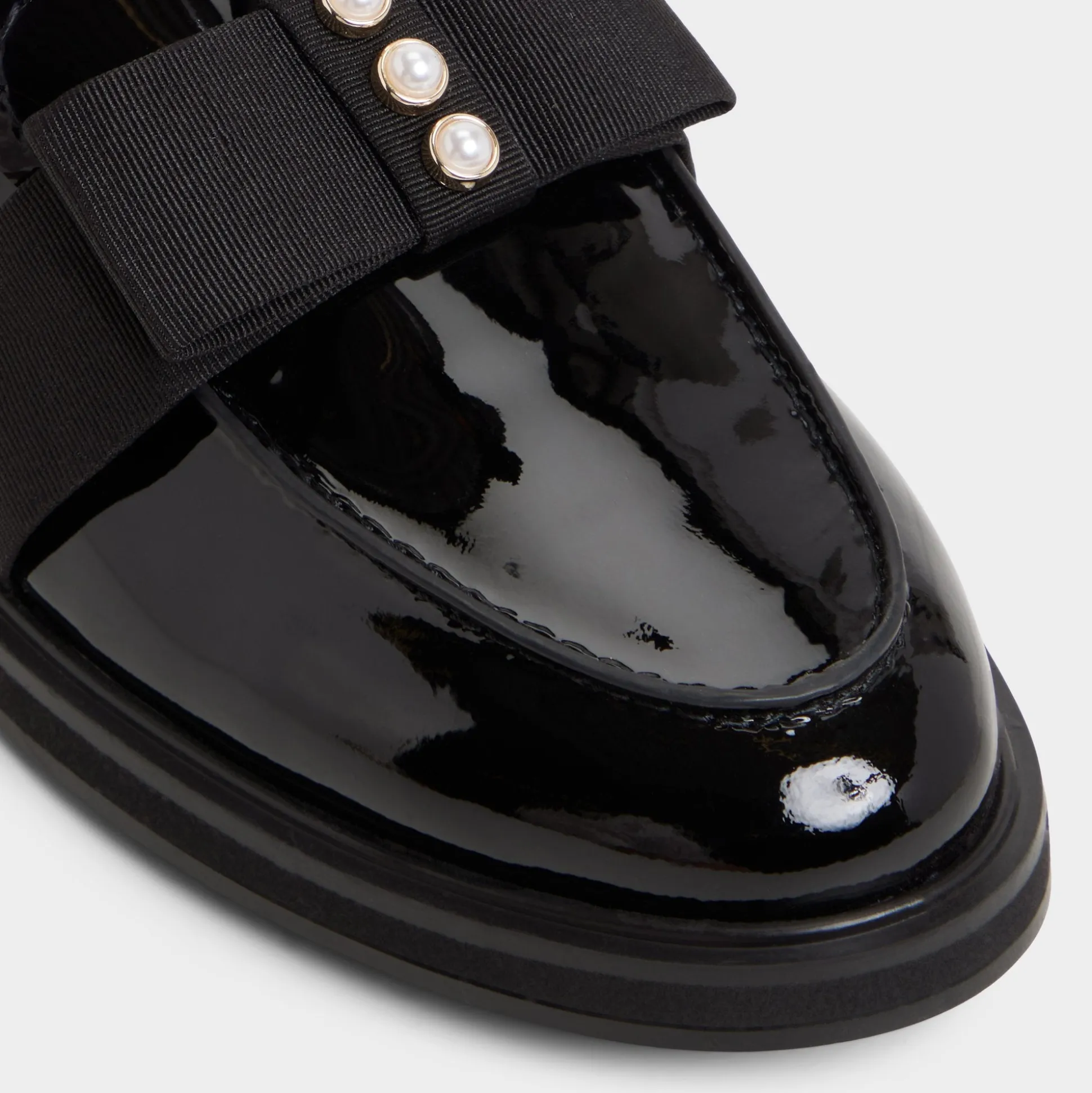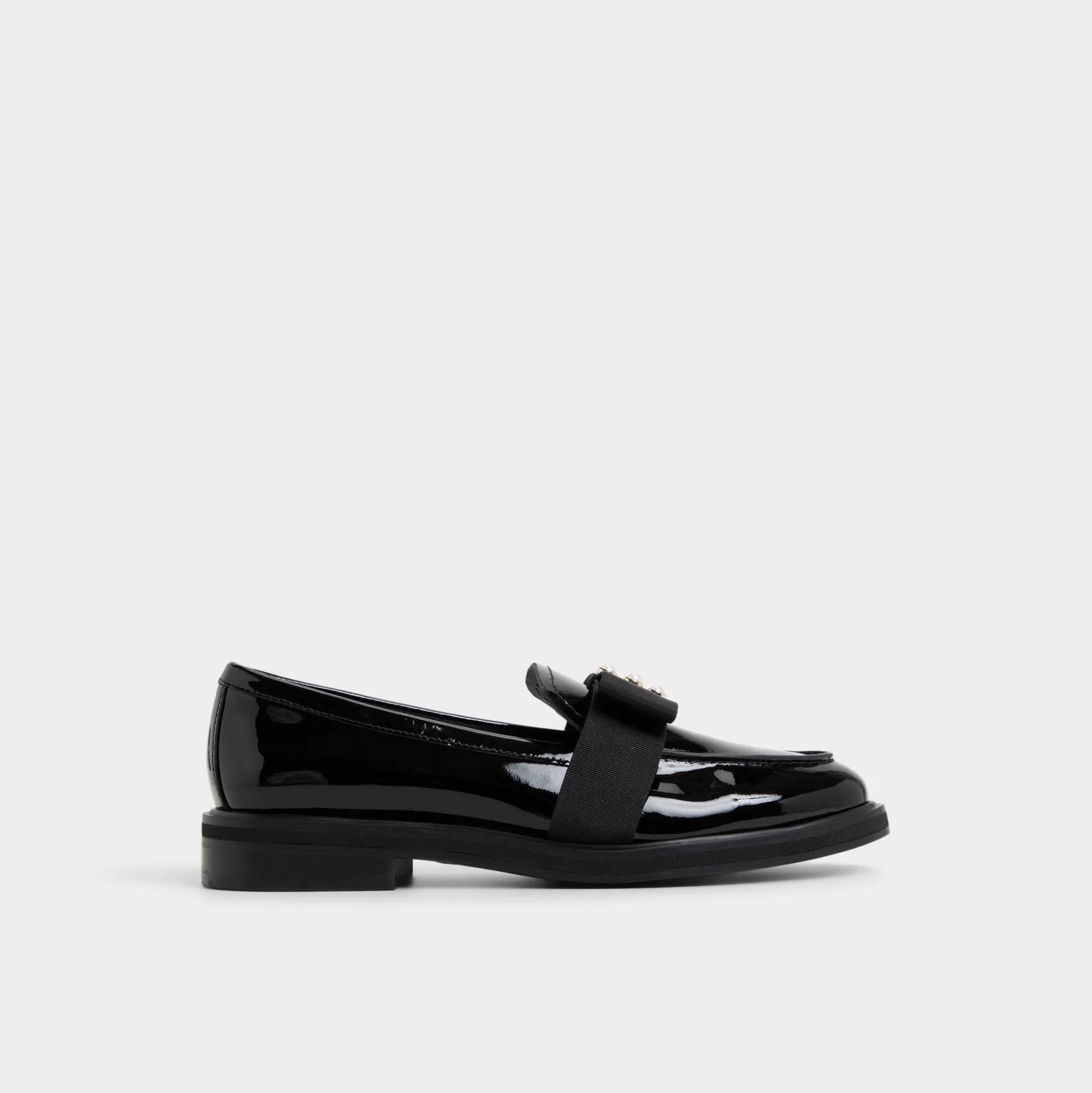 Midnight-gloss patent leather keeps this loafer looking freshly polished, while a wide grosgrain strap dotted with metal studs nods to rebellious charm, all riding a cushy rubber cup sole that makes city strides whisper. Pair with cropped trousers for power-lunch reviews, or ground a sequinned mini when late-night shows call for low-key shine.