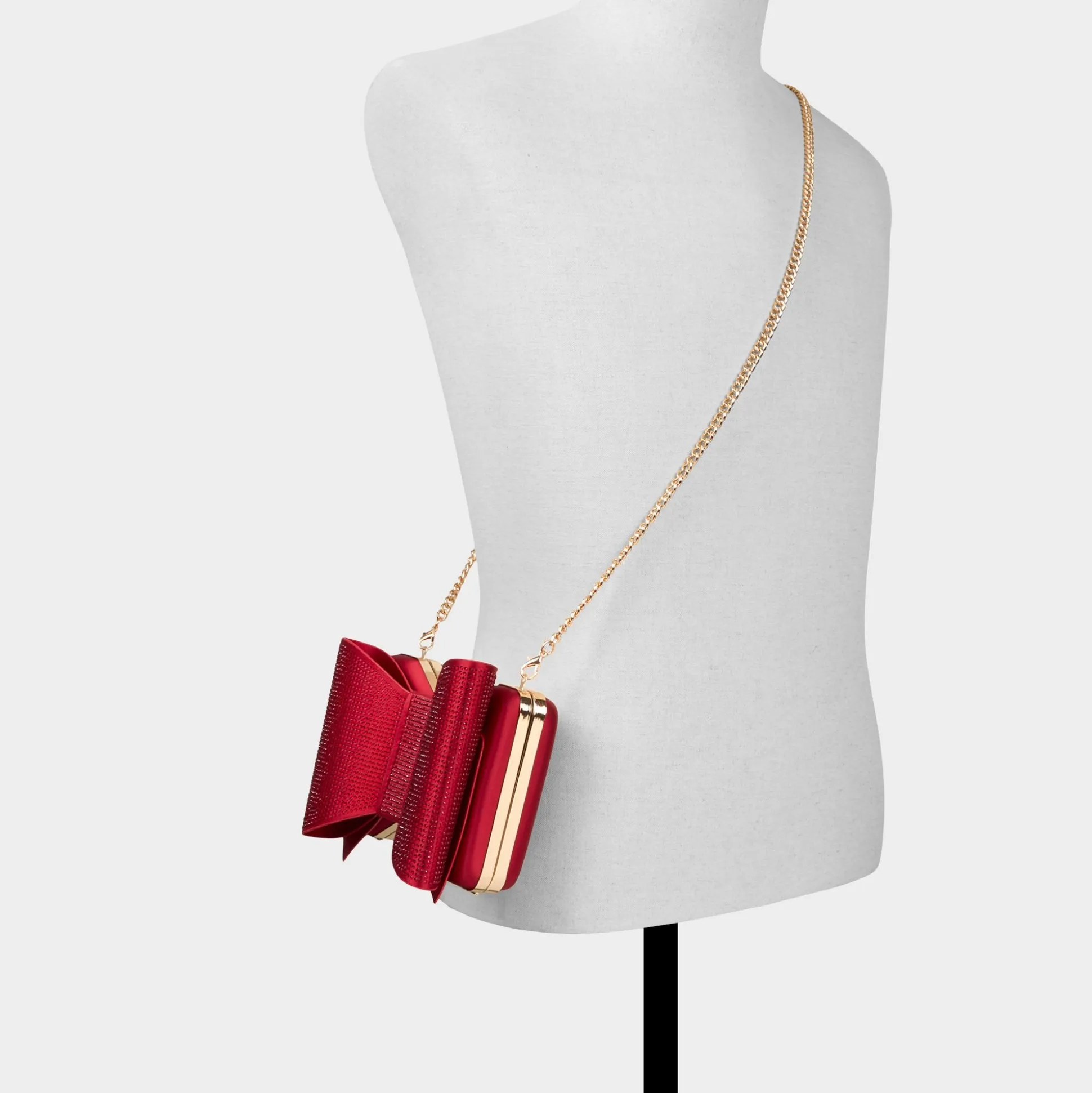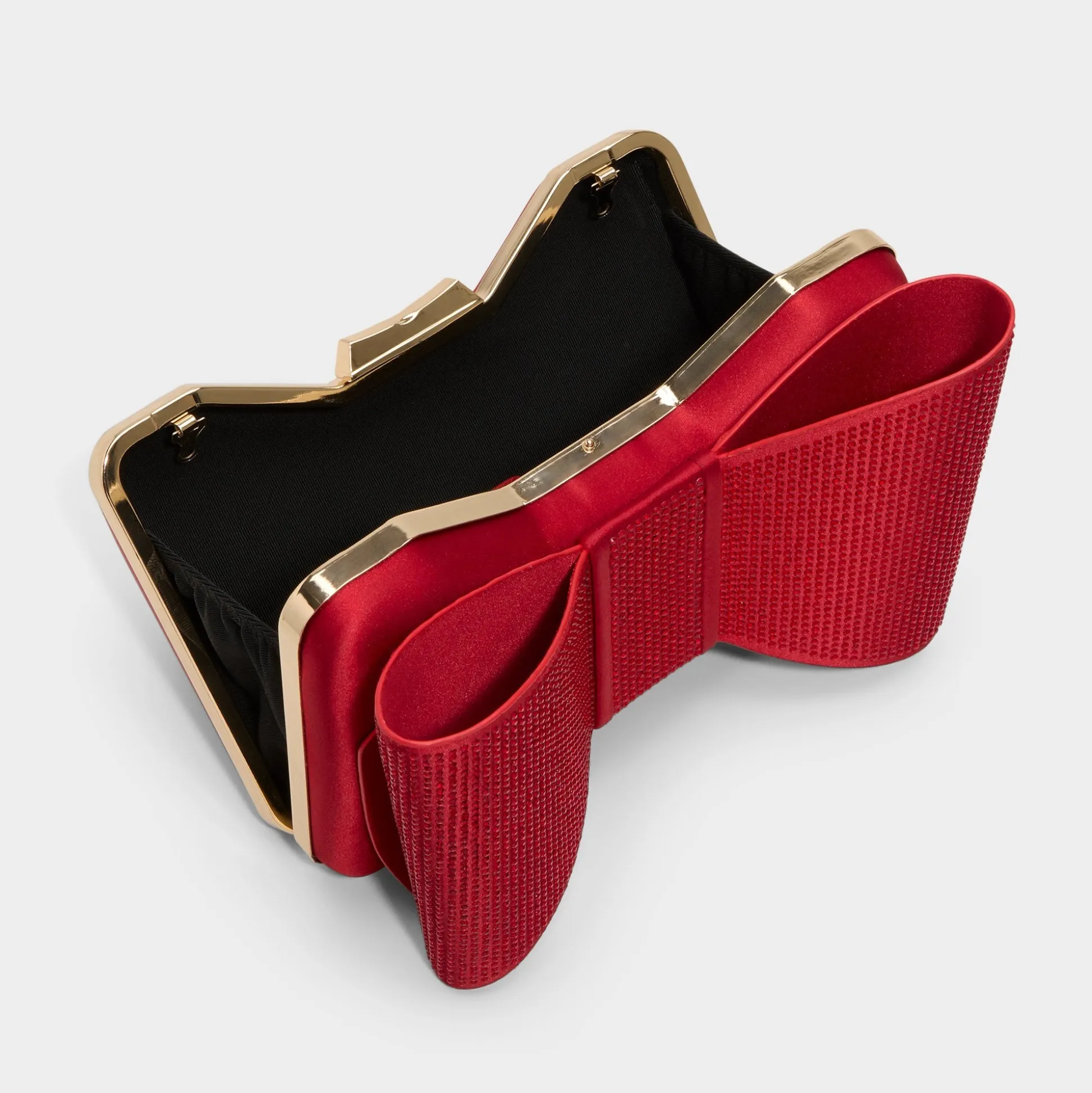 Micro rhinestones crown a silk bow clutch, turning a practical evening essential with space for cards and lipstick into a twinkling focal point you reach for from gala arrivals to late-night cab rides. Top it with a tailored blazer for city-night looks or keep it simple with a white tee and jeans for day-to-night ease.