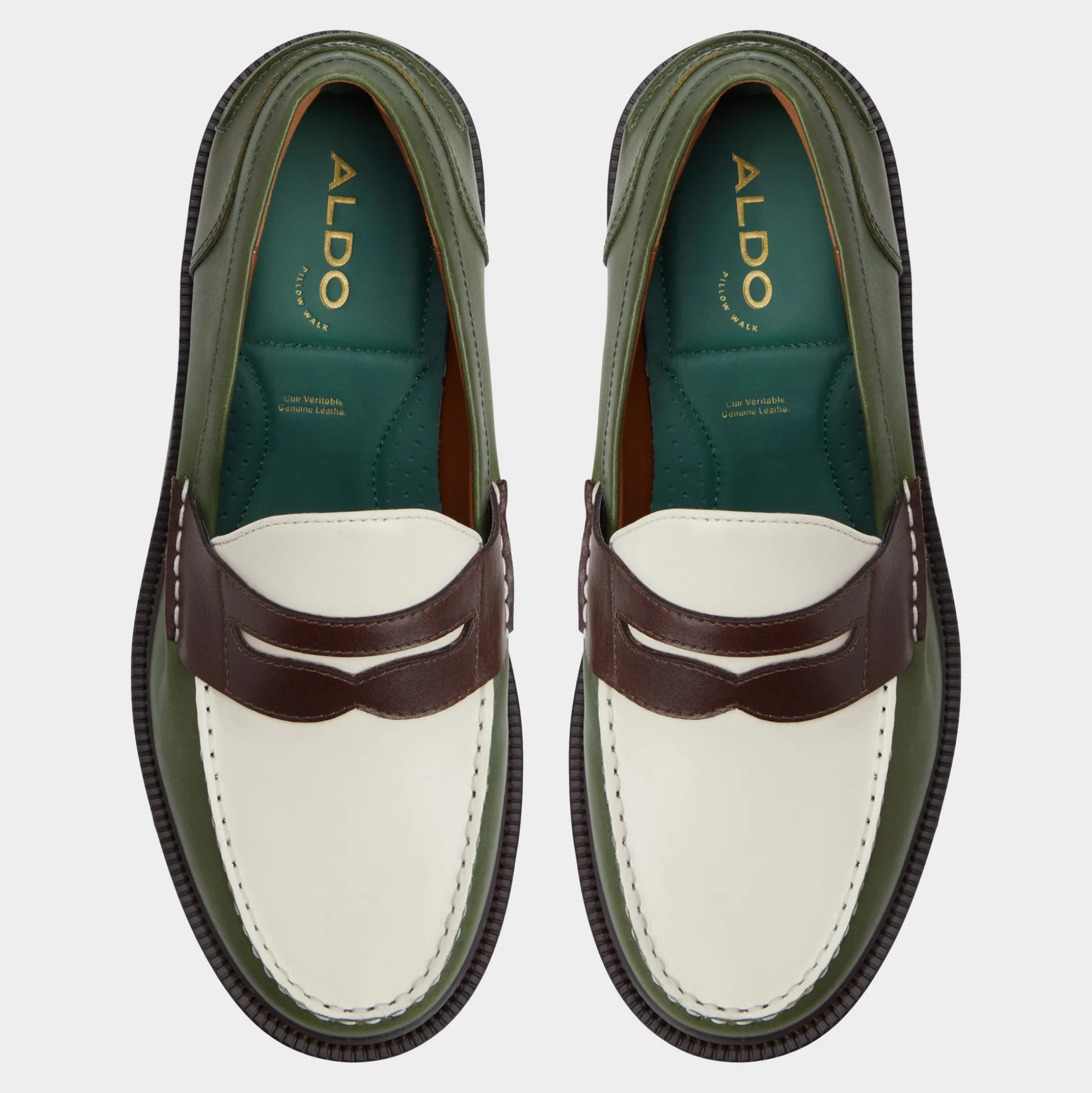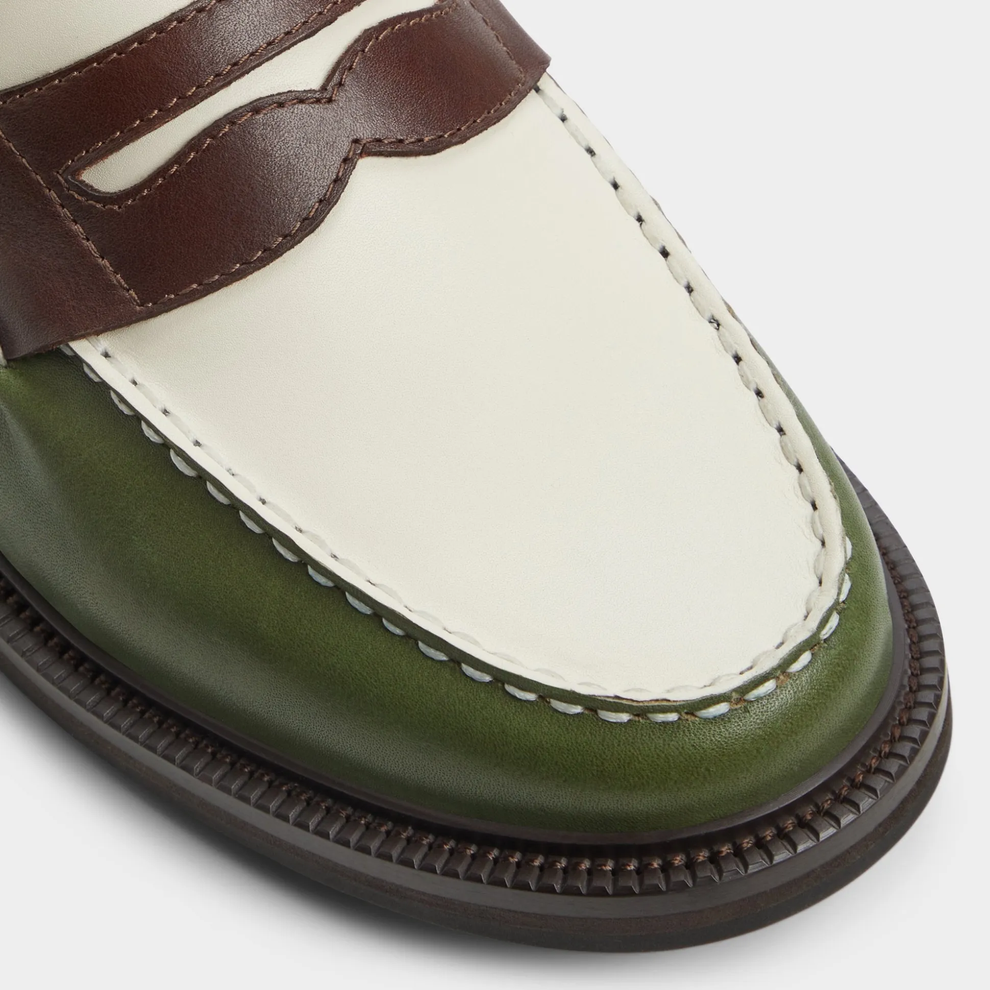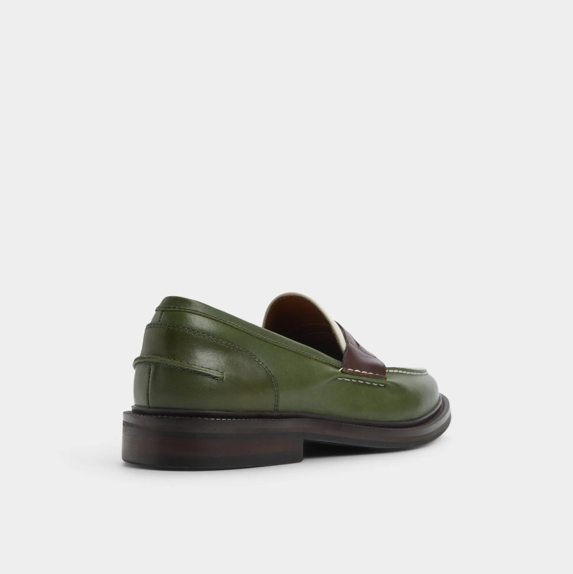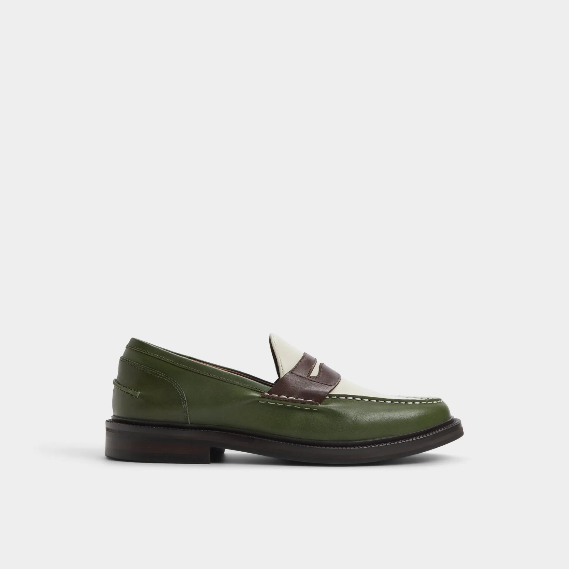 Deep-forest leather meets a cream vamp and chocolate penny strap, with bright piping delivering color-blocking and a stand-out silhouette that travels from boardroom days to after-hours without missing a beat. Team it with navy suiting for client lunches, or roll with cuffed denim at art openings for confident, city-ready polish.