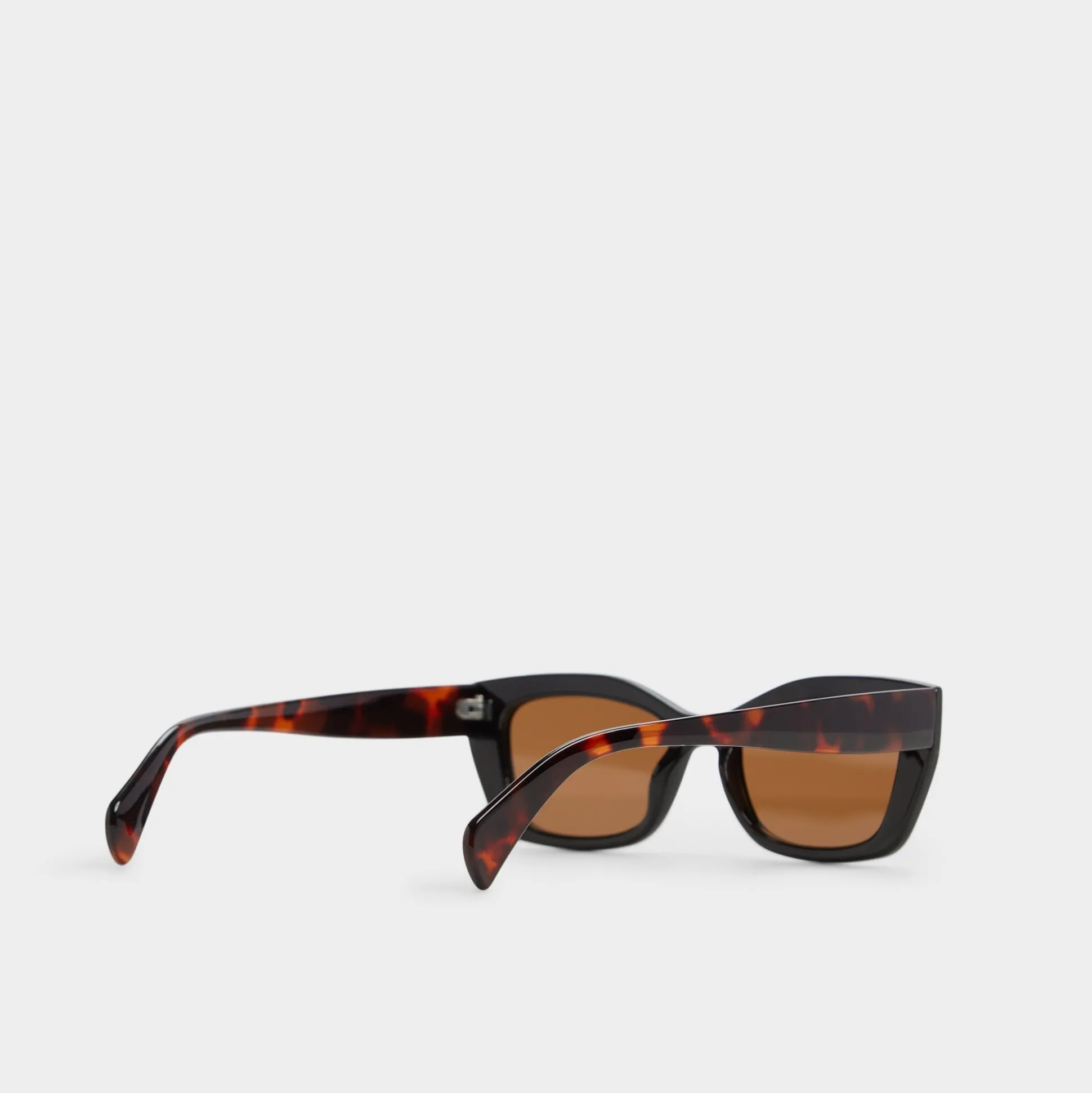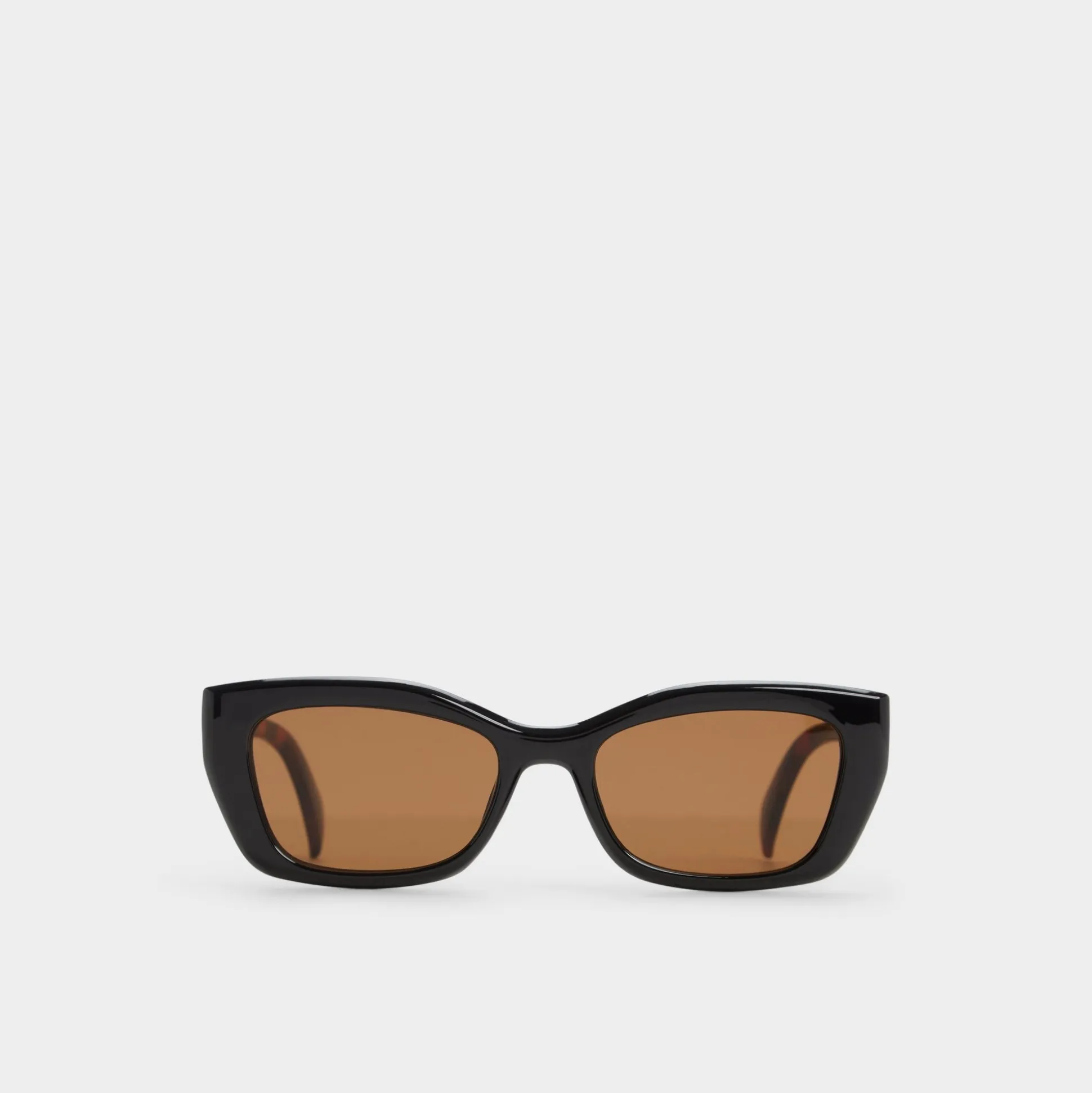 Rectangular frames in glossy black bring a late-90s vibe with sharp corners and warm brown lenses that soften light and sharpen reflections. Pair them with a satin slip for rooftop brunch or a graphic tee and cargo pants for city errands, adding effortless cool.