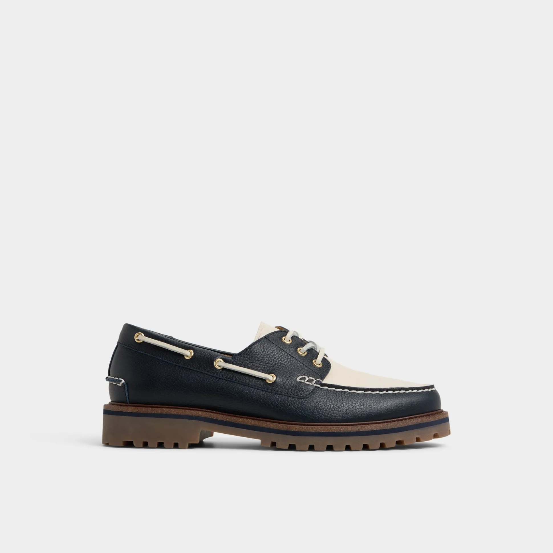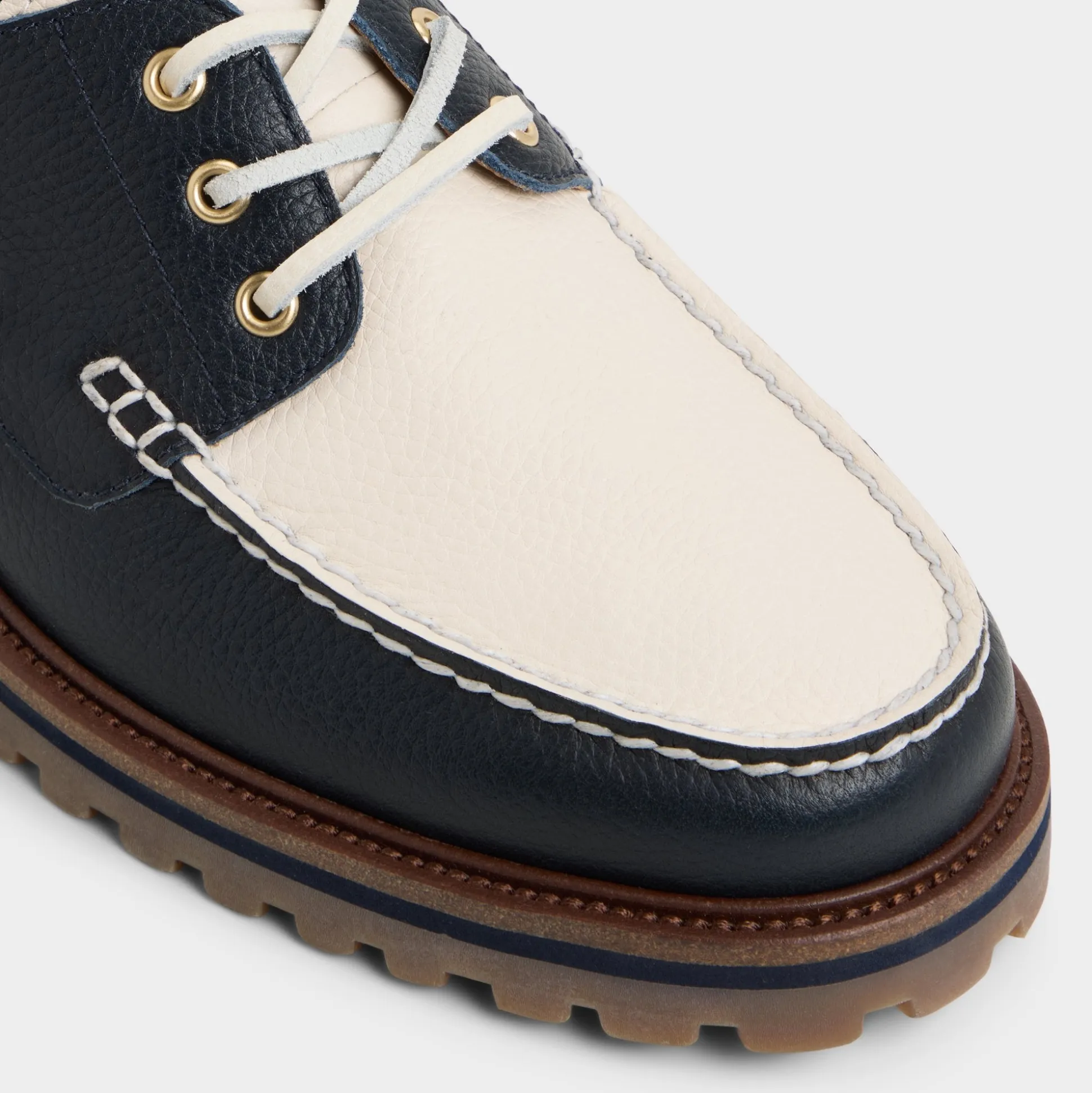 Pebbled navy leather sets the boat shoe apart, with deep-cut lug soles and metal eyelets that fuse rugged function with city-ready polish, while a supple, full-grain upper keeps comfort steady from dockside to downtown. Team it with cuffed chinos for seaside brunches or anchor faded jeans for road trips, the tread grips wet decks and city pavements.