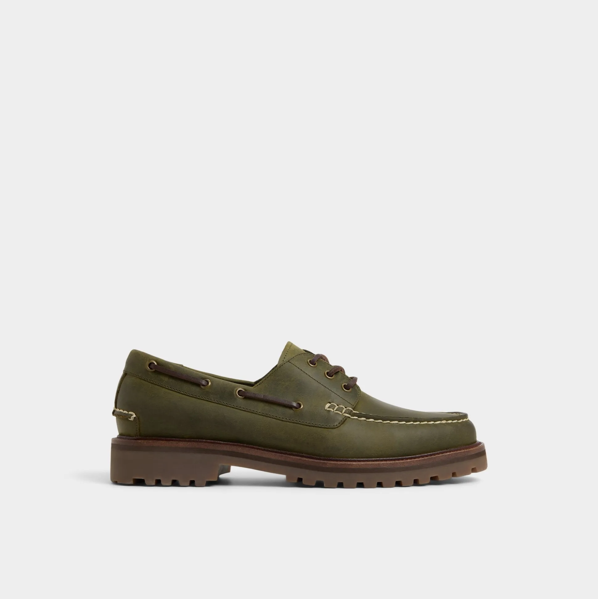 Olive leather with field-khaki topstitching gives these boat shoes a field-khaki vibe, while a lug rubber sole keeps every step confident from docks to city streets. Anchor them with rolled cargos for market trips, or pair with cuffed dark denim for drinks, the olive hue complements relaxed outfits effortlessly.