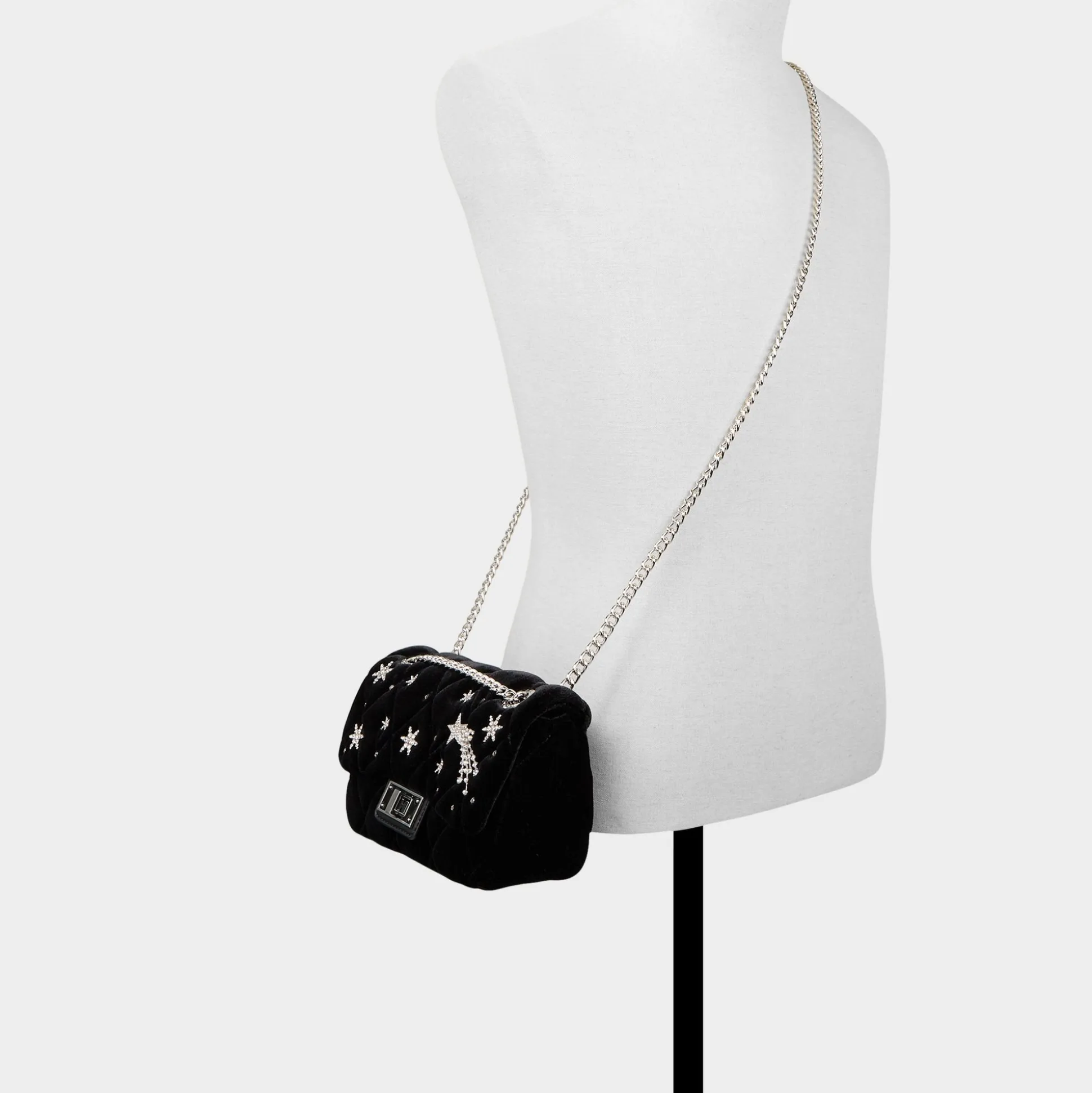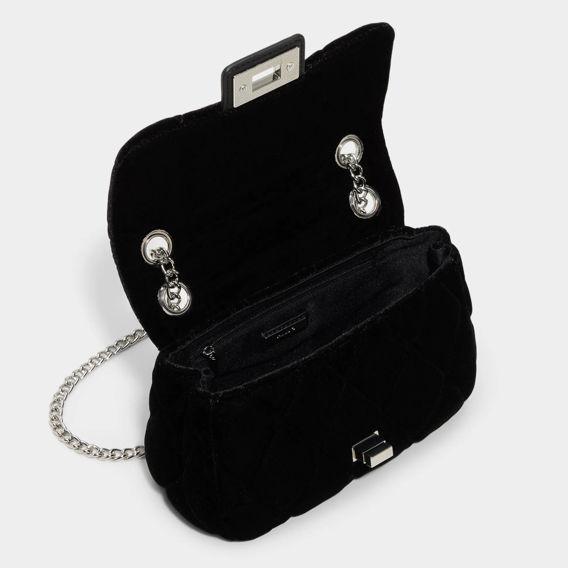 Midnight velvet transforms pocket-sized form into a clutch that hints at a constellation, its crystal panels catching light as a silver chain and a gleaming turn-lock closure finish the look. Sling it with slips for rooftop nights or pair it with tailored denim for gallery days, finishing each moment with a touch of cosmic chic.