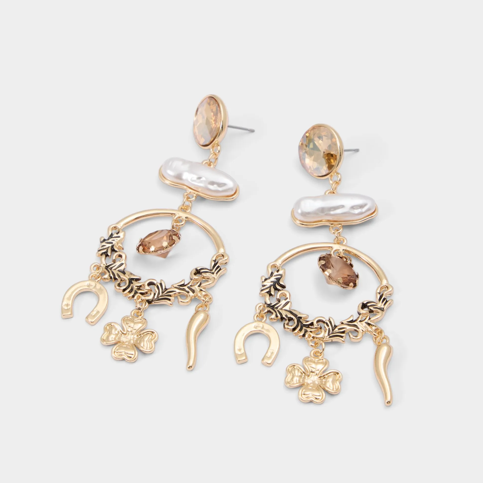 Golden chandelier hoops featuring horseshoe, clover, and chili charms create good vibes beneath baroque pearls and smoky crystals, catching the light as you move. Frame them with a satin slip for rooftop birthdays, or top a cozy knit on campus coffee runs to keep the glow going.