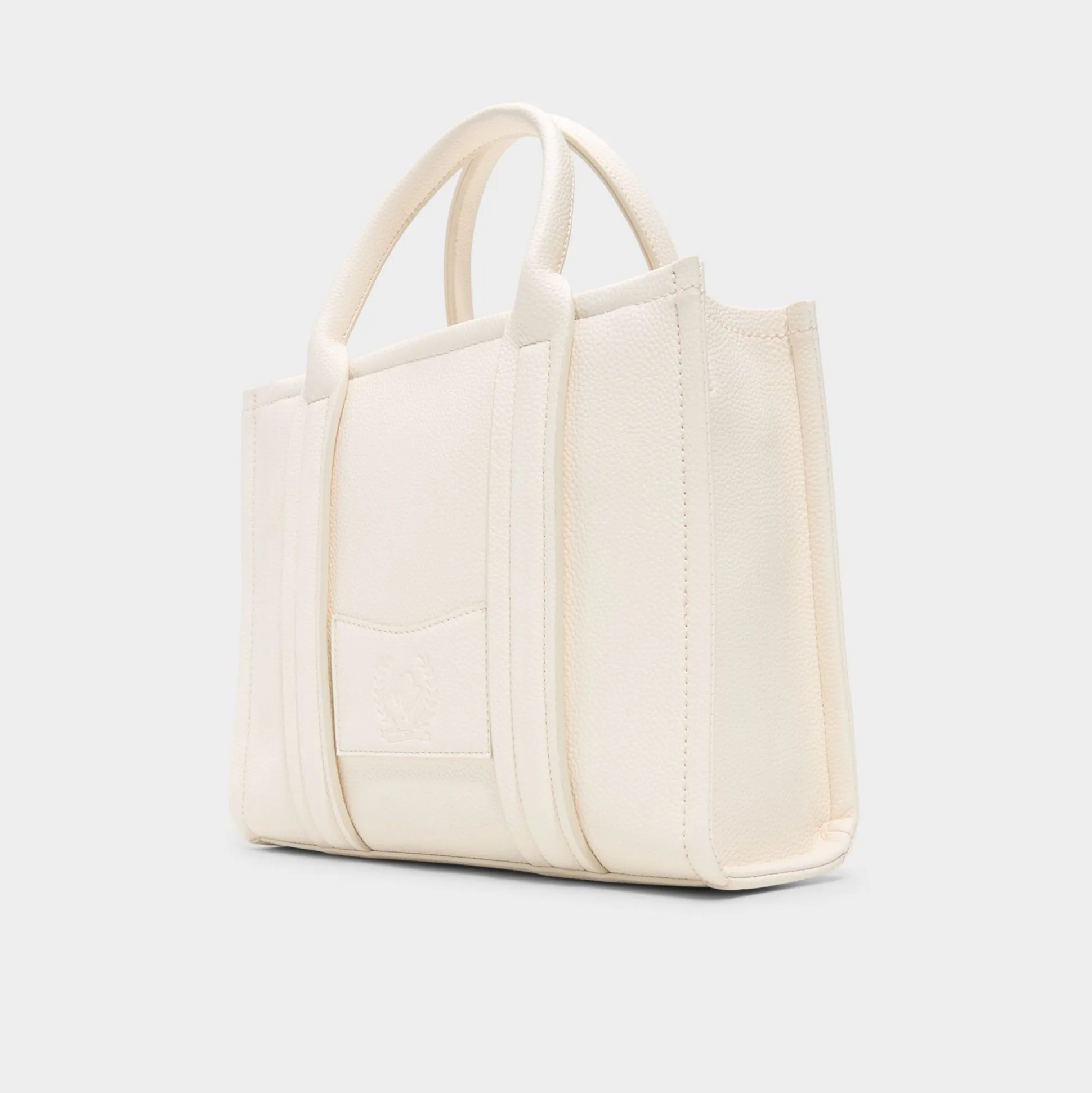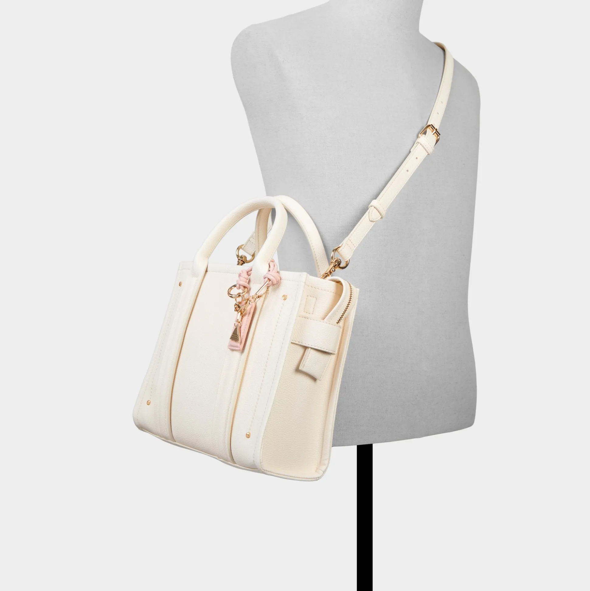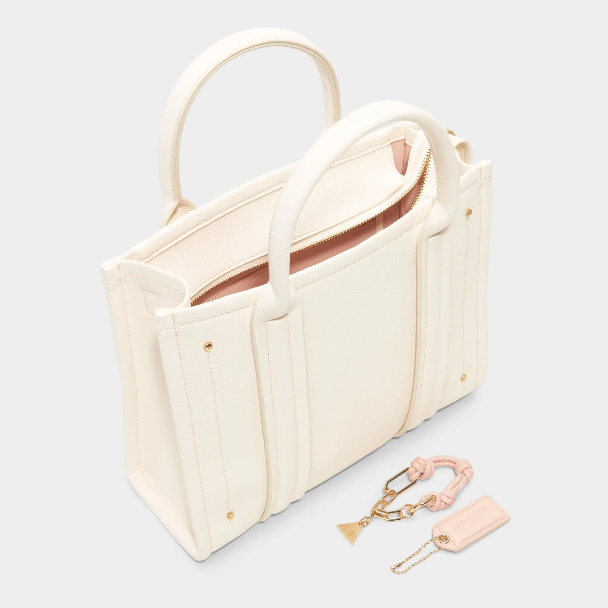 Blush-pink luggage tag and gleaming pyramid charm add playful color to this structured pebble-grain tote, whose vertical stitched panels and gold hardware frame an interior built for all-day living. Carry it with a tailored blazer for presentations or tuck beside airy dresses on weekend coffee runs to complete the look.