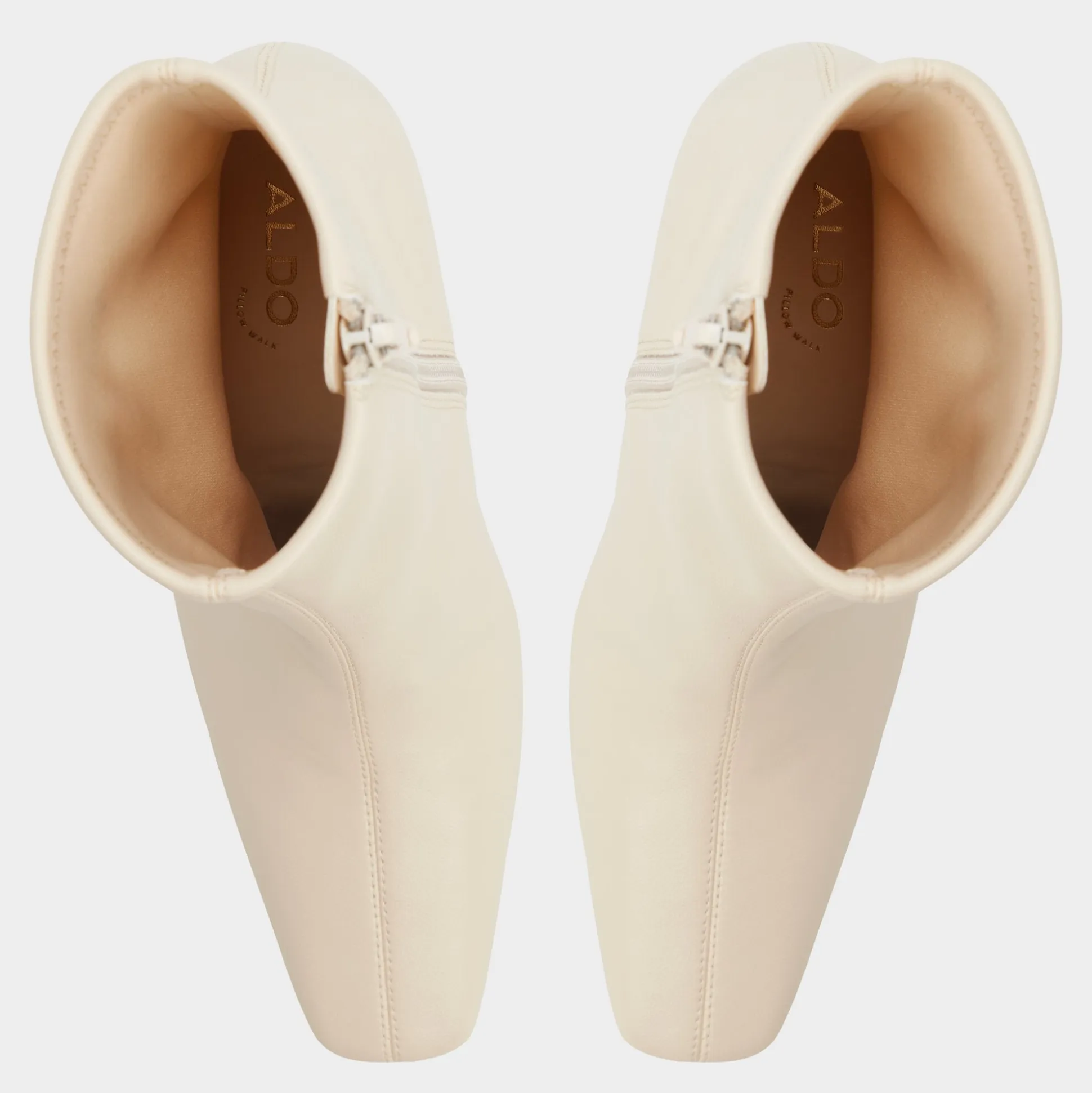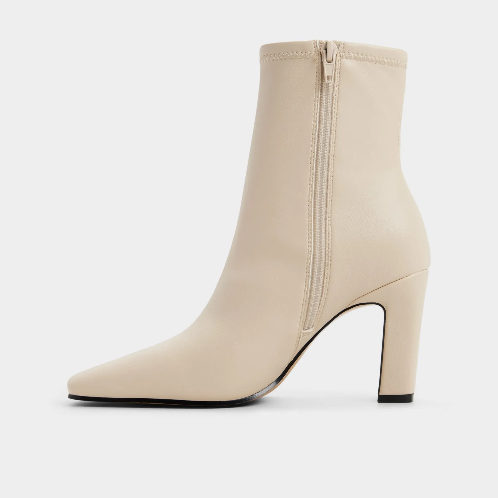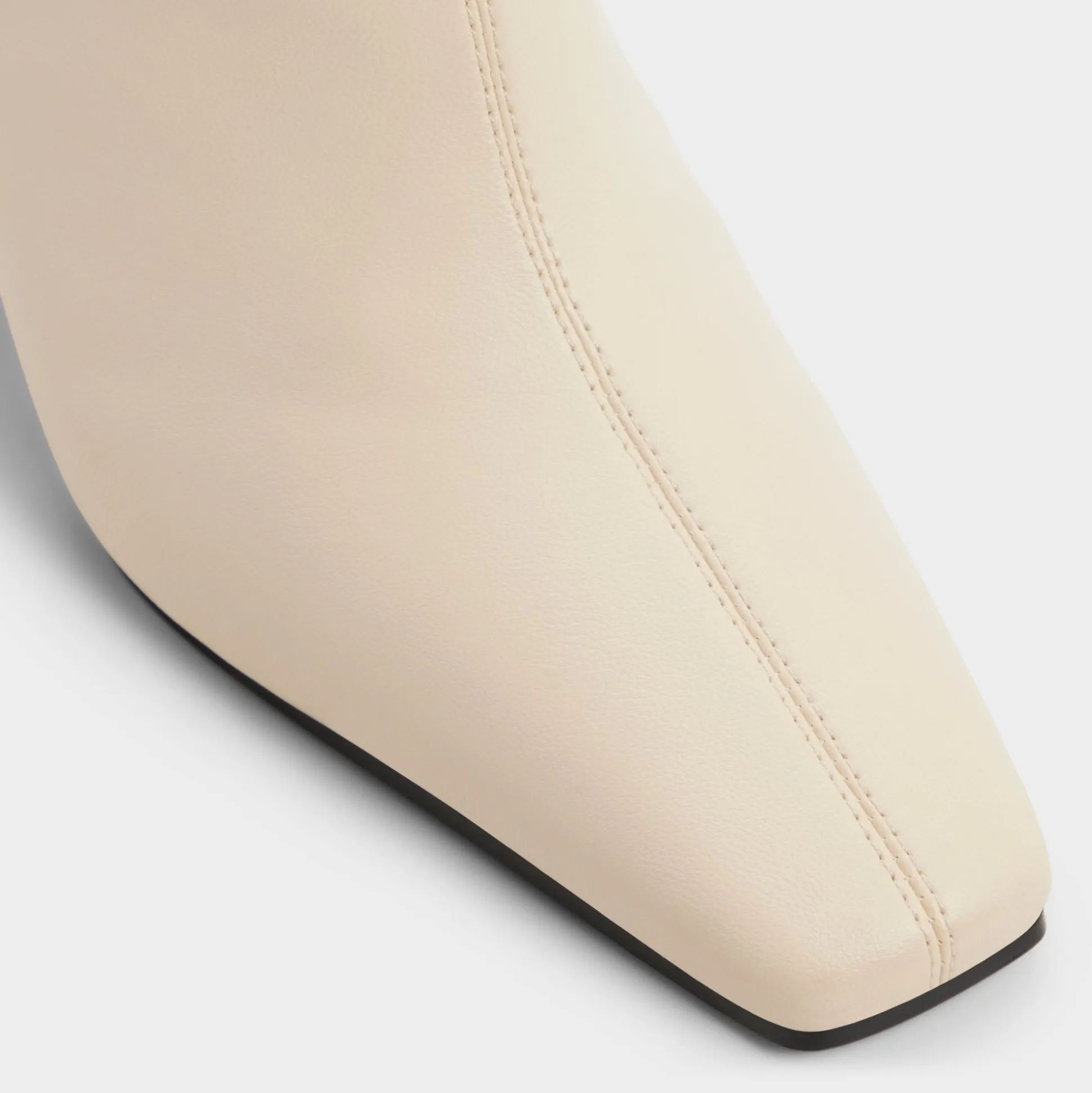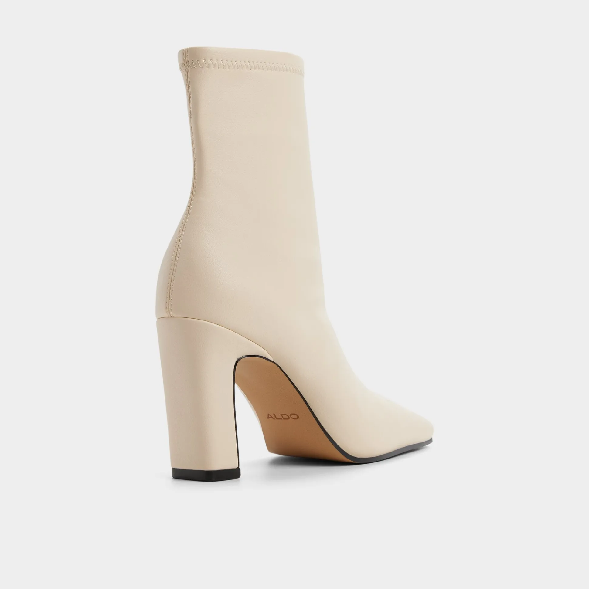A sleek leather sock-fit ankle boot in moonlit cream features a sculpted block heel with a subtle curve, balancing height and stability, while the slip-on shaft offers instant polish. Pair with cropped wide-leg trousers for office brainstorms, or slip under a slinky mini when gallery openings hit after-dark.