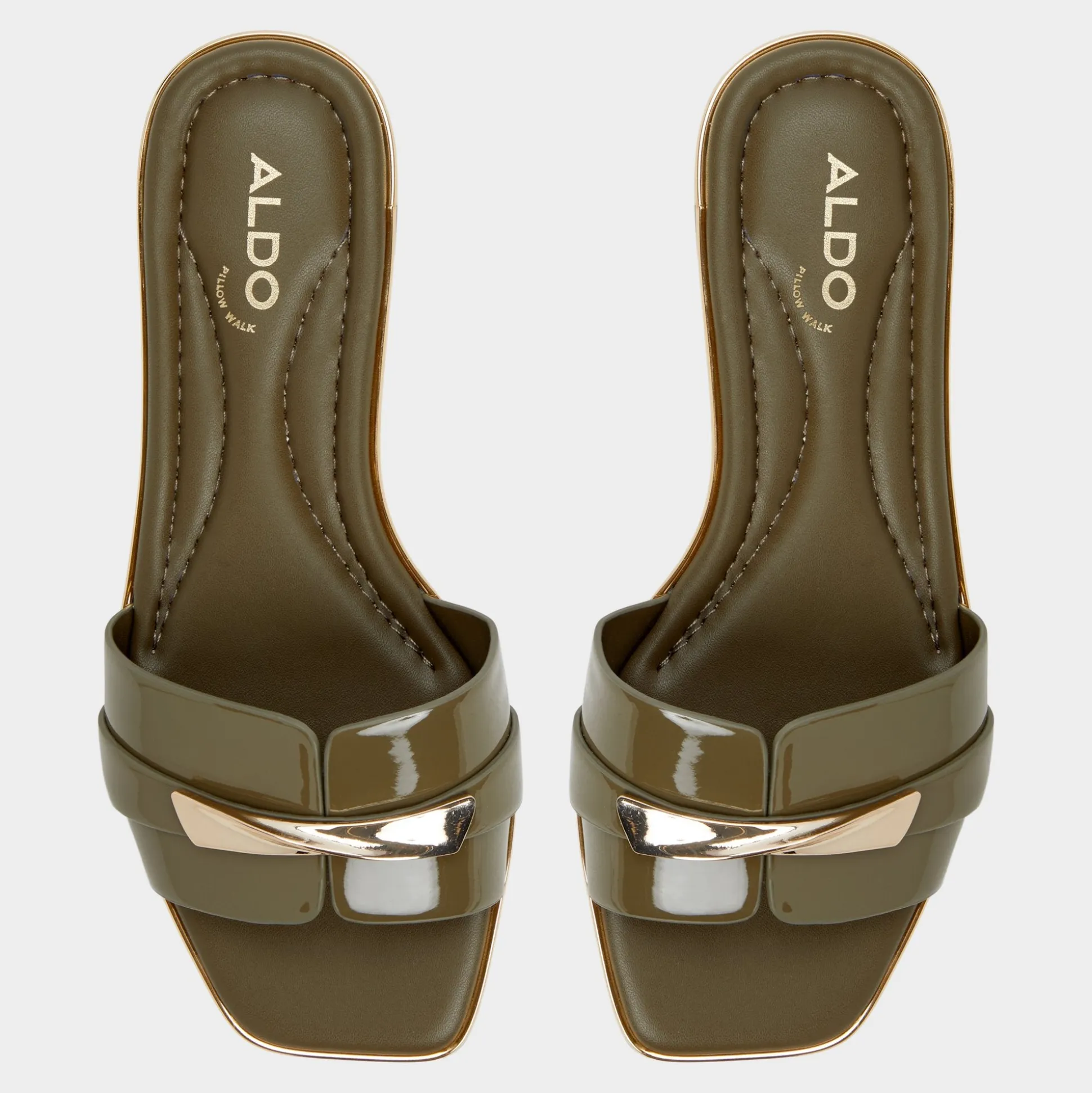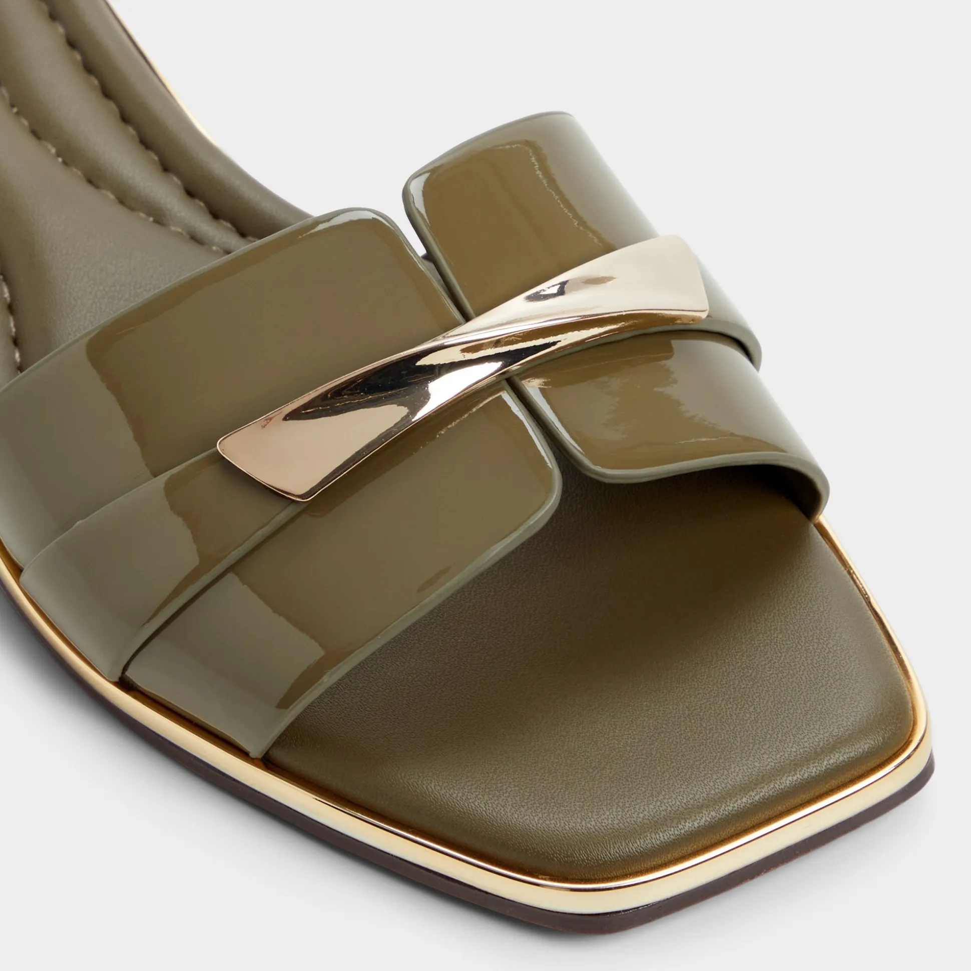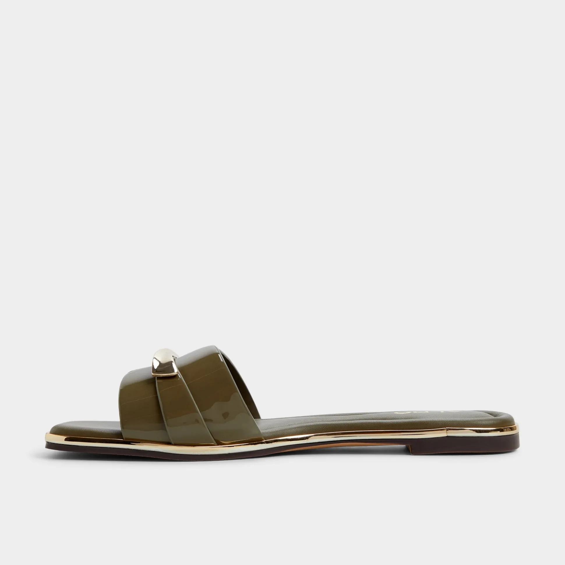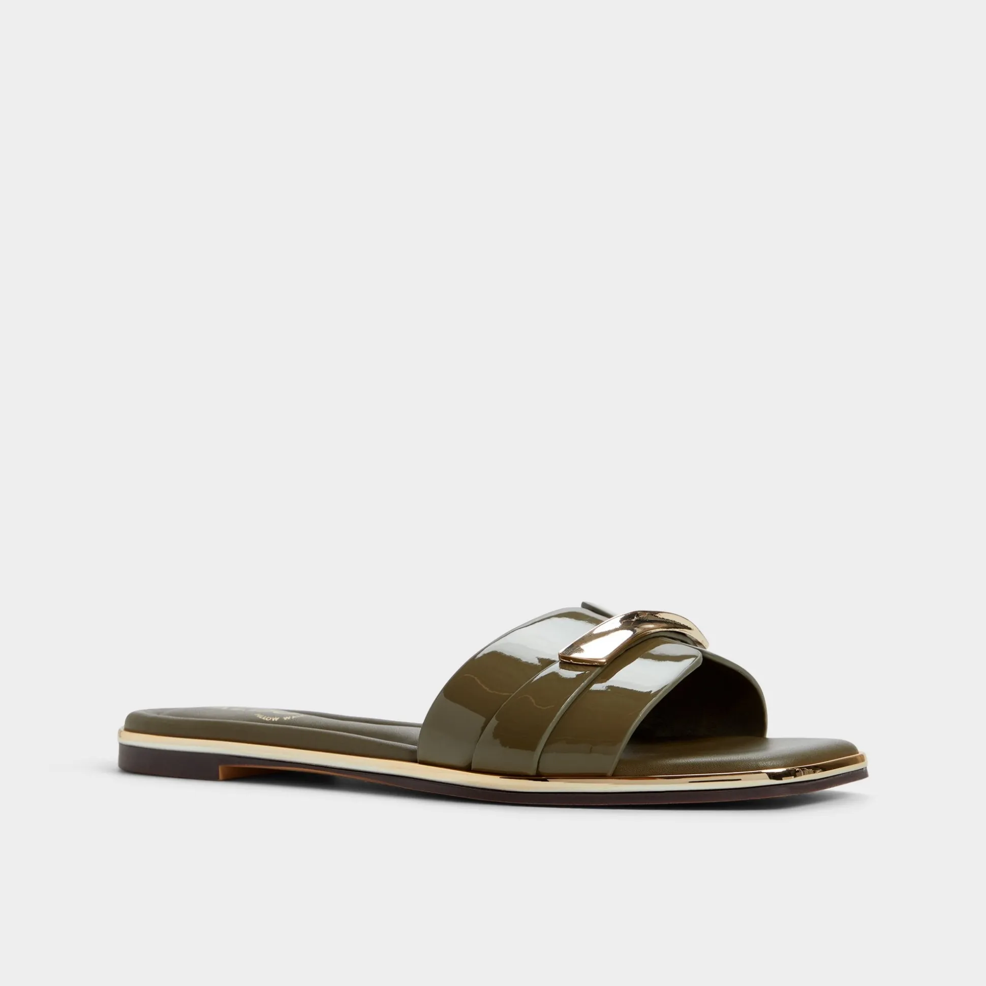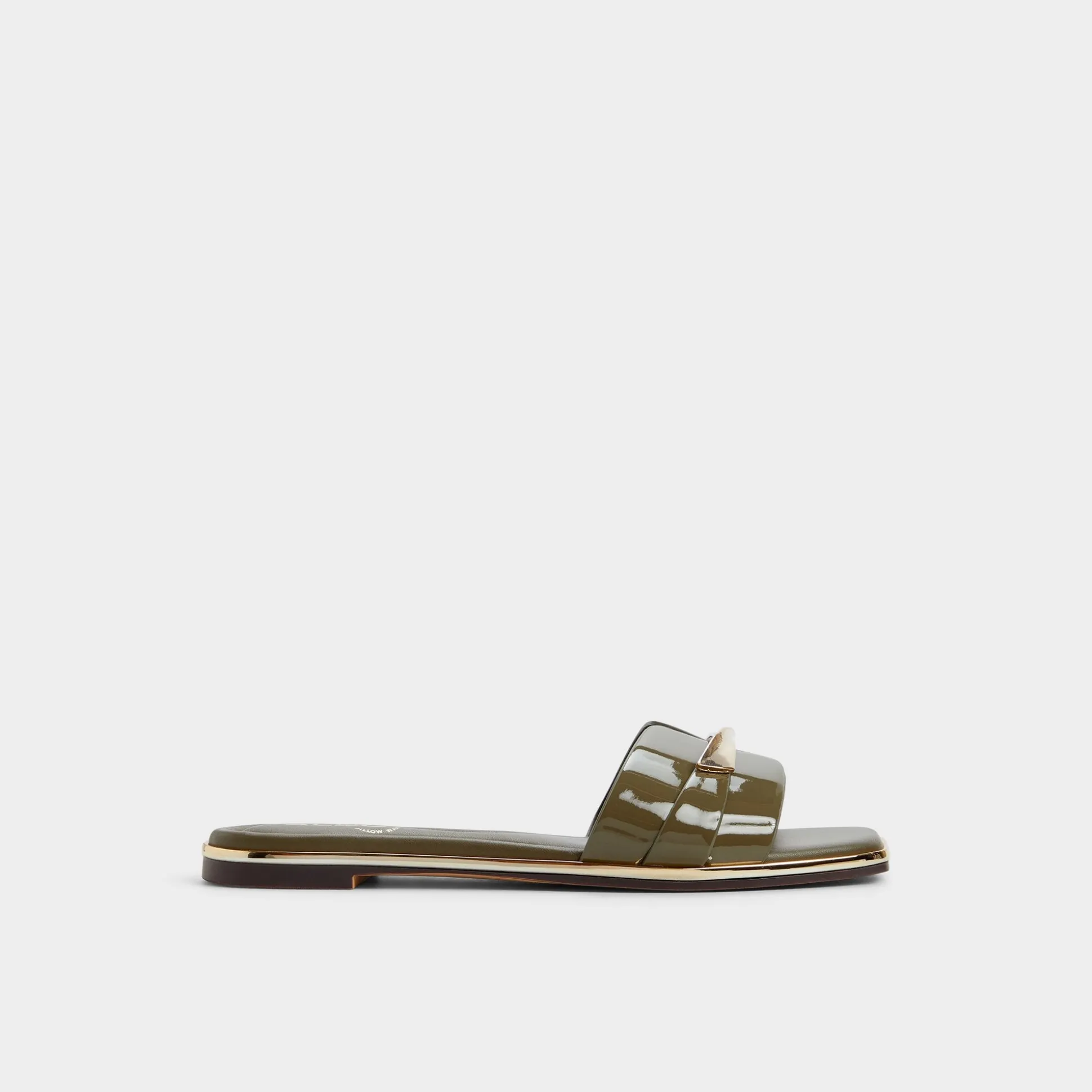Sunlit patent leathers trace bold, wide bands trimmed with gold-tone hardware, turning a laid-back sandal into a statement of evening-ready polish and sun-drenched confidence for city strolls and rooftop sunsets. Pair with cropped linens for market days, or slip under a flowy midi for sunset cocktails and street-style gallery nights.