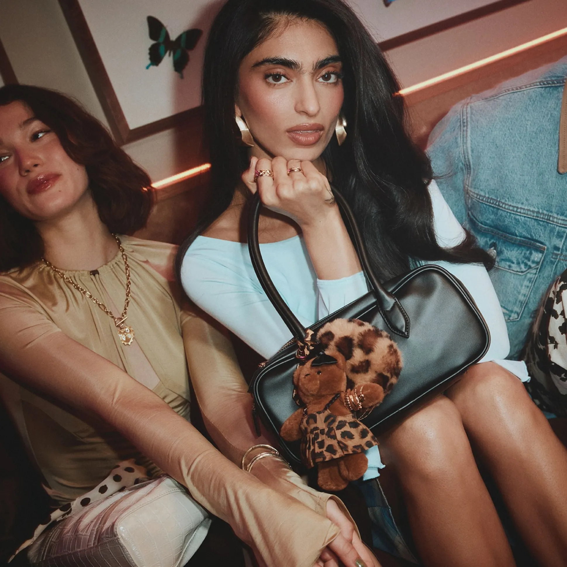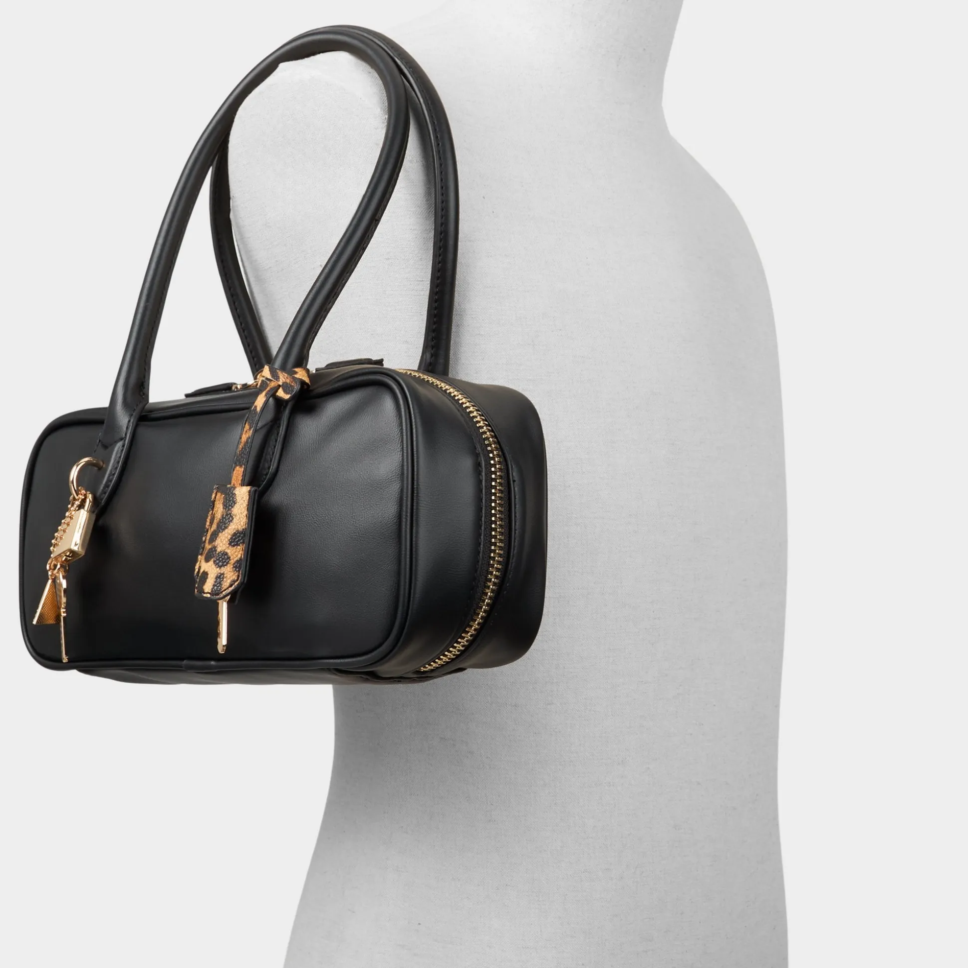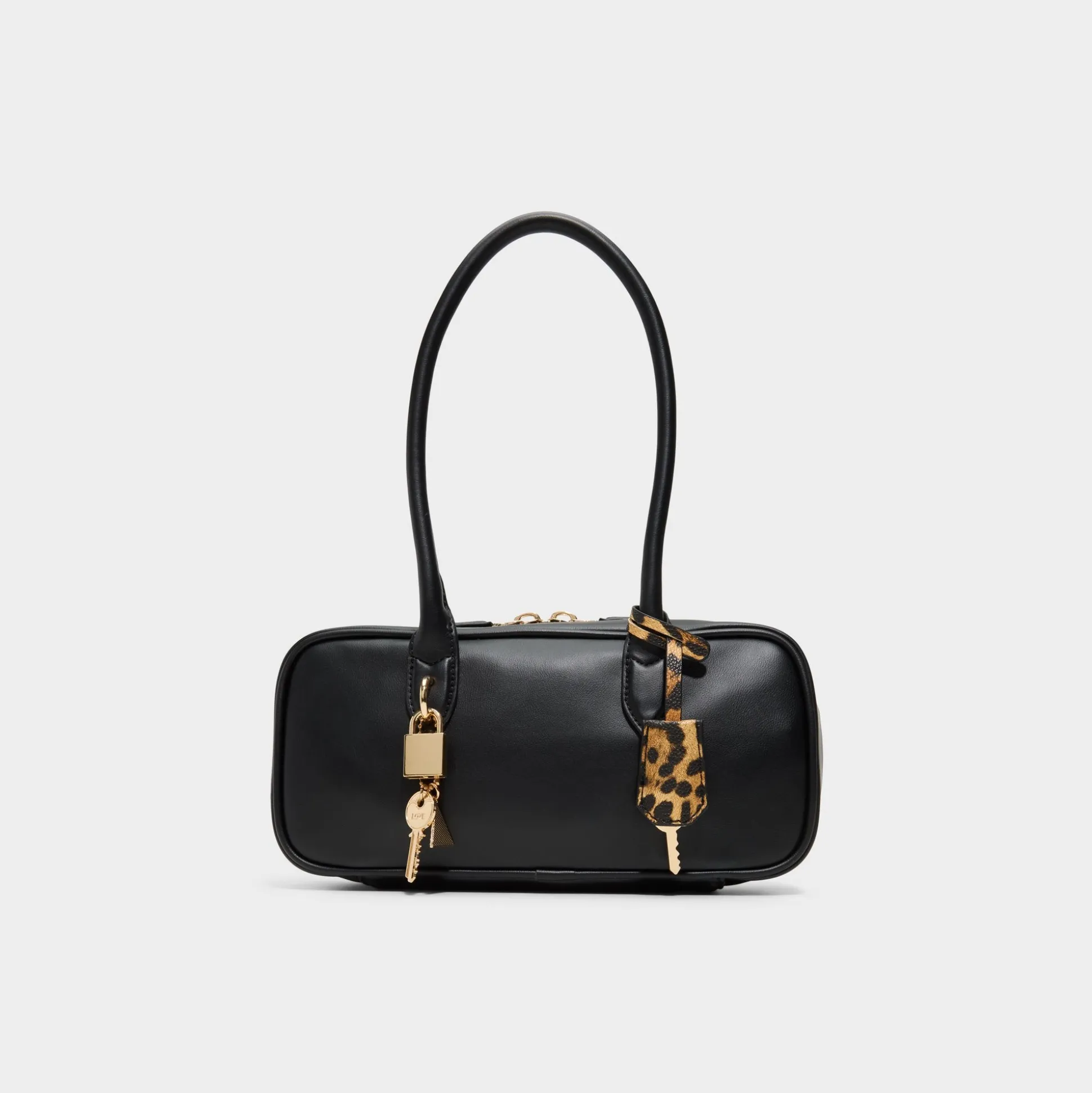 Smooth black leather shapes a slim rectangular satchel, its gleaming padlocks and wild leopard key charms stealing the scene while a zip-secure interior keeps essentials neatly in place for city days that shift from desk to after-hours. Carry it through morning meetings with a blazer, or sling it to after-hours with a sleek dress for a quietly edgy finish.