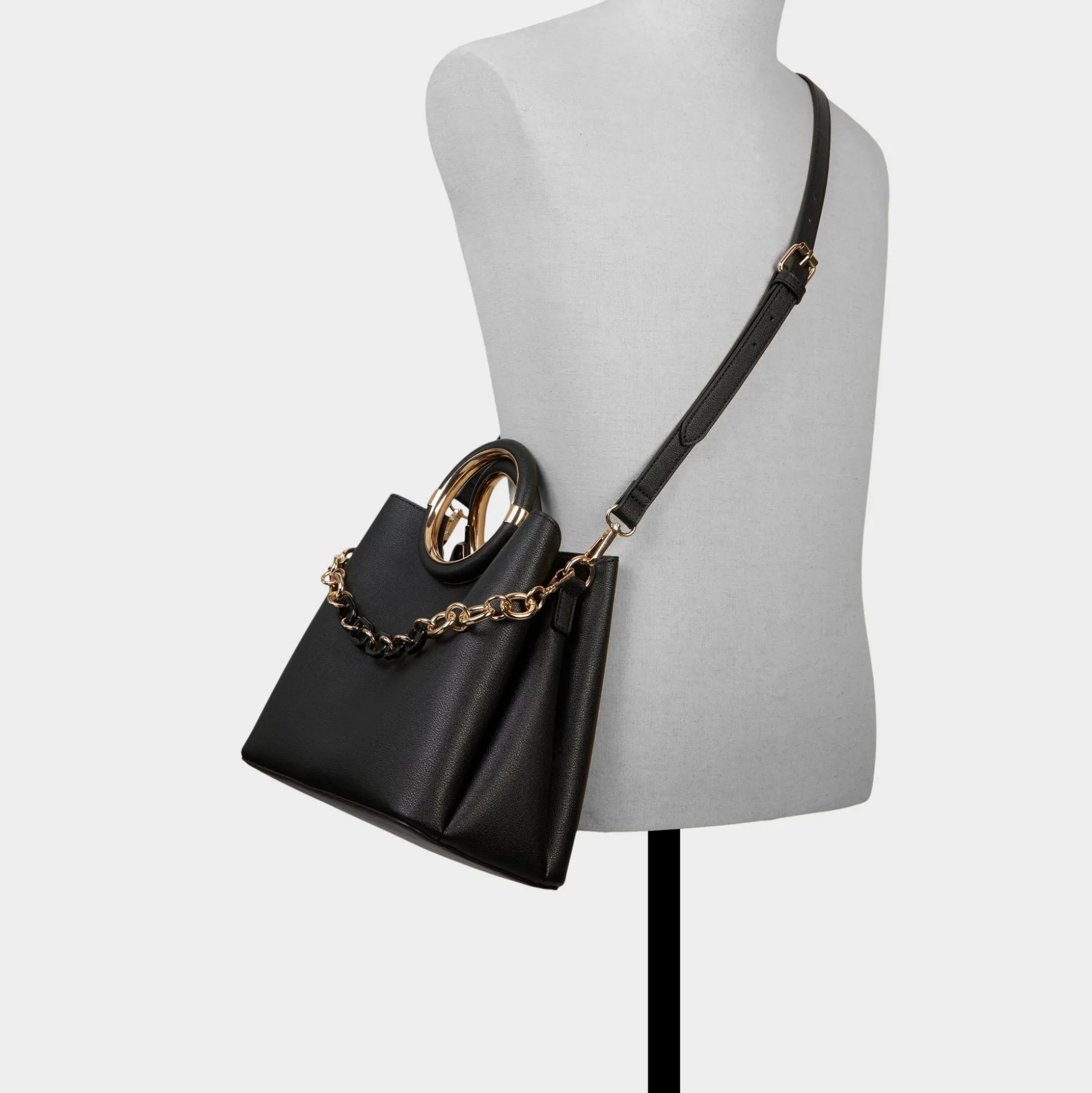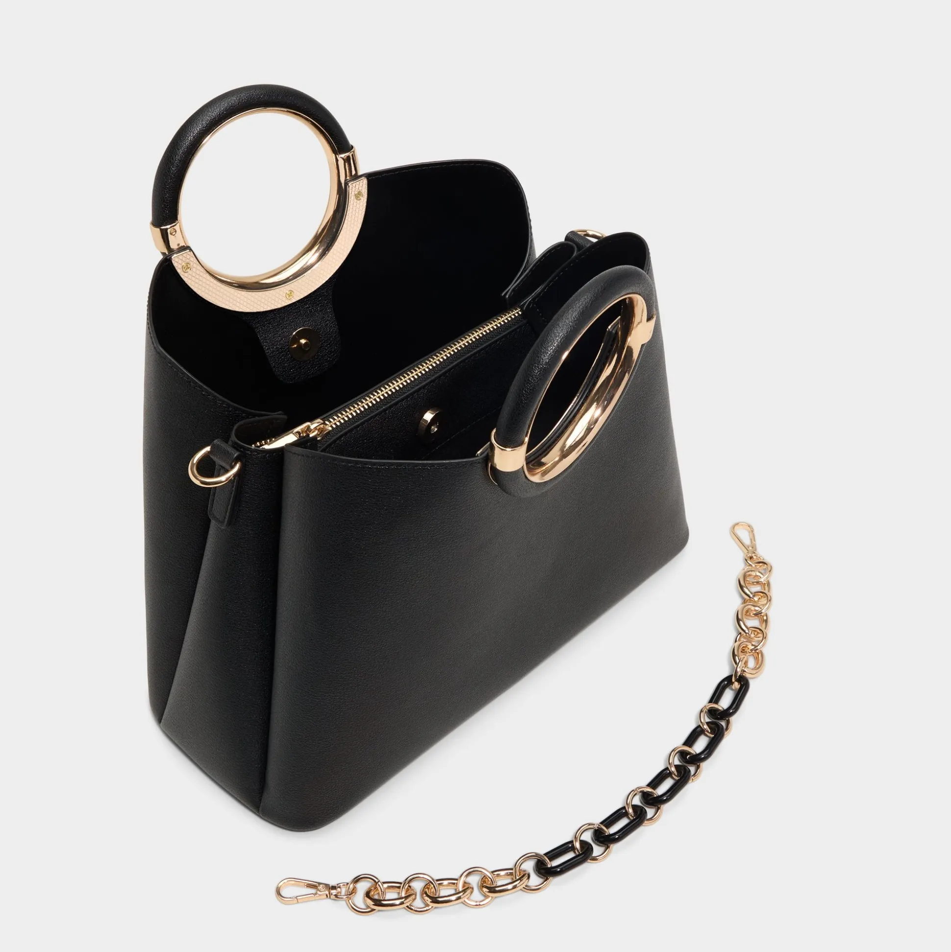 Sculptural ring-handle in glossy gold frames this structured leather carryall, while a detachable curb-chain strap lets you switch from top-handle to shoulder carry in a heartbeat for city days and after-hours adventures. Carry it with tailored blazers for client catch-ups, or sling it over satin slips for rooftop drinks to finish the look.