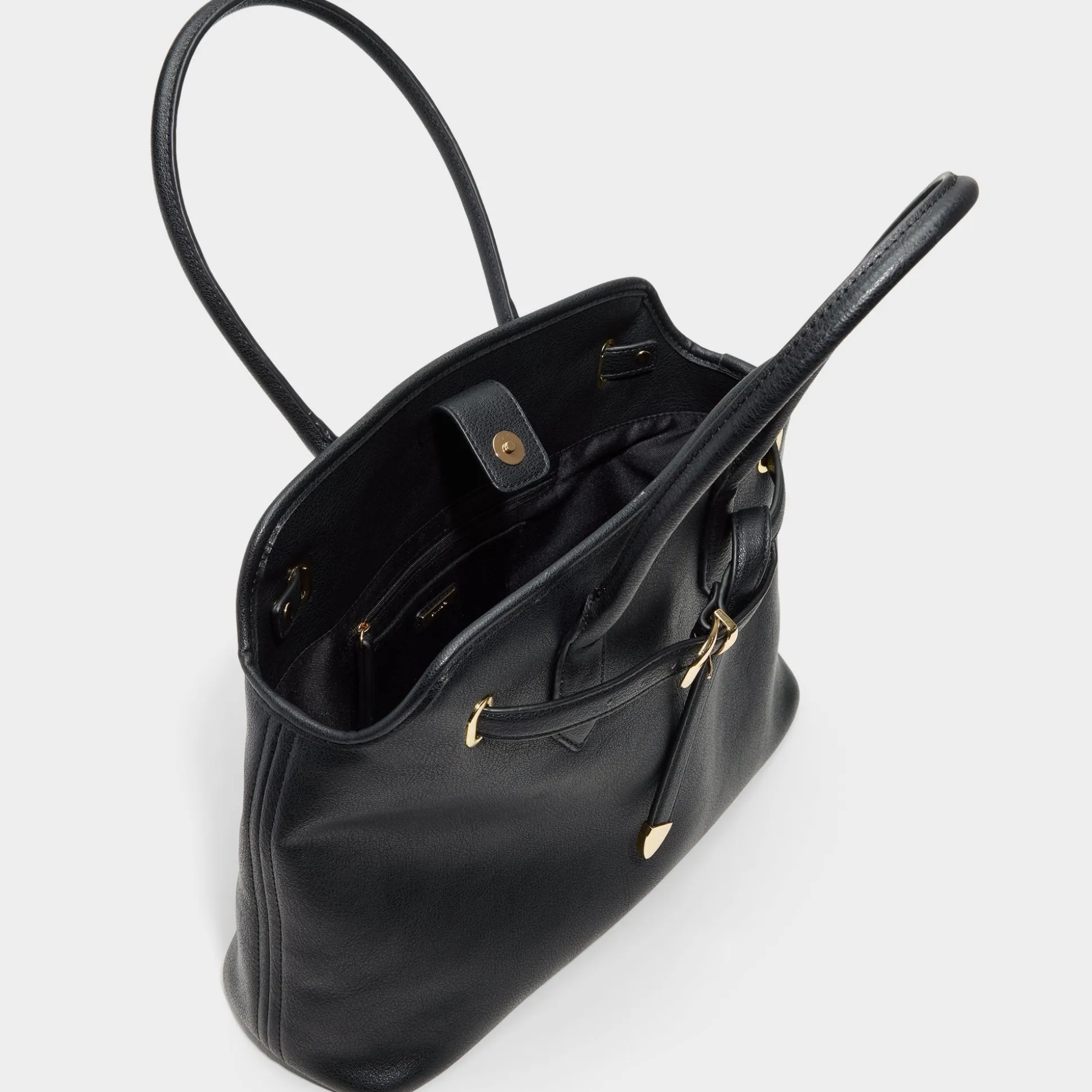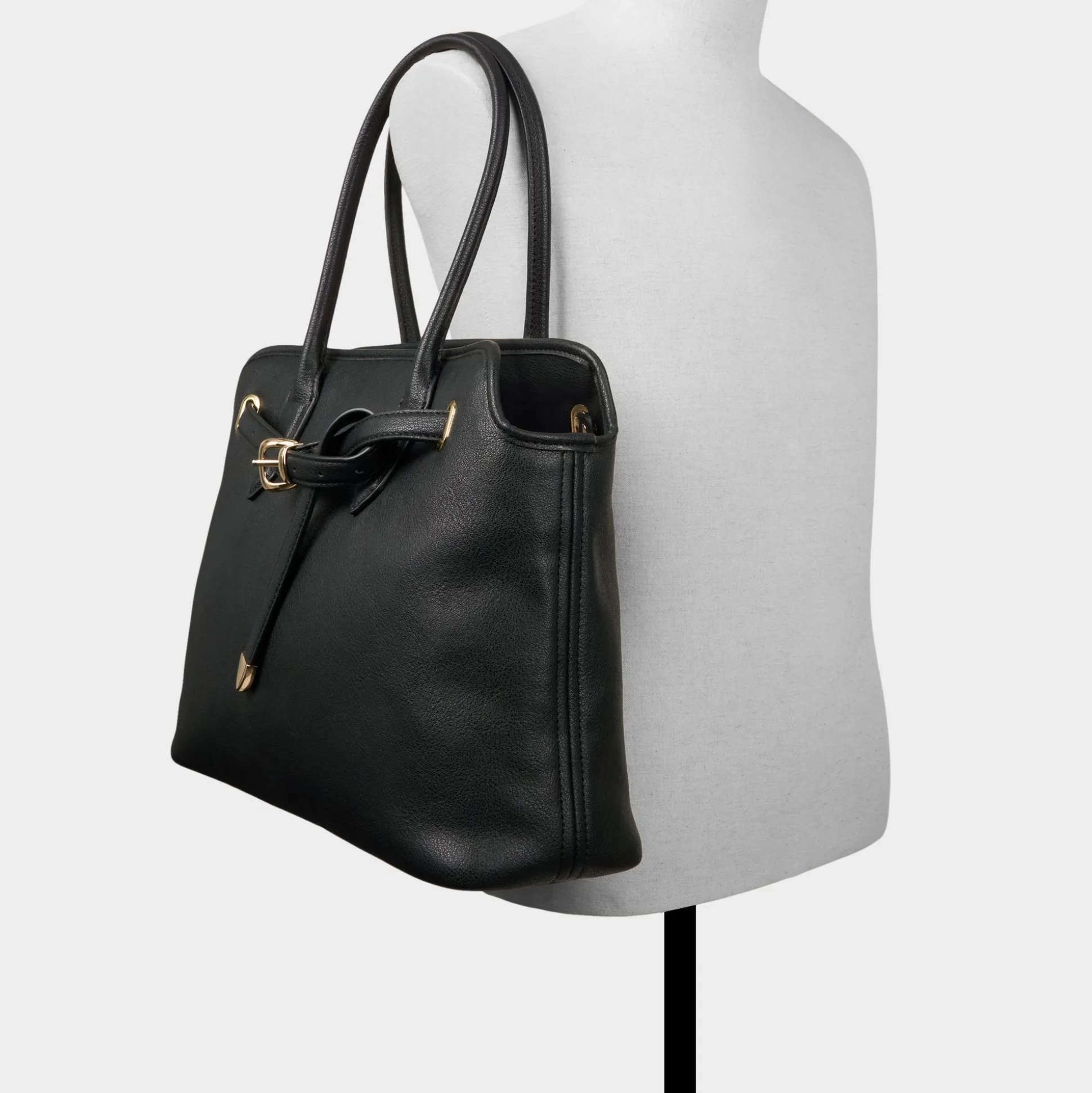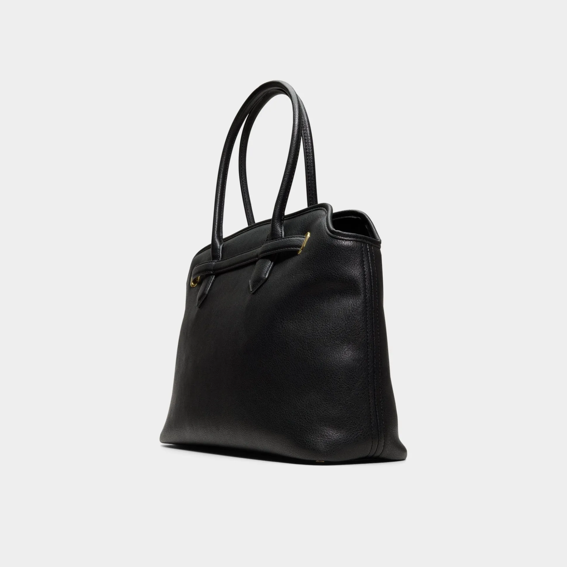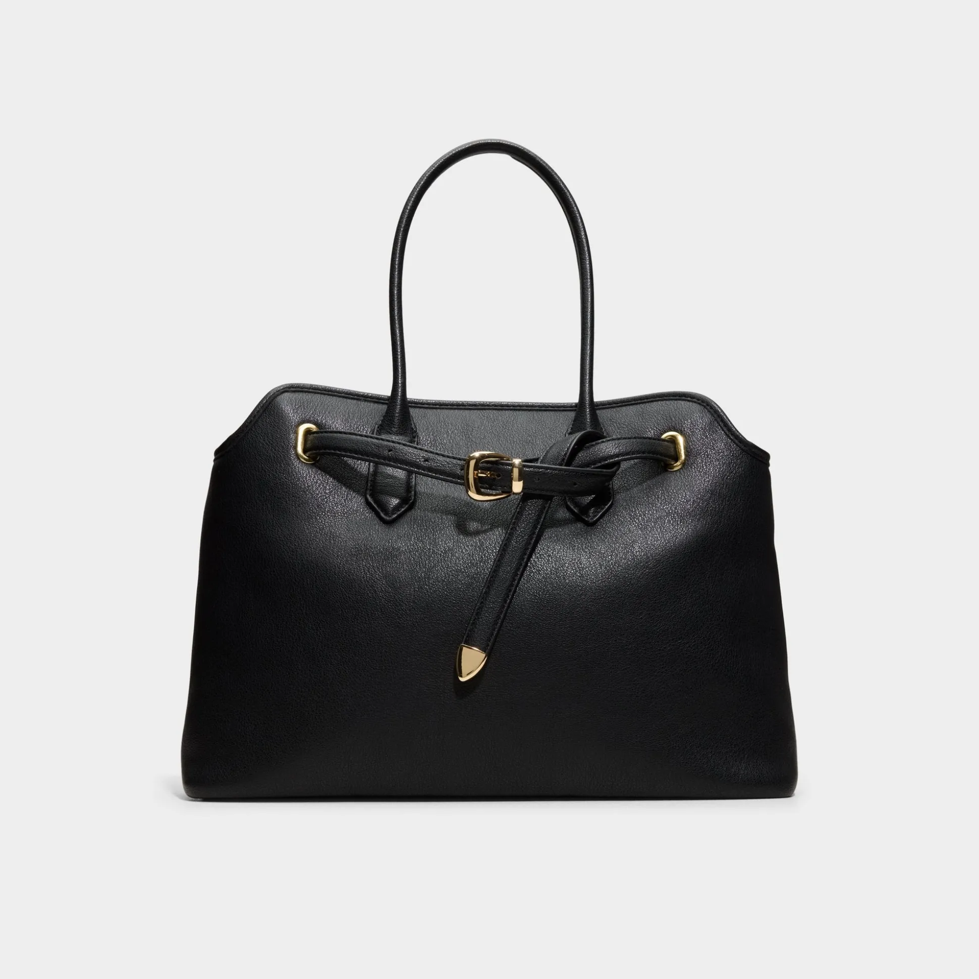 Supple black leather blends tailored polish in this streamlined tote, cinched by a belt-inspired strap and gold buckle hinting at structure while making daily errands feel intentional. Carry it with sleek suits for client meetings or sling it over knit sets on weekend errands to complete the look.