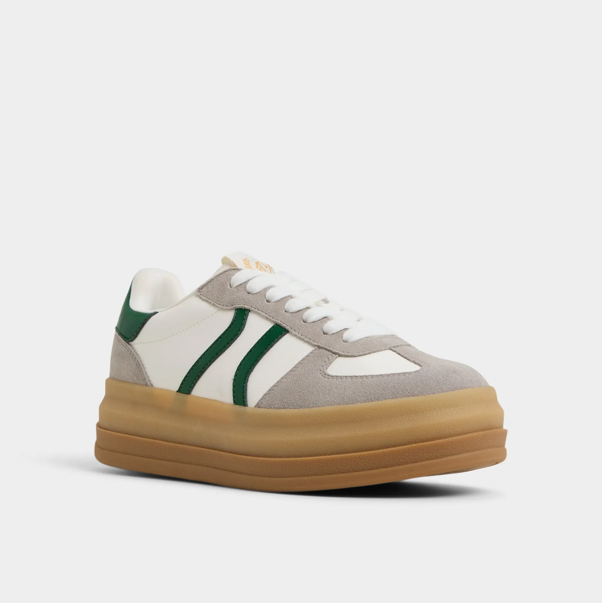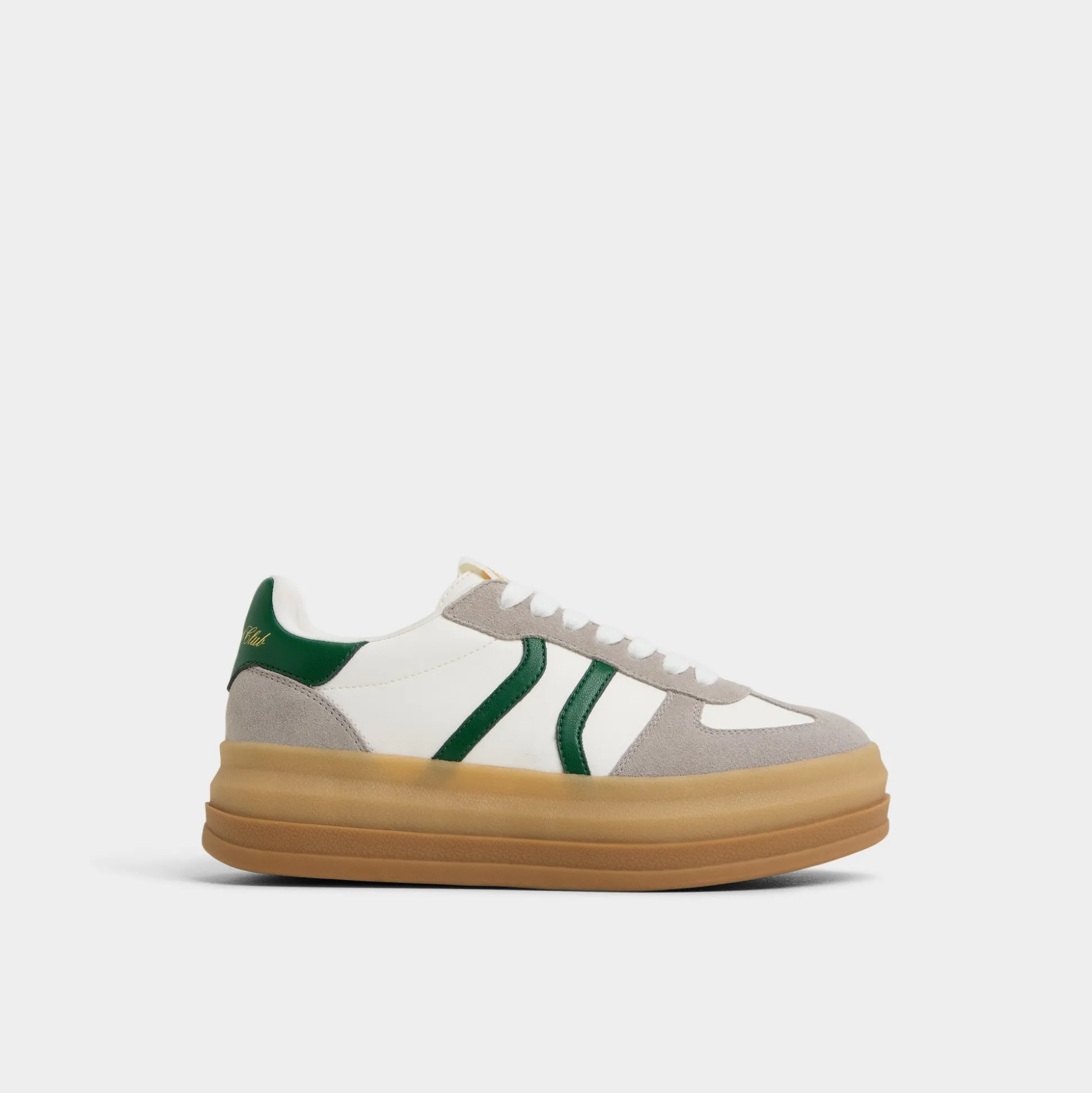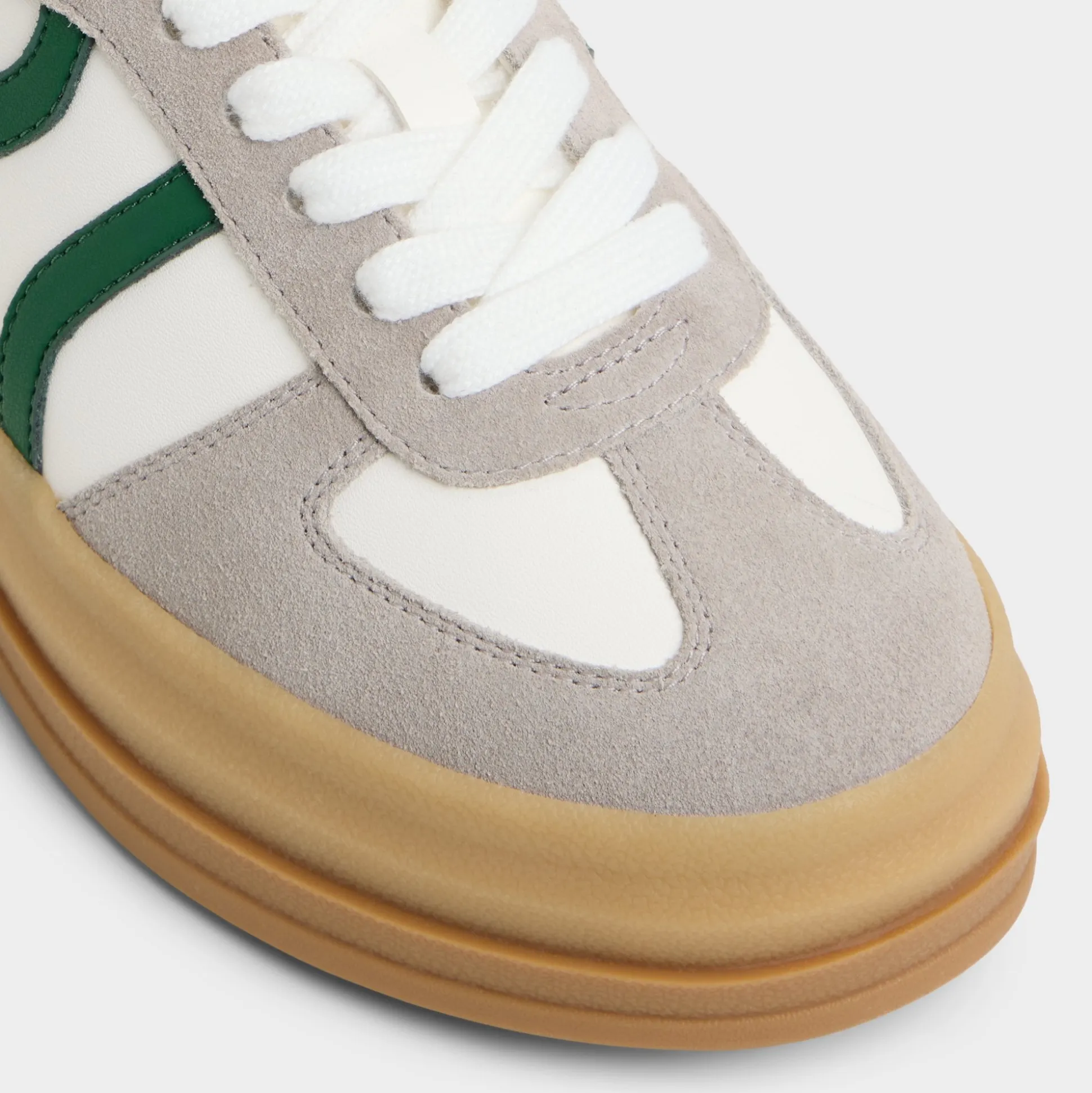 Stadium-ready green stripe races across smooth leather and suede, riding a chunky gum platform that adds confident height and a bold, crowd-pleasing silhouette you can wear beyond game day, from sidewalks to after-hours. Pair with cropped denim for a sporty brunch, or ground with satin skirts for city-hops and rooftop celebrations.