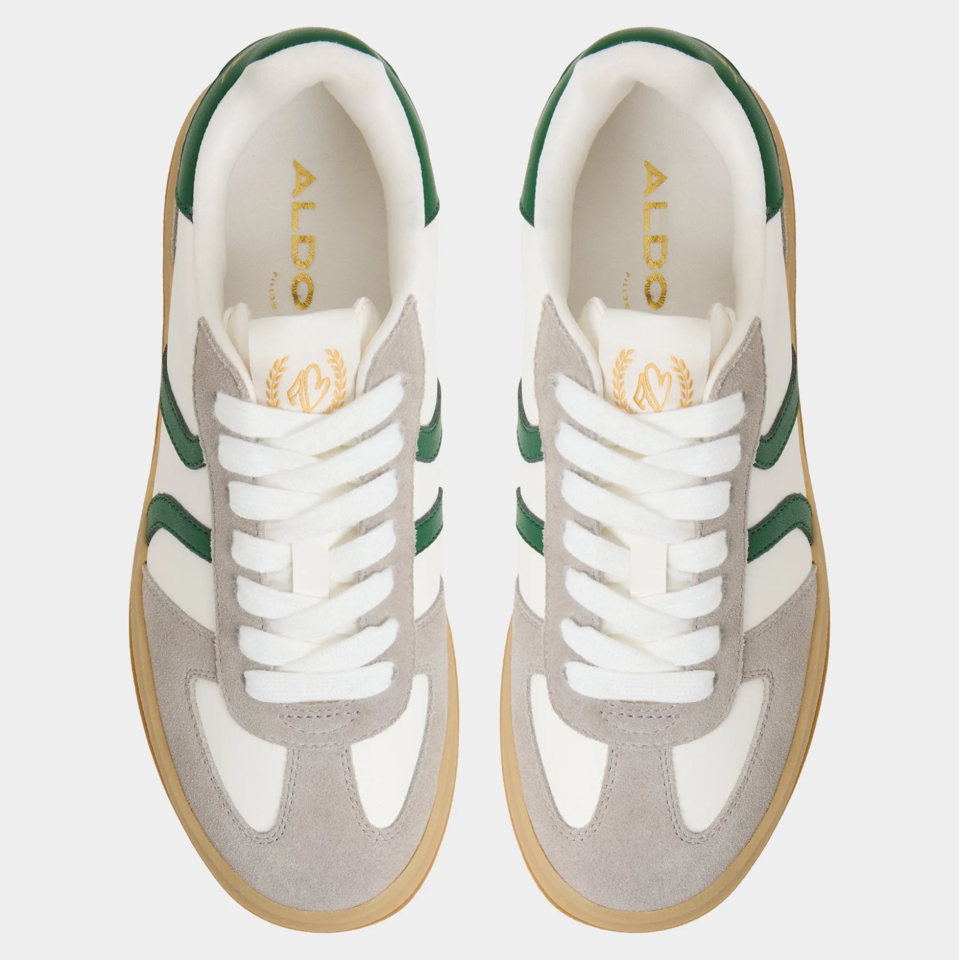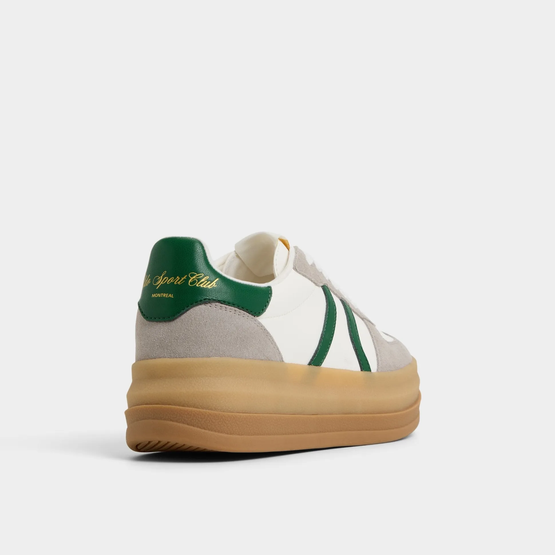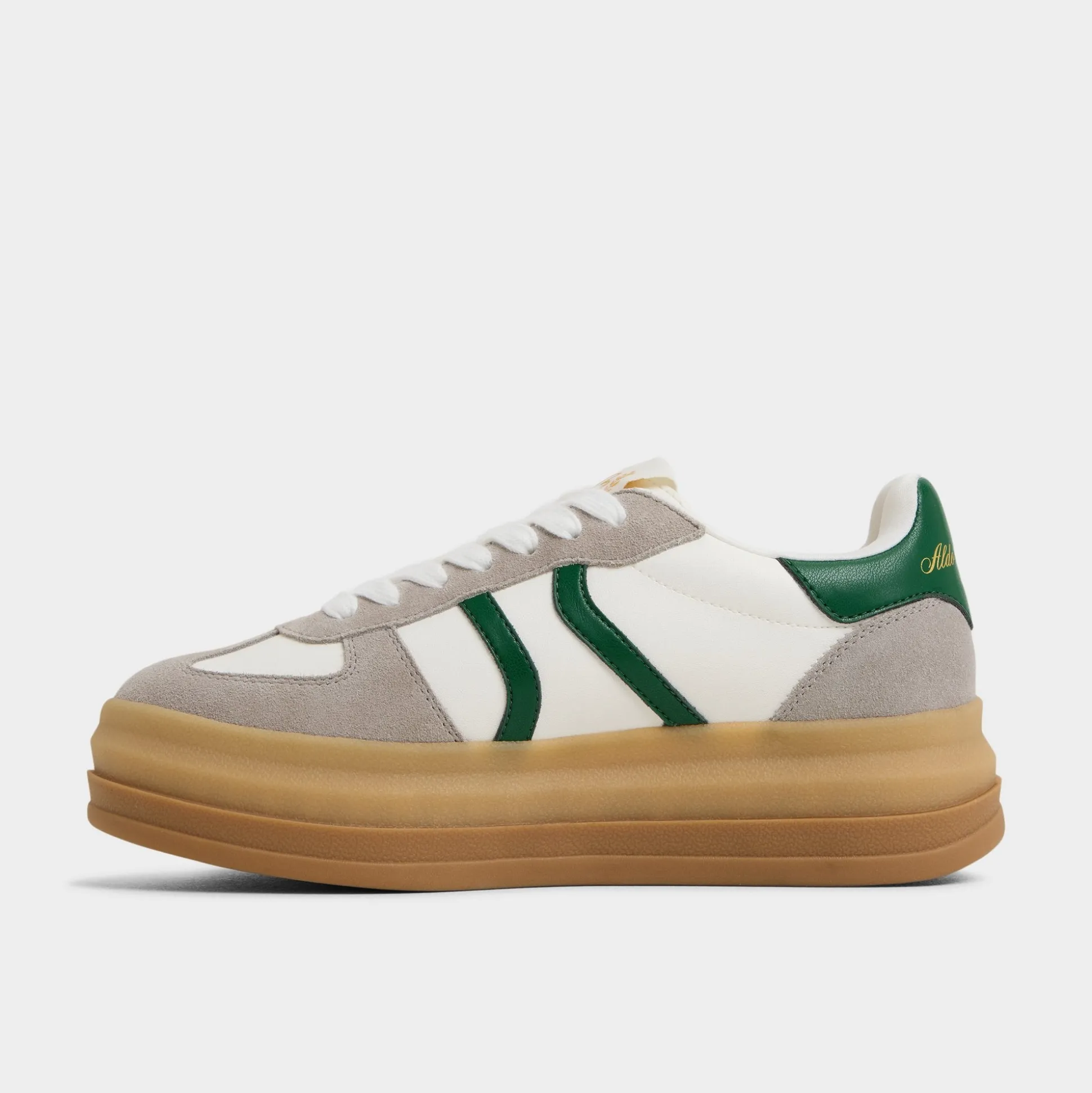 Stadium-ready green stripe races across smooth leather and suede, riding a chunky gum platform that adds confident height and a bold, crowd-pleasing silhouette you can wear beyond game day, from sidewalks to after-hours. Pair with cropped denim for a sporty brunch, or ground with satin skirts for city-hops and rooftop celebrations.