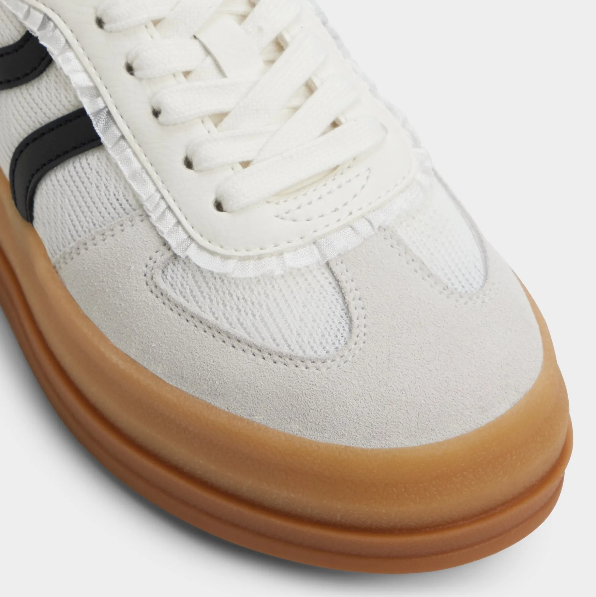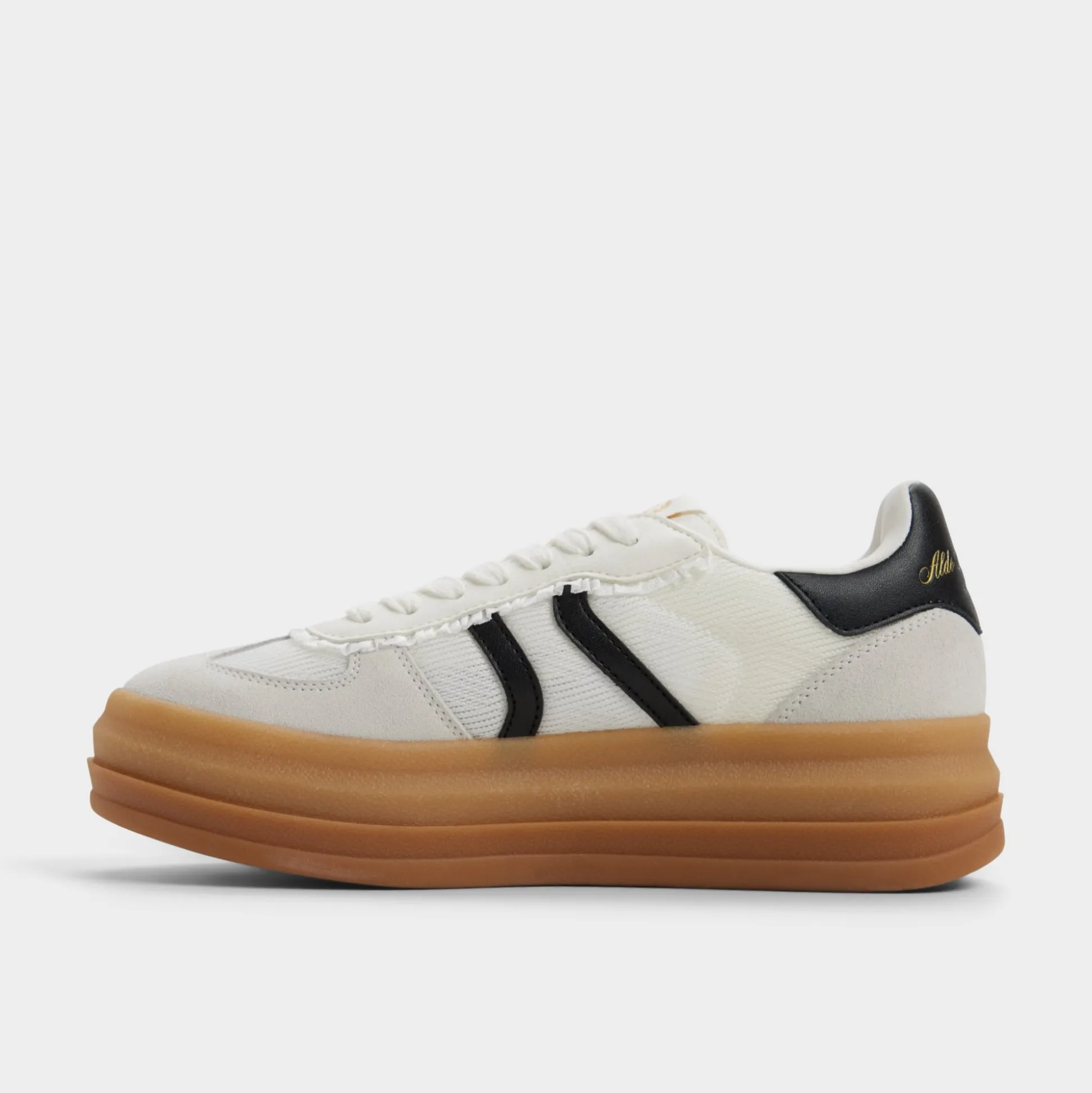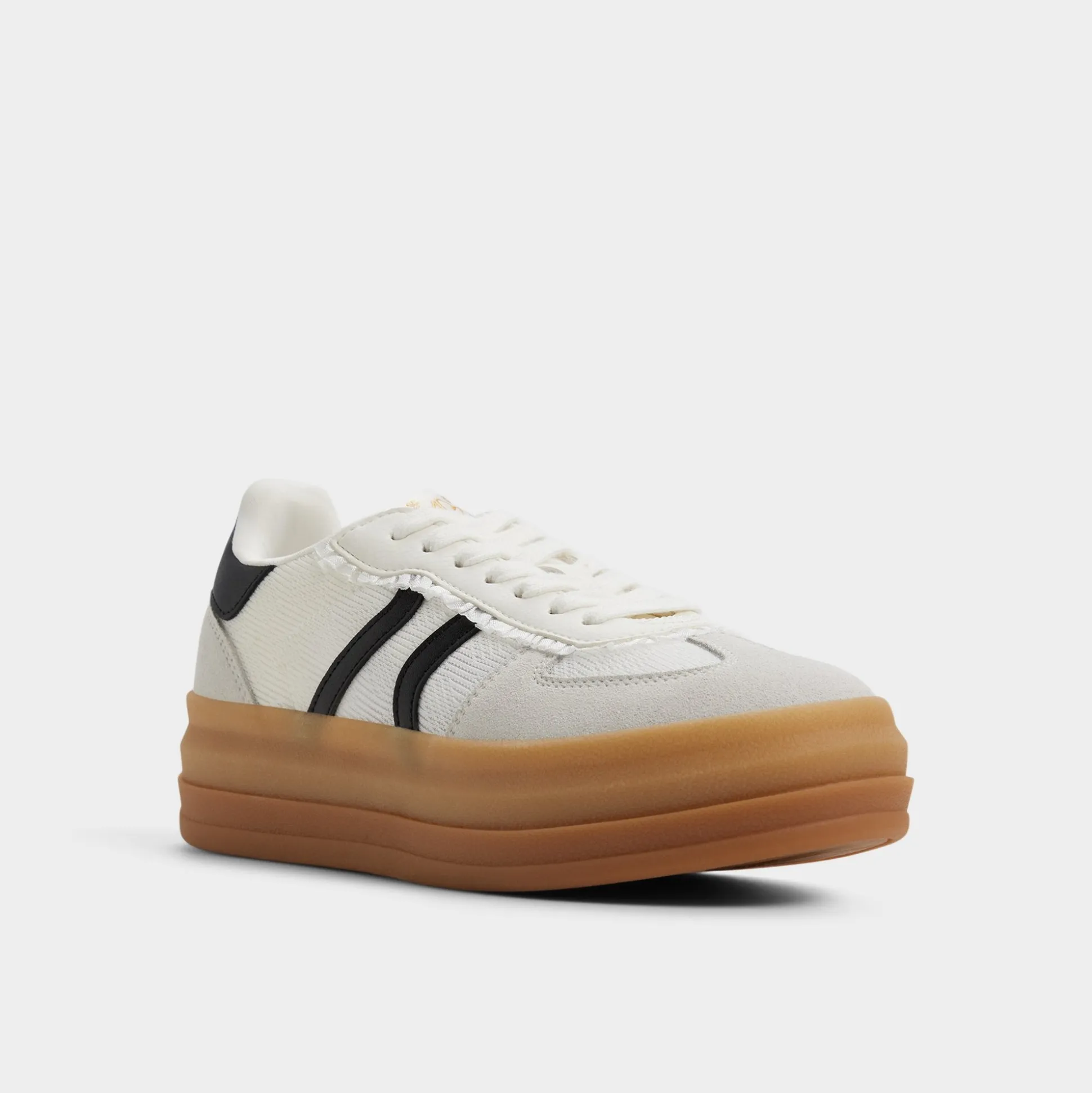 A chunky gum sole anchors a crisp canvas upper with bold black racing stripes, delivering subtle bounce and all-day comfort that stays ready for city sprints and quick coffee runs. Pair with slouchy trousers for lectures, or swap in a floral sundress when art fairs call.