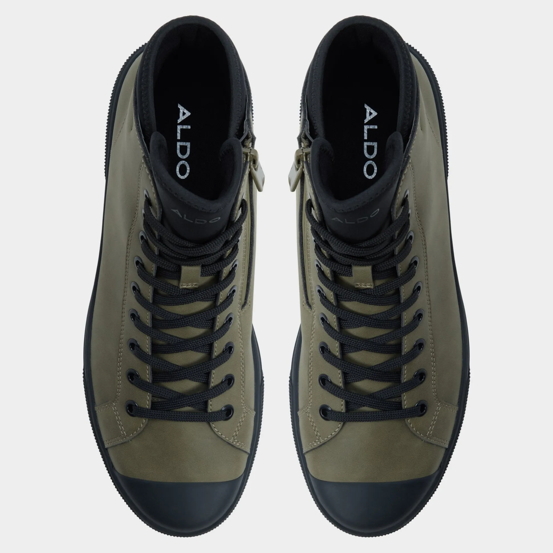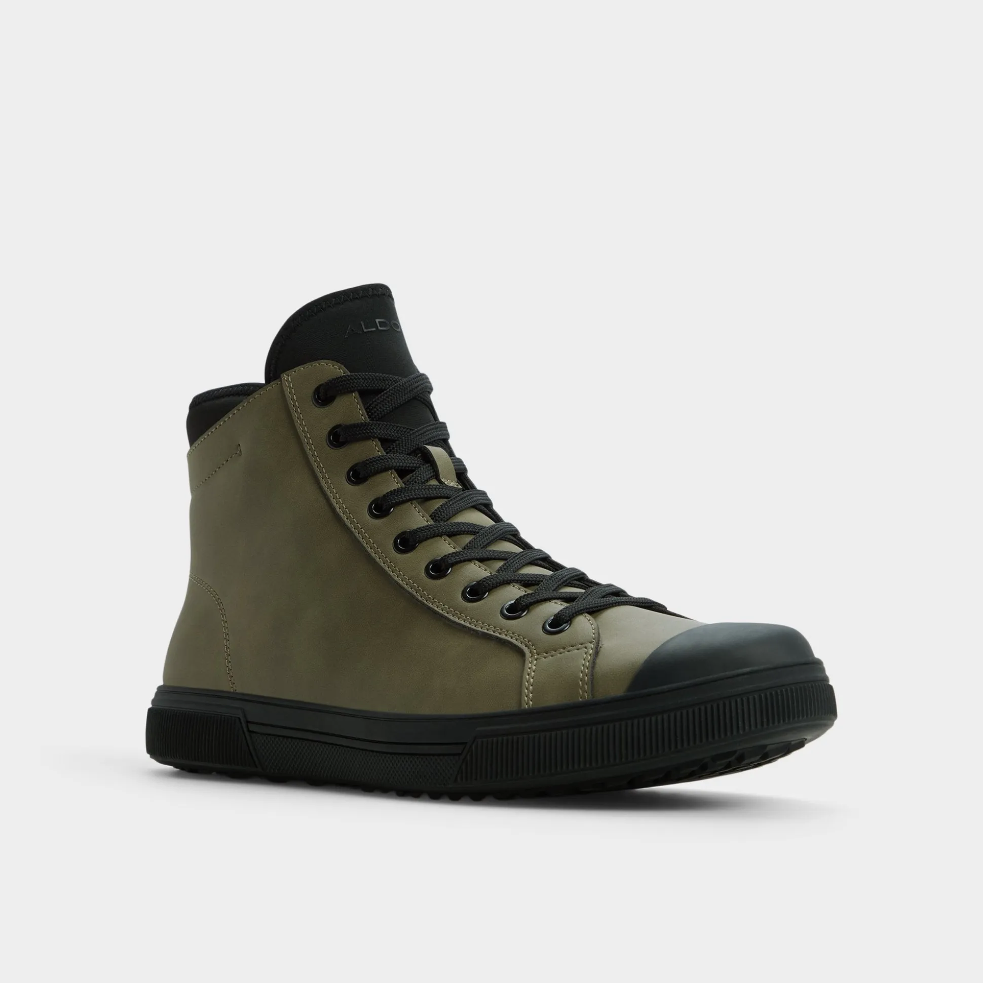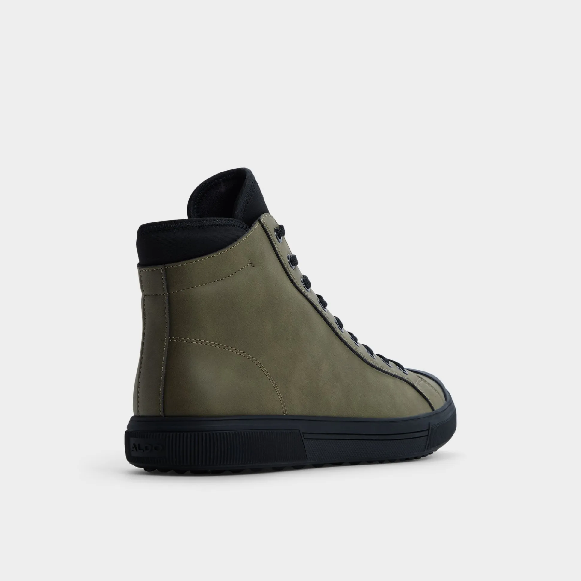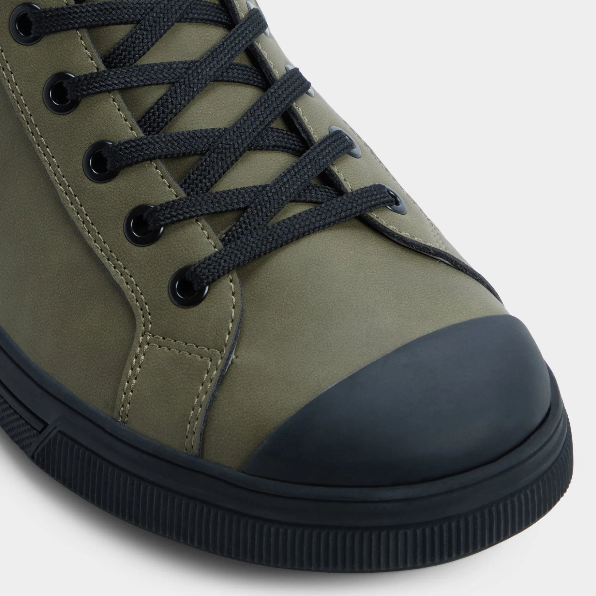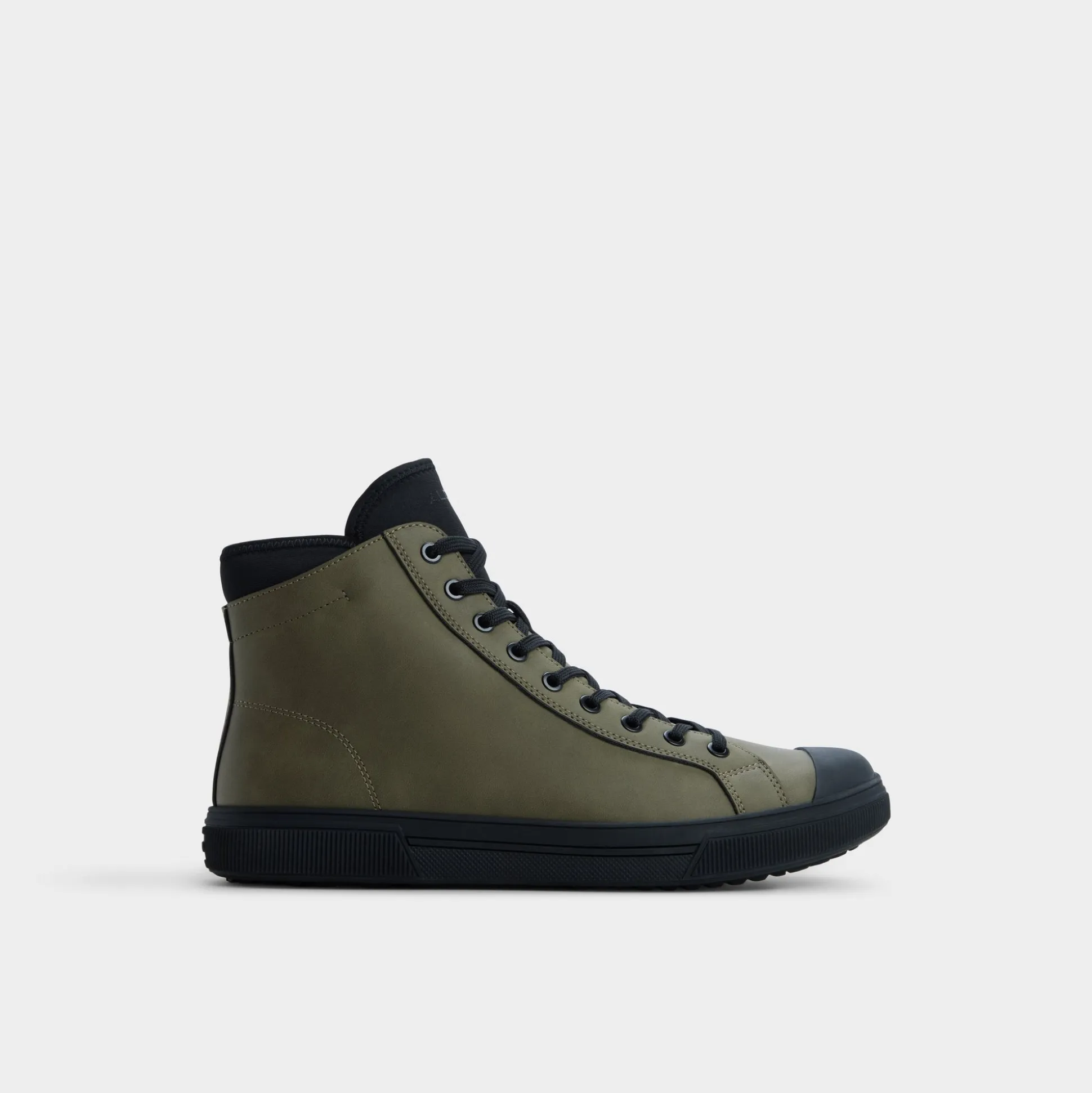 Raised rubber toe cap and matte olive leather give this high-top a street-ready edge, while a cushioned cup sole and metal eyelets keep the ride flexible from subway steps to late-night loops around town. Anchor tapered joggers for casual Fridays or roll with cuffed denim and a bomber for impromptu gig nights.