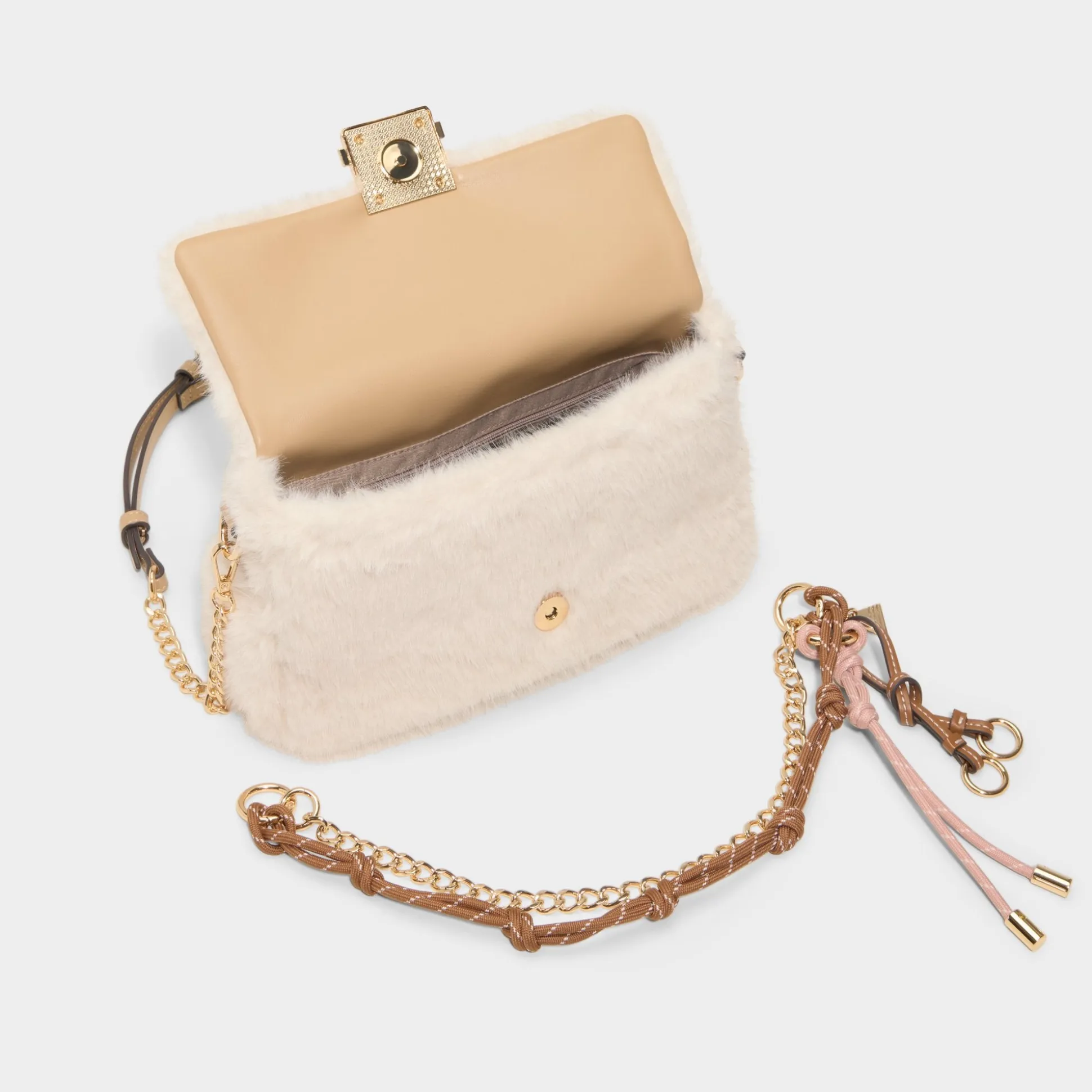Snow-soft faux fur wraps this compact crossbody in apres-ski coziness, with a removable chain strap that snaps off to switch from shoulder to waist wear for seamless evening outings everywhere. Pair chunky knits with wide-leg denim on coffee runs, or tuck against velvet minis during holiday nights.