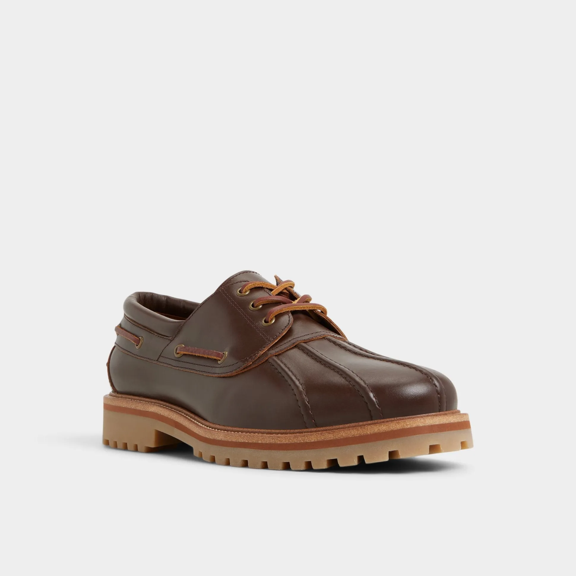 Saddle-brown leather wraps this derby, with rawhide lacing and a lug sole that anchors every step, turning city curbs and gravel paths into easy terrain you move through with a quiet, confident stride. Team it with cuffed denim for market strolls, or pair with wool trousers for coffee-house client meetings.