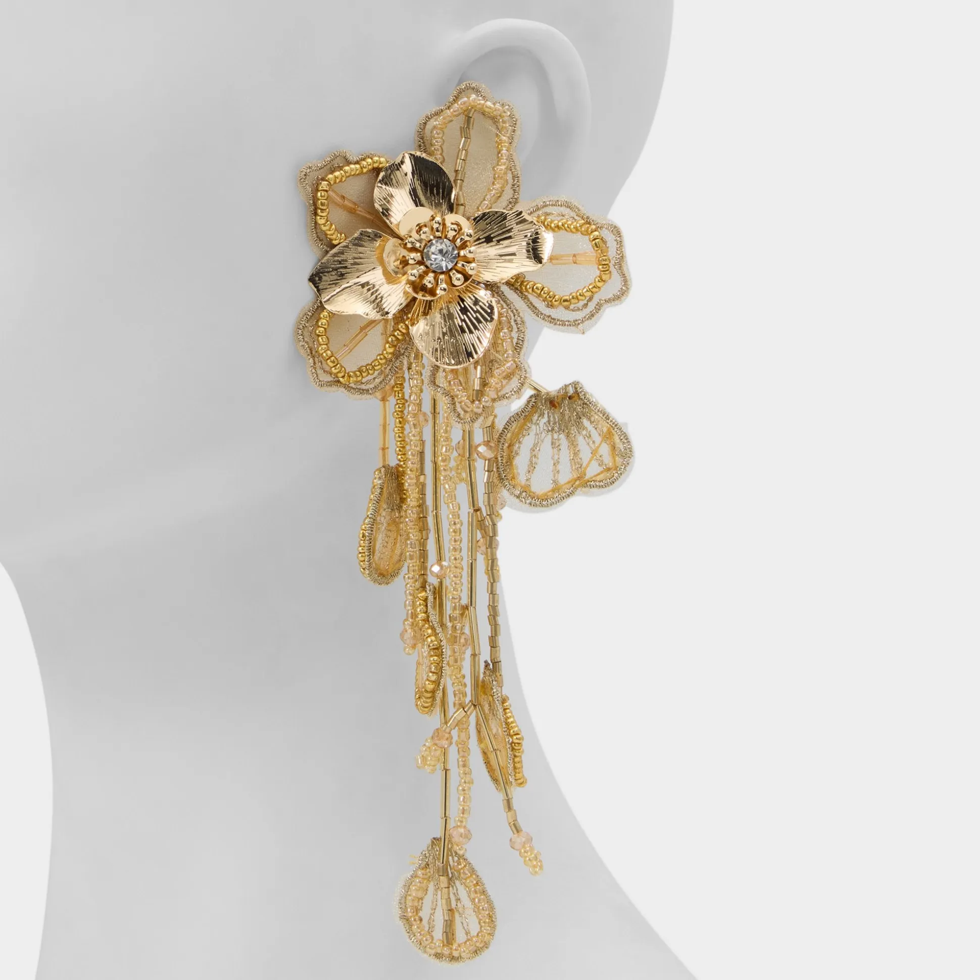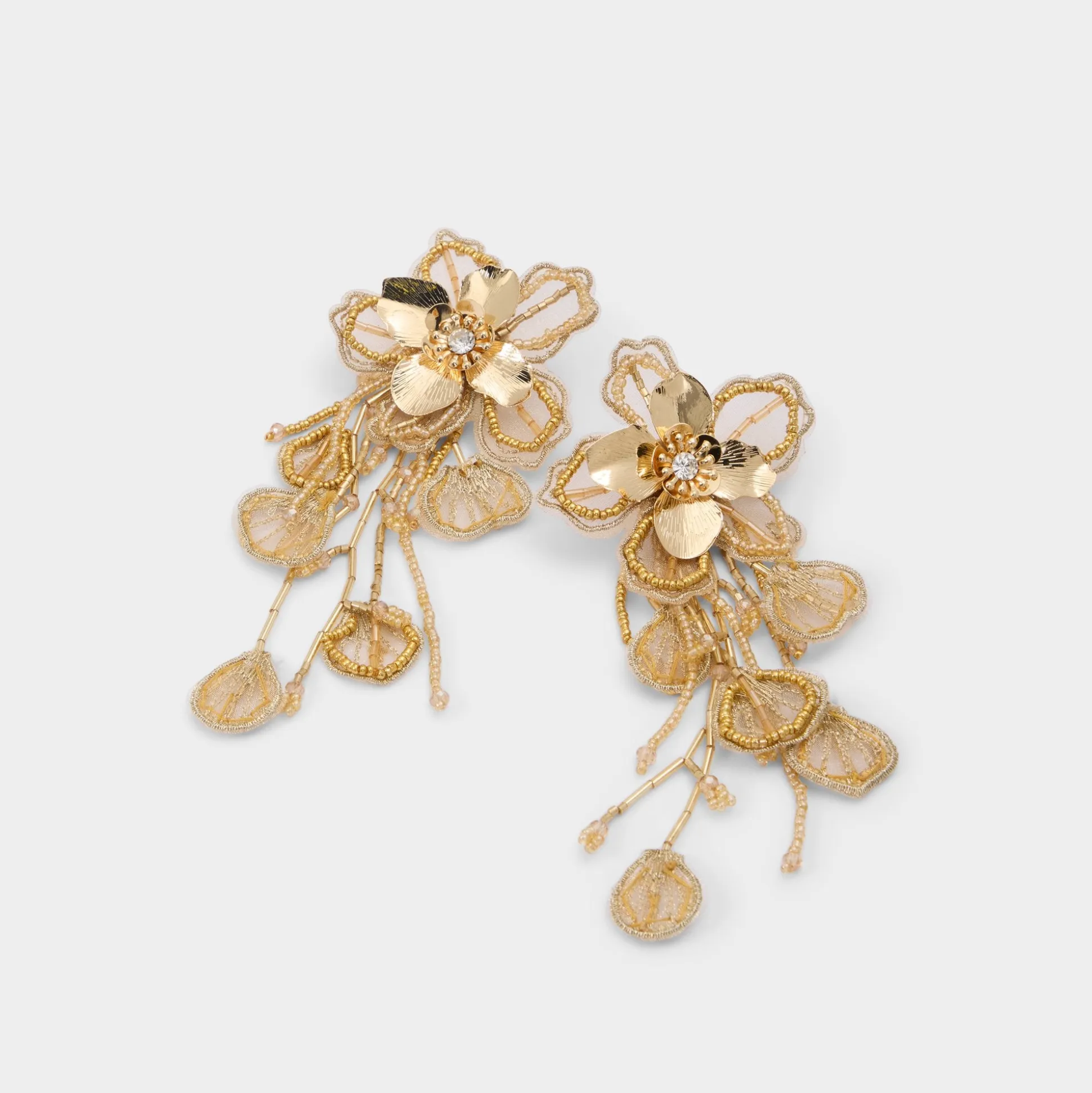 Cascading metal blossoms bloom into 3D petals edged with crystal-bright centers, turning earrings into shimmering corsages that catch every light with every move. Layer them with a chain for cocktails, or frame a slip with a blazer and jeans for daytime blooms.