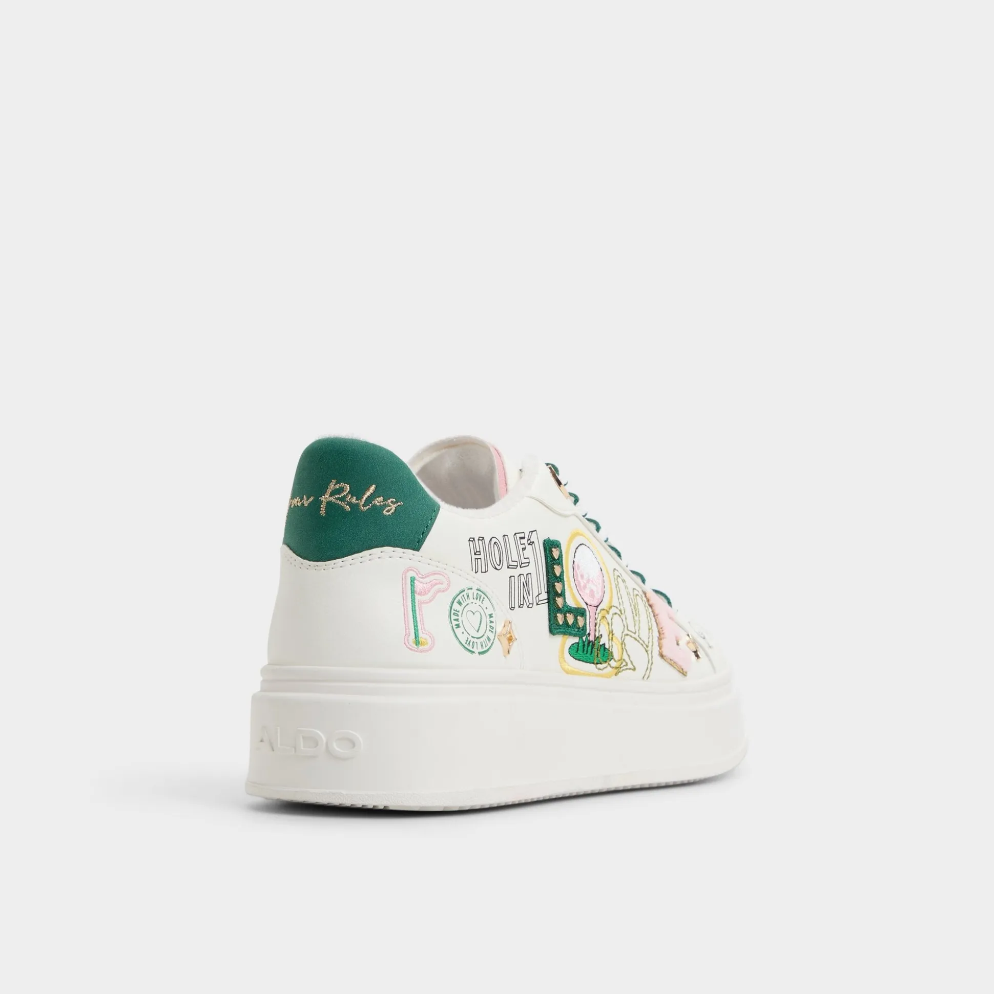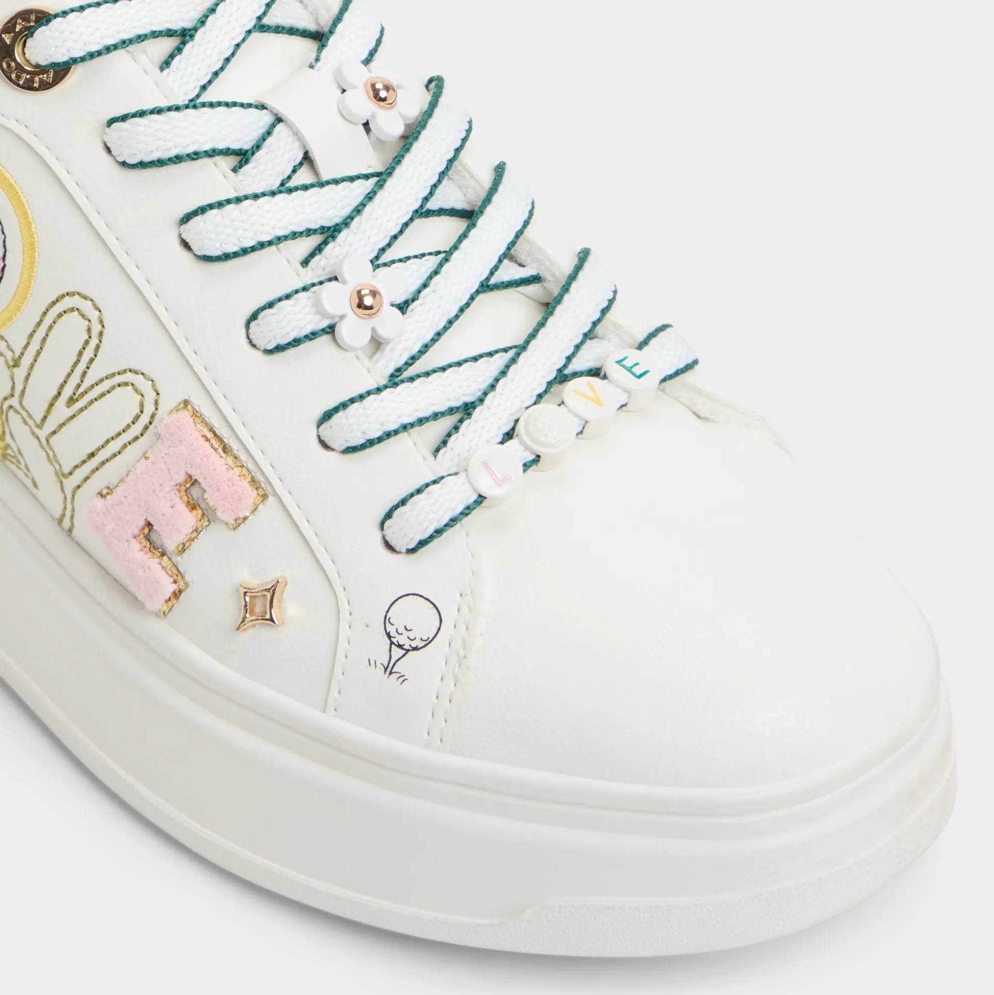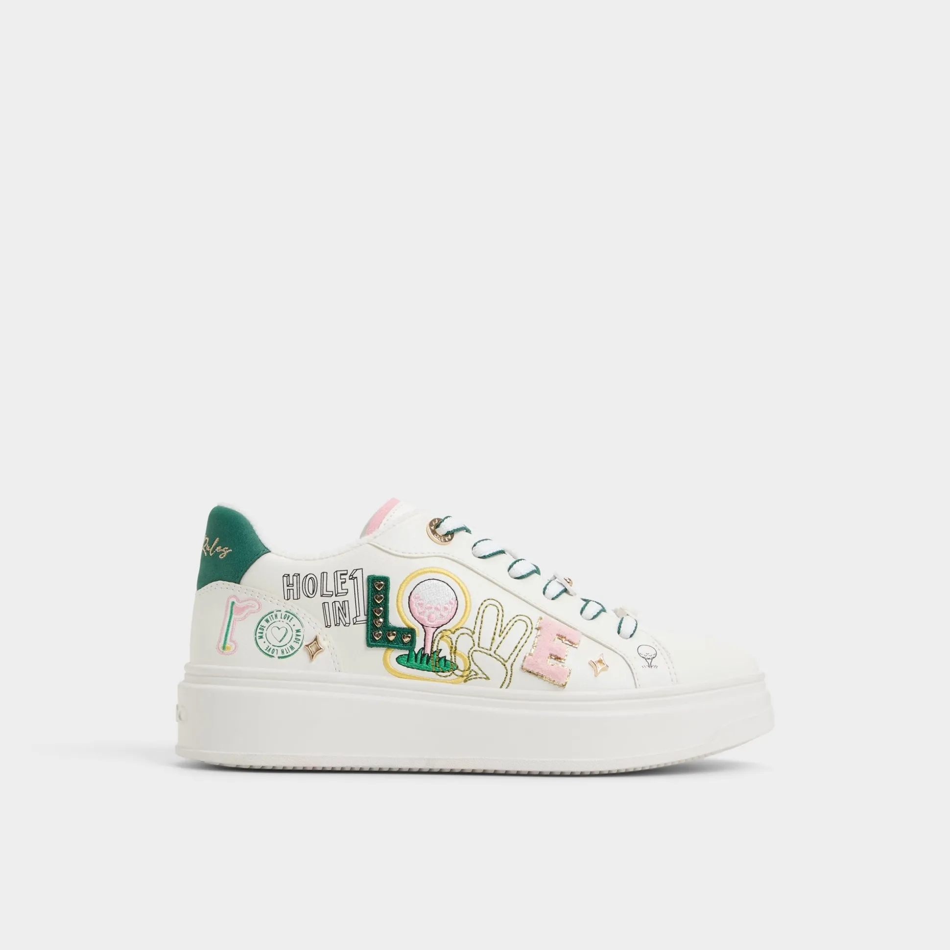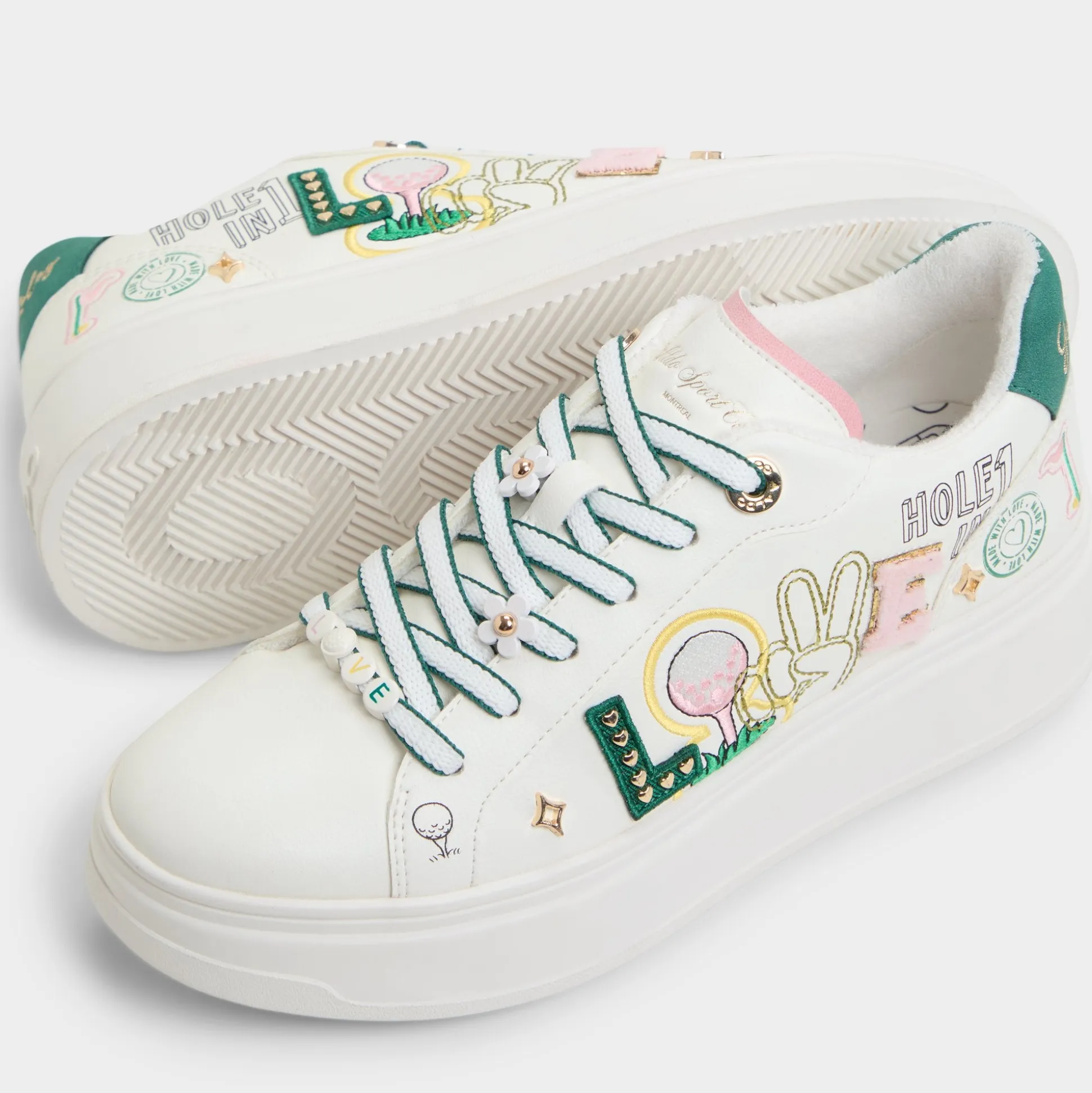 Graphic patches from glittery golf tees to peace signs play across smooth leather uppers, creating a statement finish, while a chunky sole and cushioned insole keep strides relaxed from desk to dance floor. Pair with cropped joggers for coffee crawls, or swap in a pleated mini for outdoor festivals.