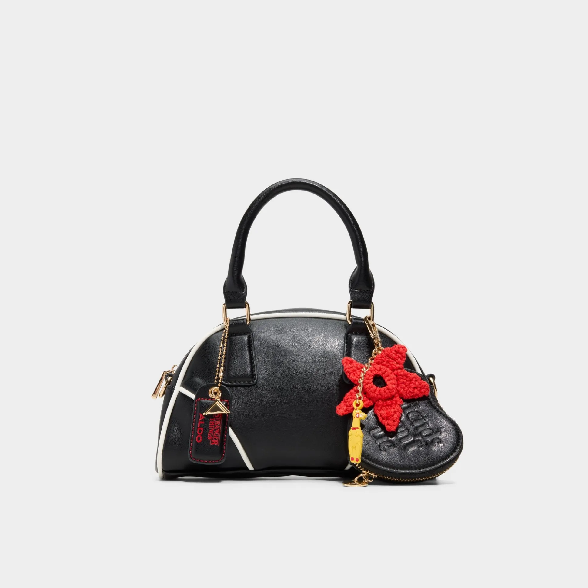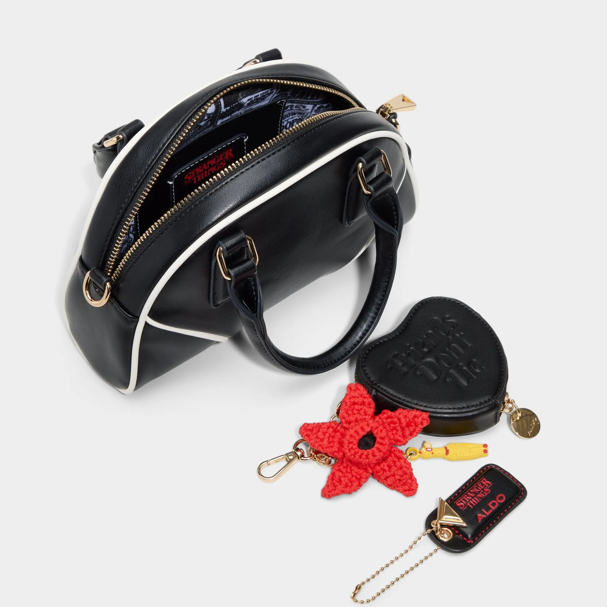 This Stranger Things x ALDO top-handle handbag features the iconic “Friends Don’t Lie” quote subtly embossed on its tone-on-tone exterior. Inside, the lining reveals a rad surprise, a graphic collage of all the iconic Hawkins hangouts where all friends are welcome.