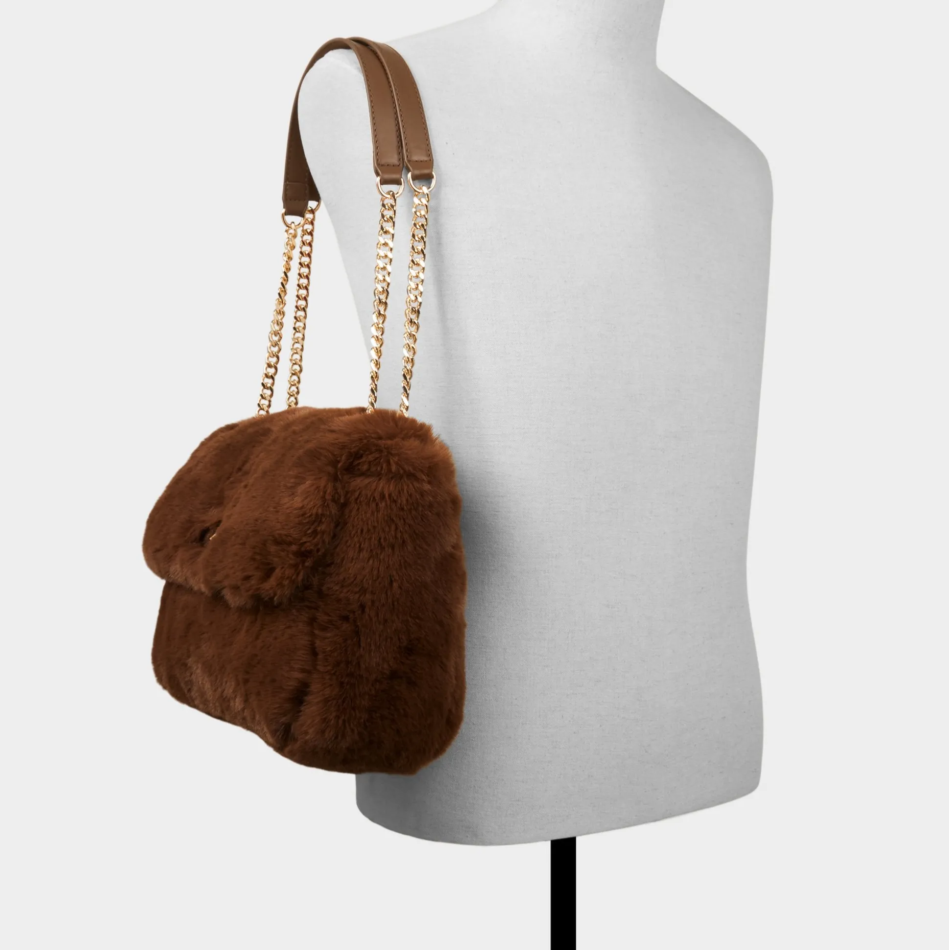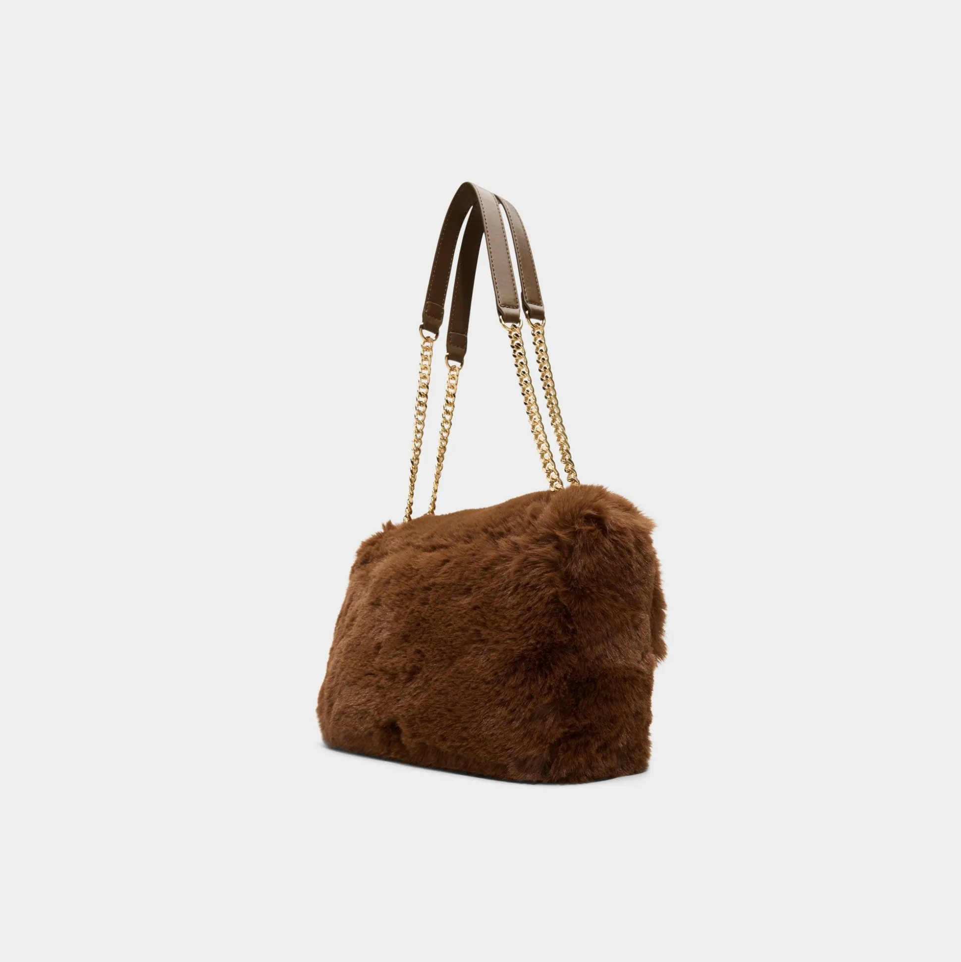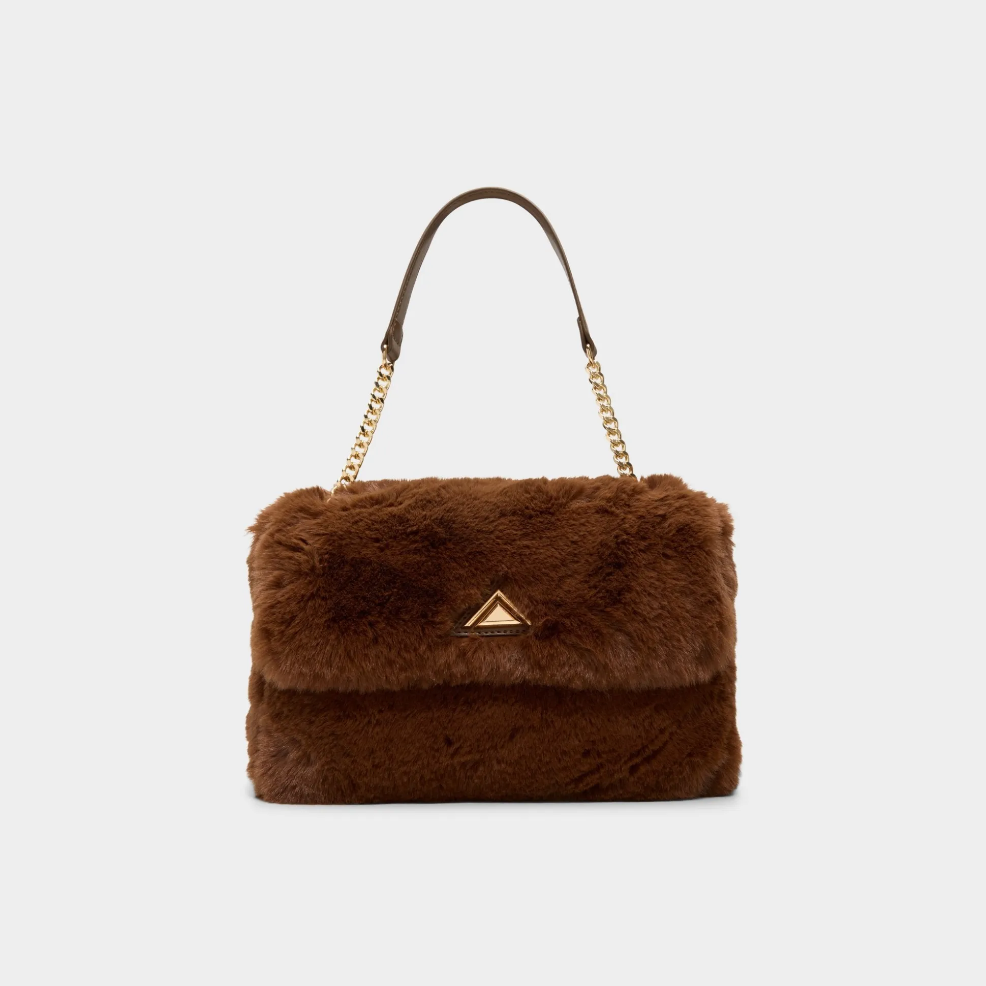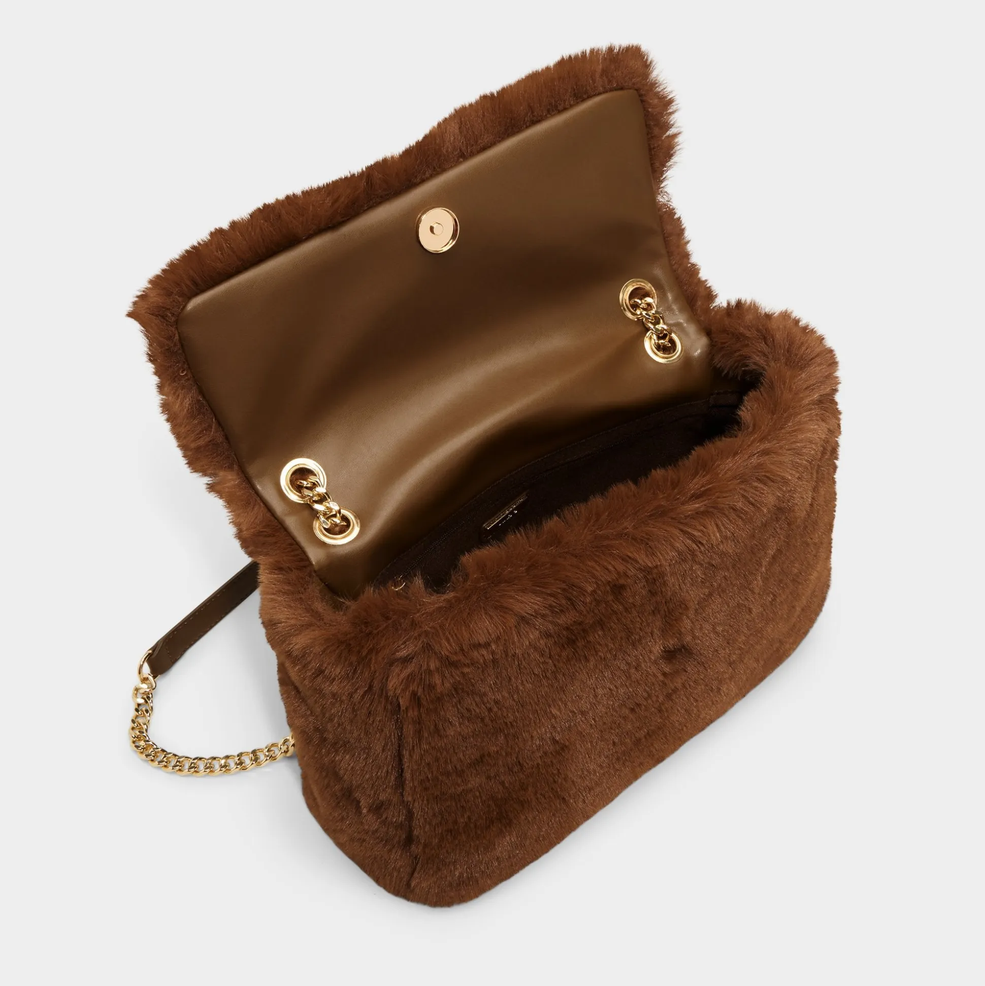 Plush mocha faux fur wraps this shoulder bag in instant warm-and-fuzzy glam, complemented by gleaming gold hardware and a leather-topped chain strap that keeps its flap silhouette polished yet easygoing on chilly nights. Sling over ribbed dresses for fireside cocktails or tuck against velvet blazers at holiday parties for touchably soft polish.