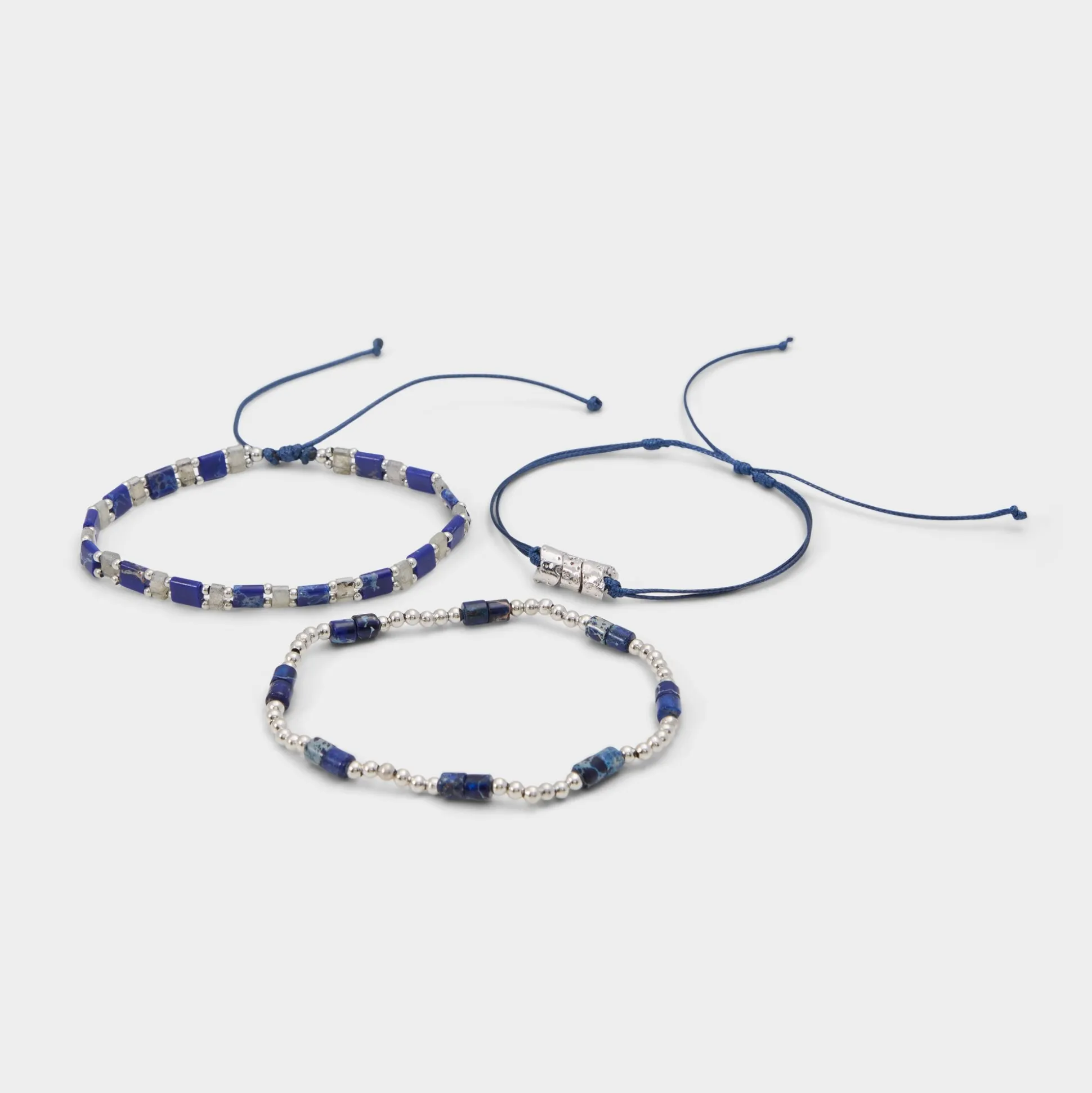 Cobalt-blue cubes and polished silver beads trade places across a trio of bracelets, already layered yet light, sliding to fit with easy drawstring ends for everyday stack appeal. Stack them against a rolled-sleeve blazer at coffee meetings or anchor a beachy maxi dress on sunset walks, lending relaxed polish each time.