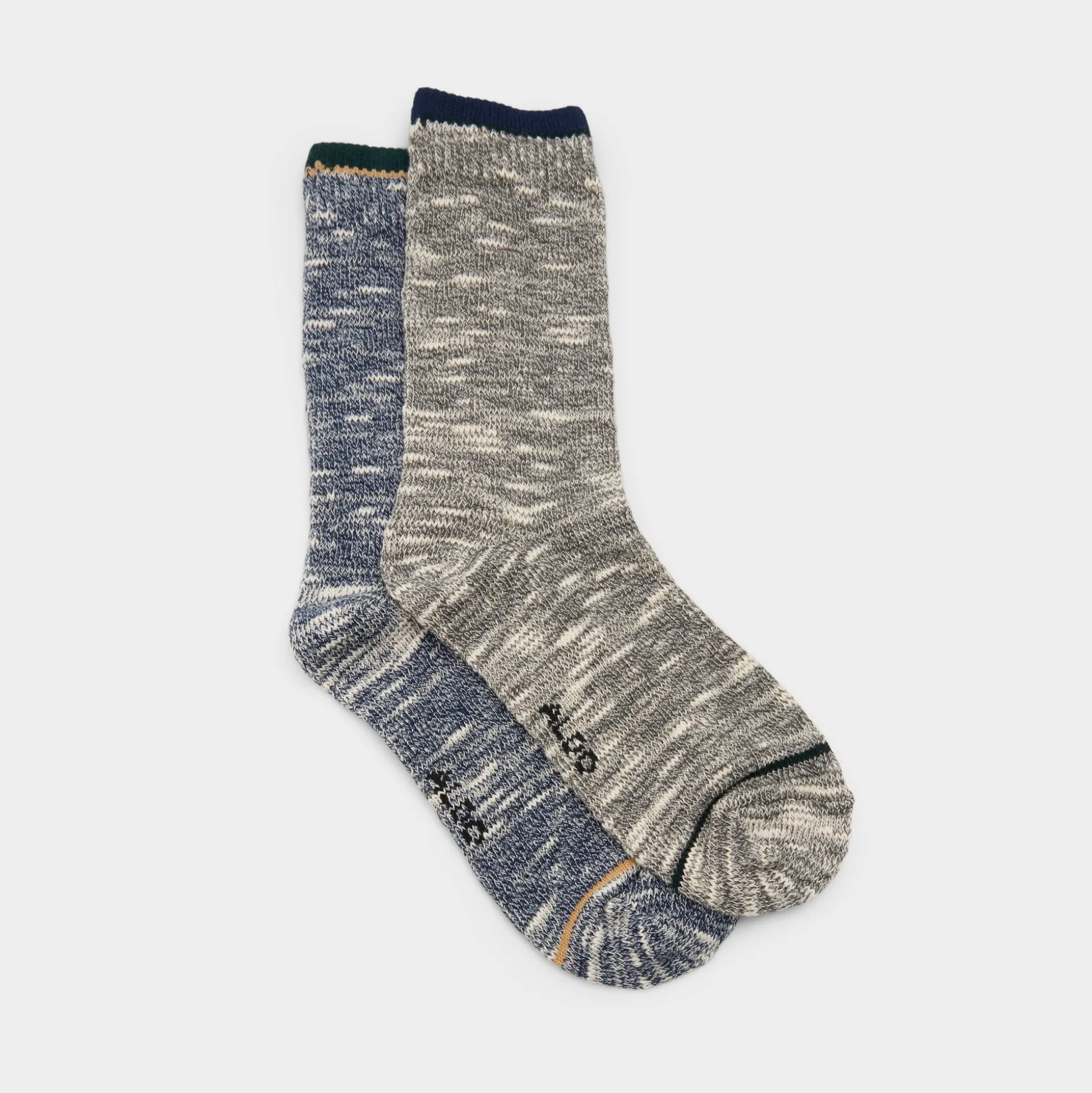 Marled cotton knit gives these crew socks a cozy, cabin-ready vibe, mixing grey and denim tones for effortless rotation and all-day comfort. Wear them with ankle boots on campus strolls or top lounge sweats during movie marathons for head-to-toe ease.