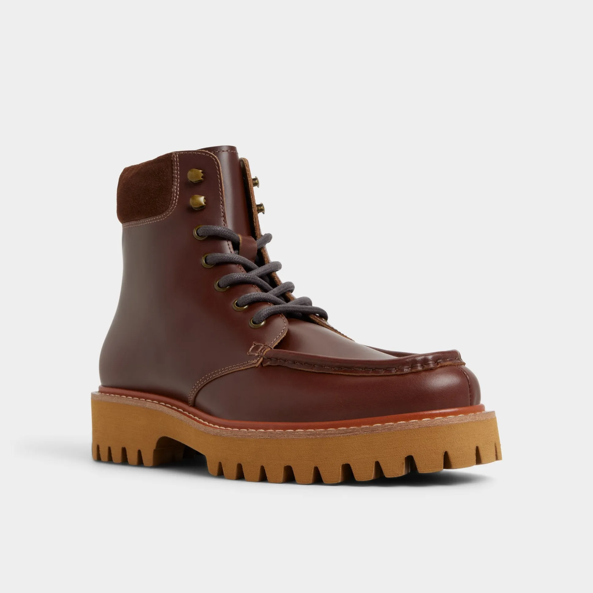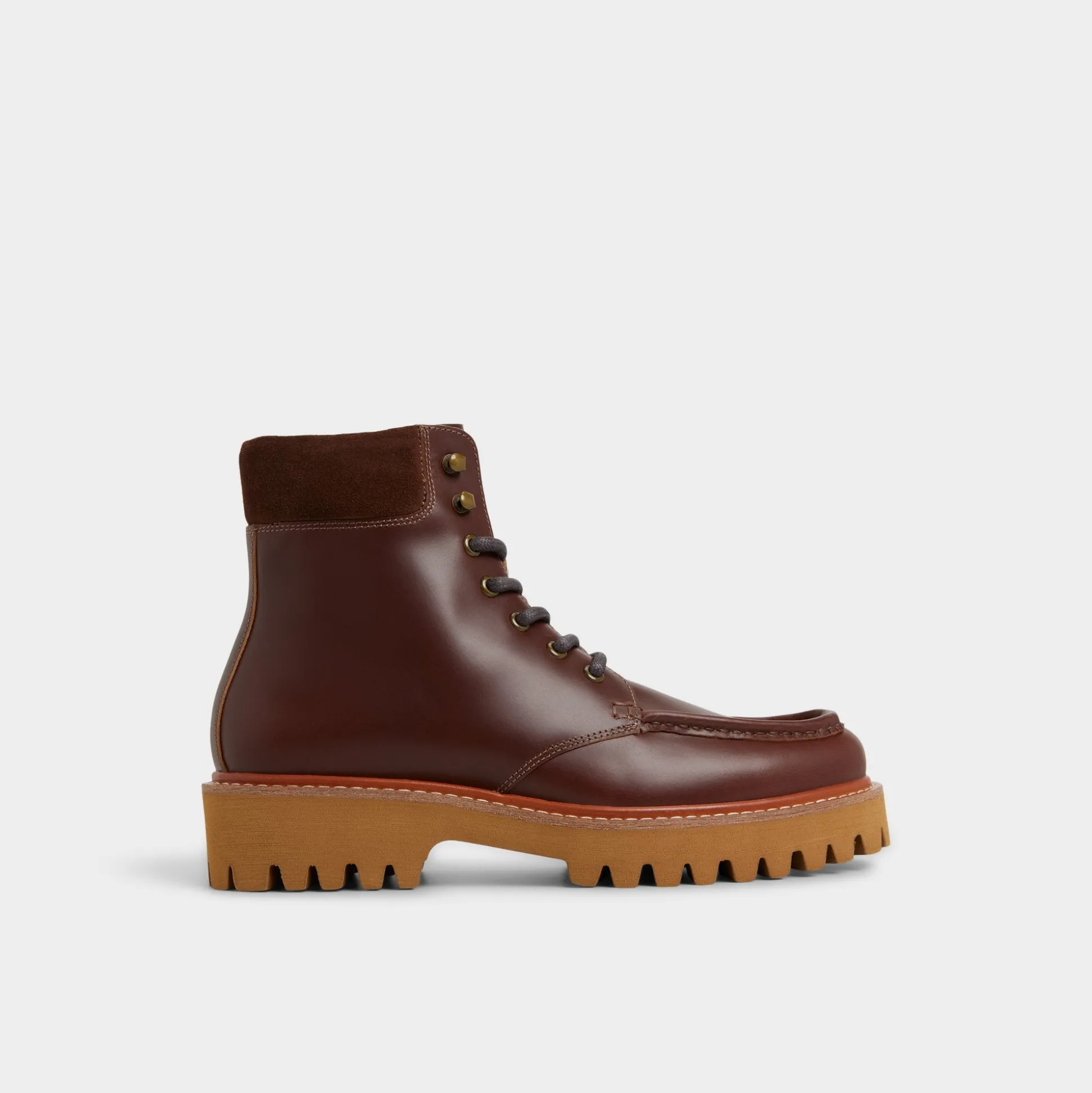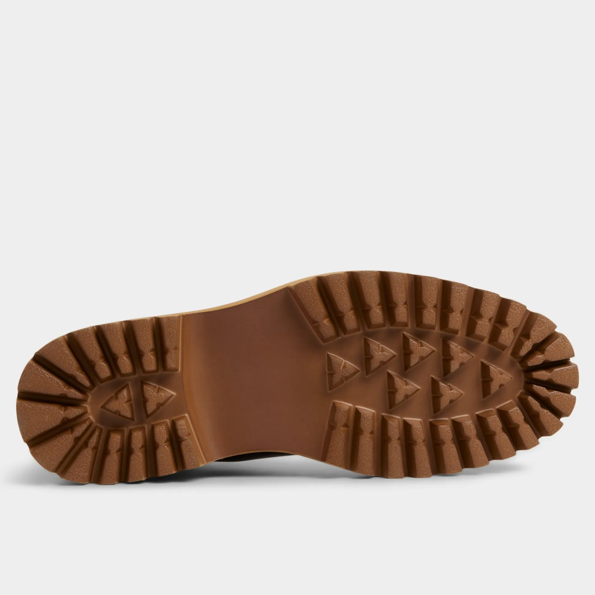 Chestnut leather meets a suede collar on this moc-toe boot, while the oversized gum lug sole grips city streets yet feels unexpectedly light, letting you roam from morning coffees to late-night plans without slowing down. Anchor cuffed selvedge denim for brunch rides or sharpen corduroy trousers on casual-office Fridays-the rugged edge reads confident, not try-hard.
