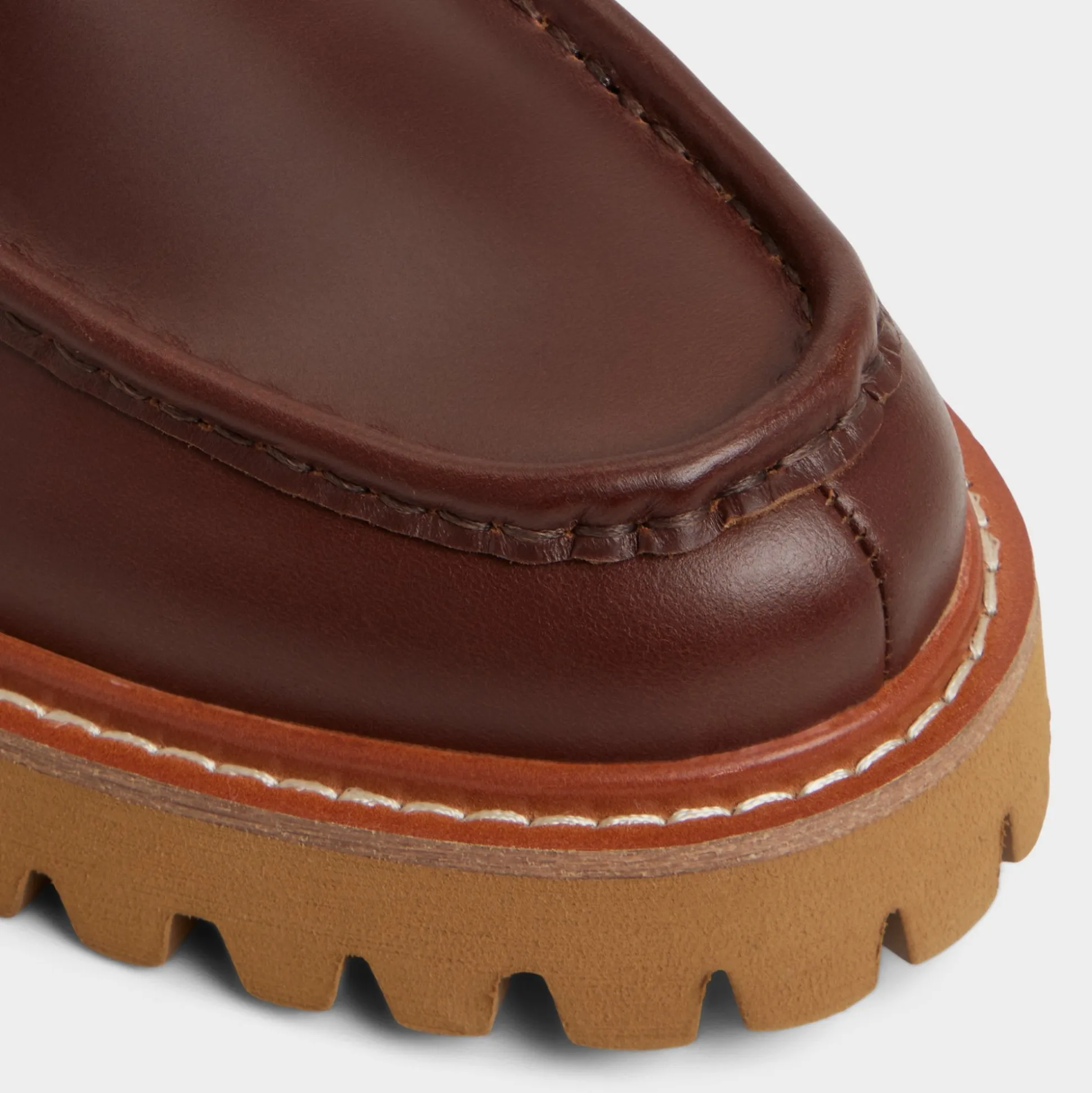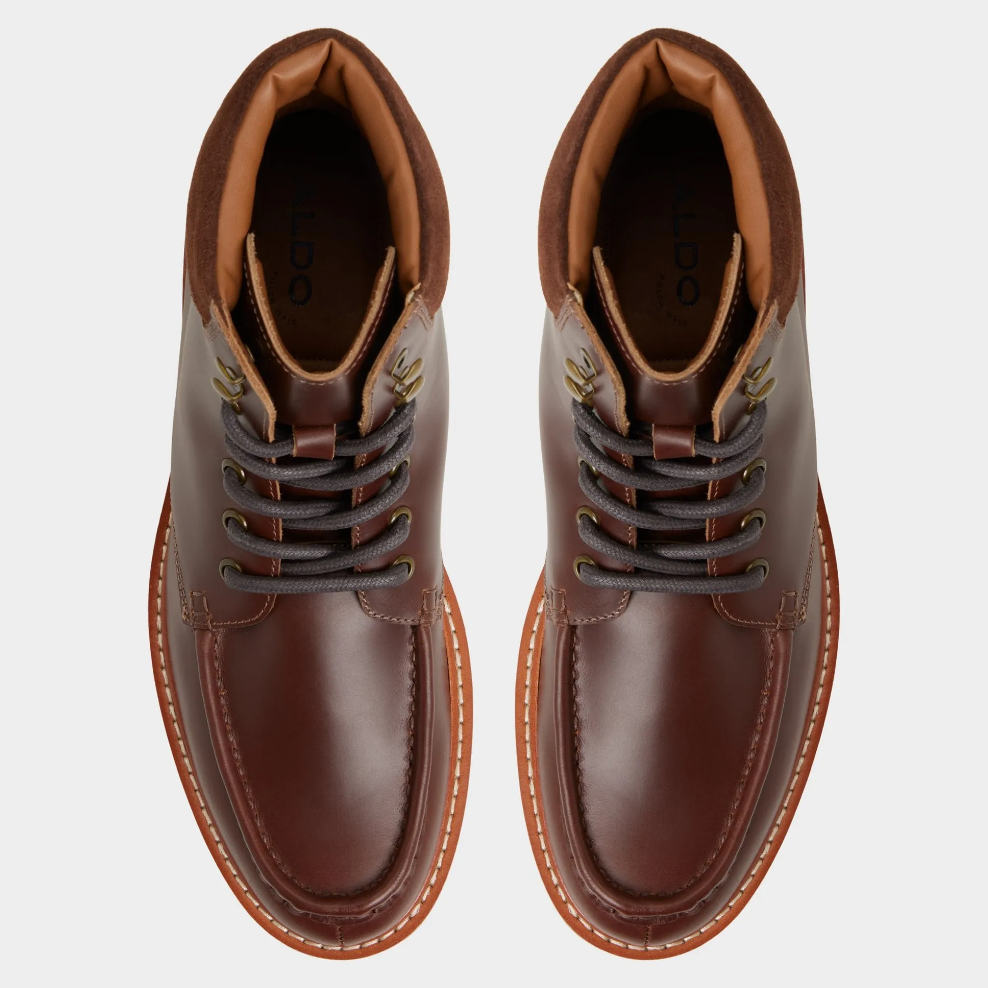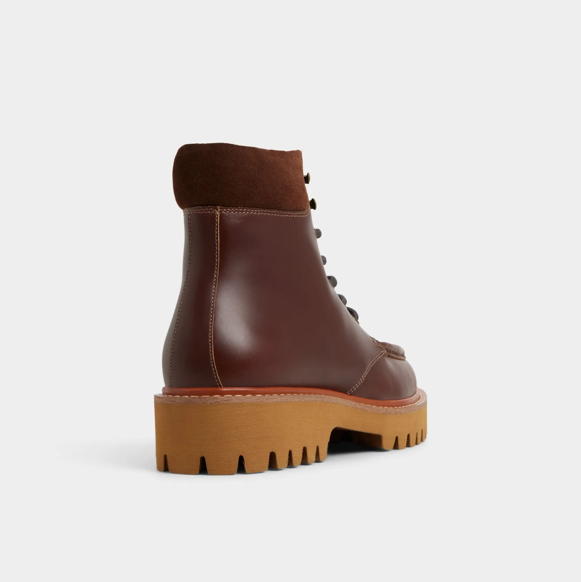 Chestnut leather meets a suede collar on this moc-toe boot, while the oversized gum lug sole grips city streets yet feels unexpectedly light, letting you roam from morning coffees to late-night plans without slowing down. Anchor cuffed selvedge denim for brunch rides or sharpen corduroy trousers on casual-office Fridays-the rugged edge reads confident, not try-hard.