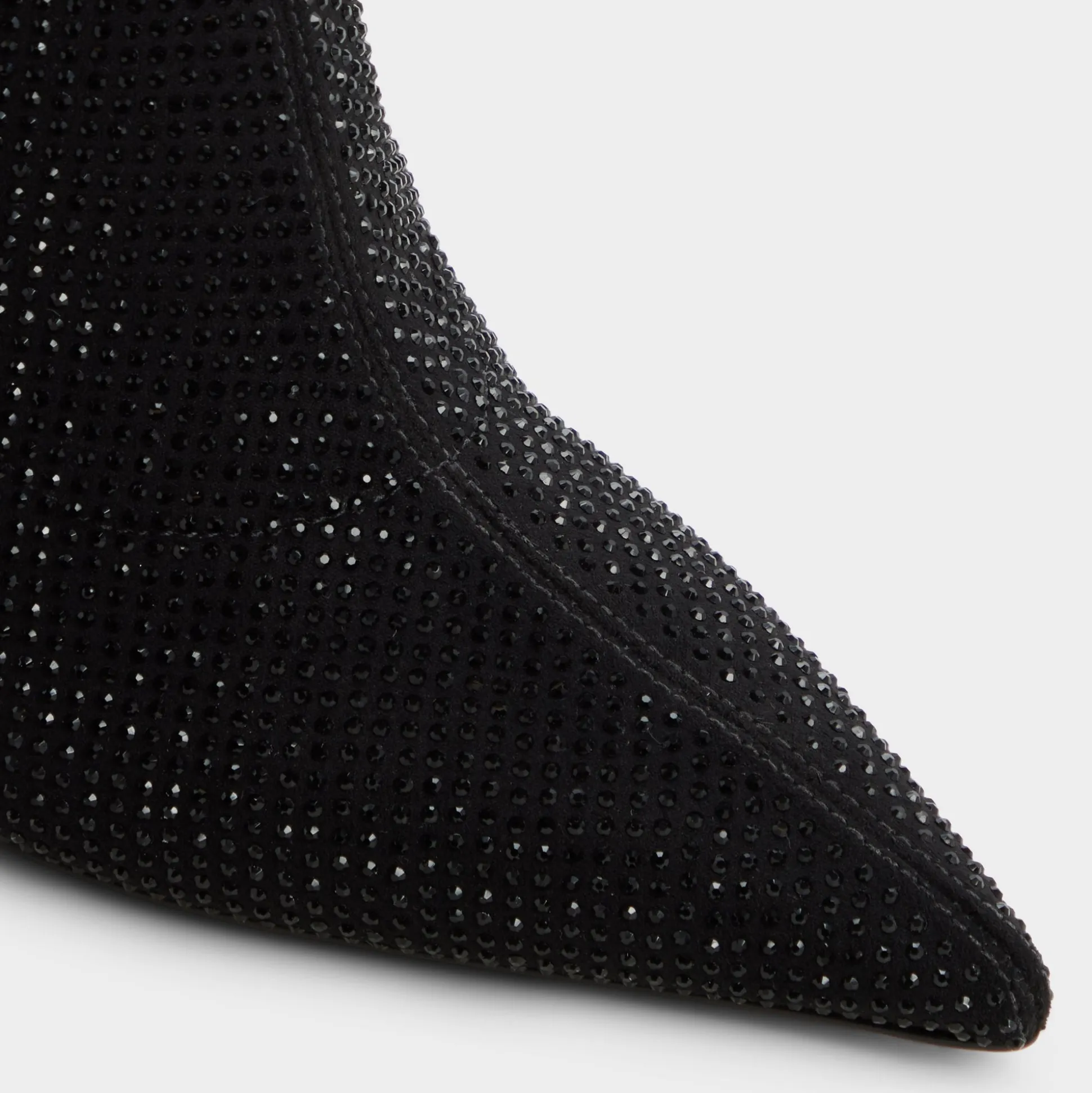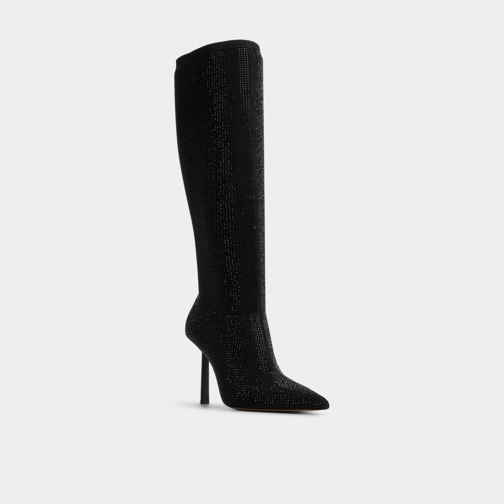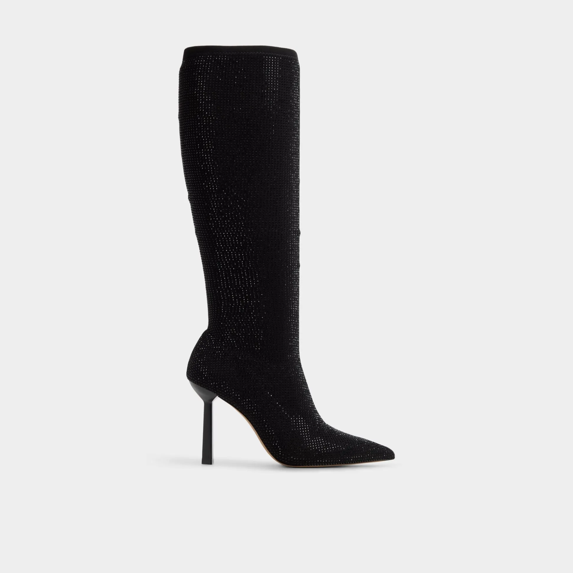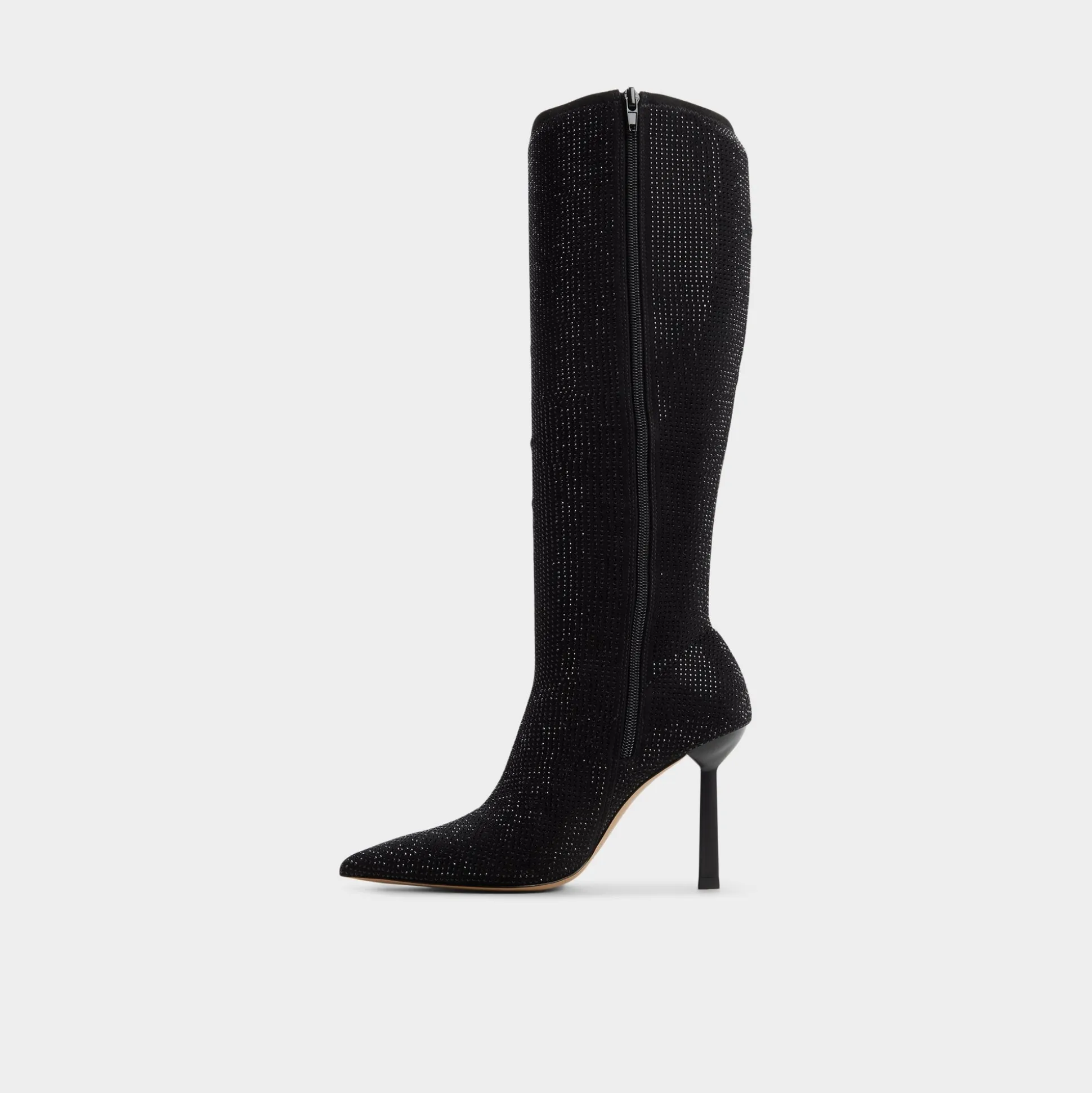 Jet-black micro crystals cloak this knee-high boot’s sleek shaft and stiletto, turning every step into a walking light show that boosts confidence after last call and keeps you gliding through the night with effortless poise. Pair with velvet mini at parties, or layer over jeans when dinners stretch into dance floors.